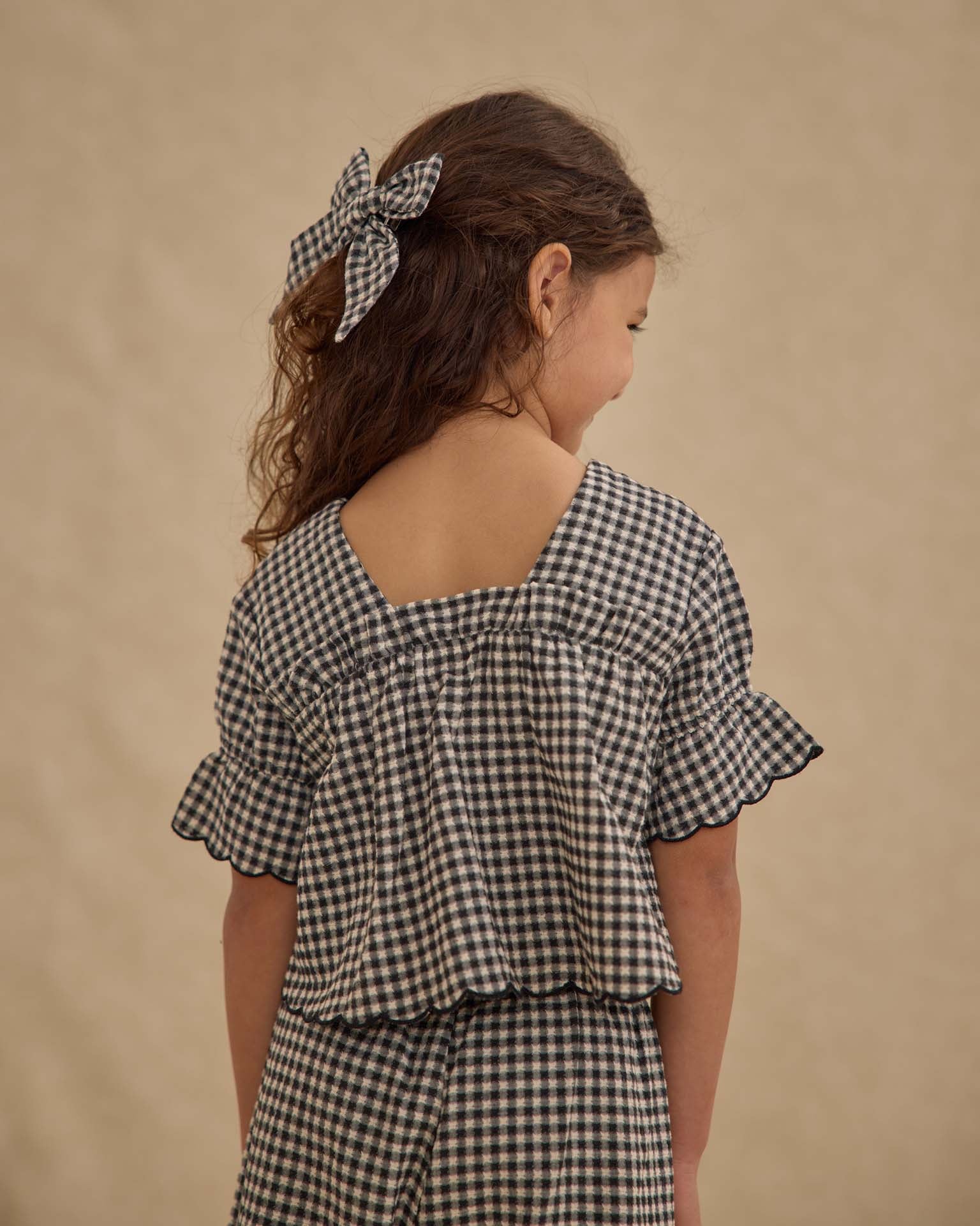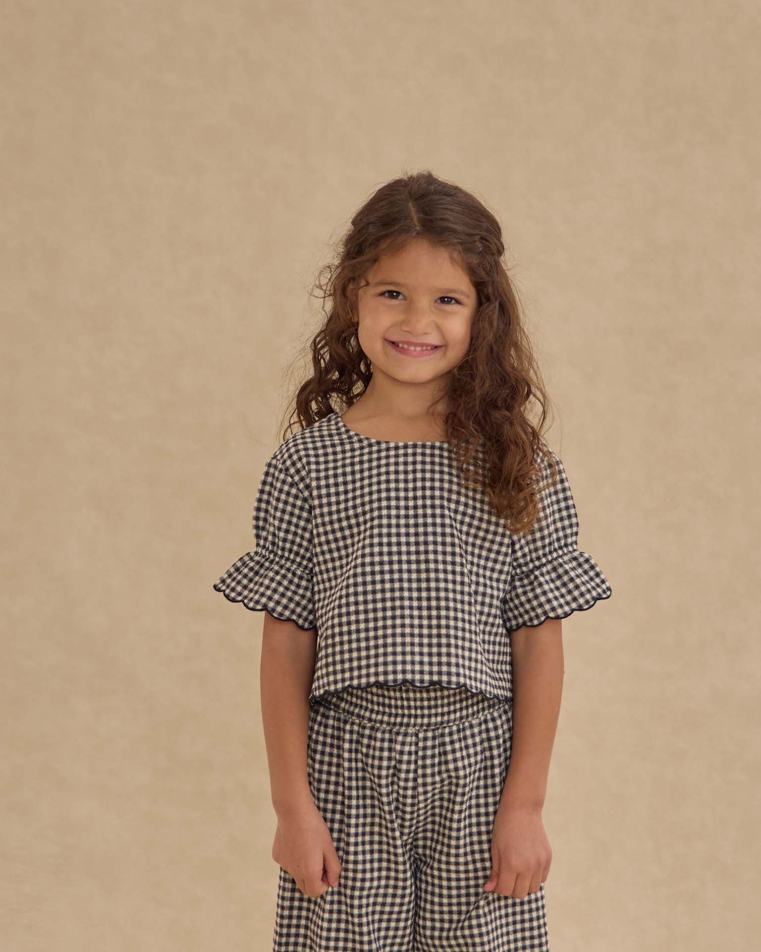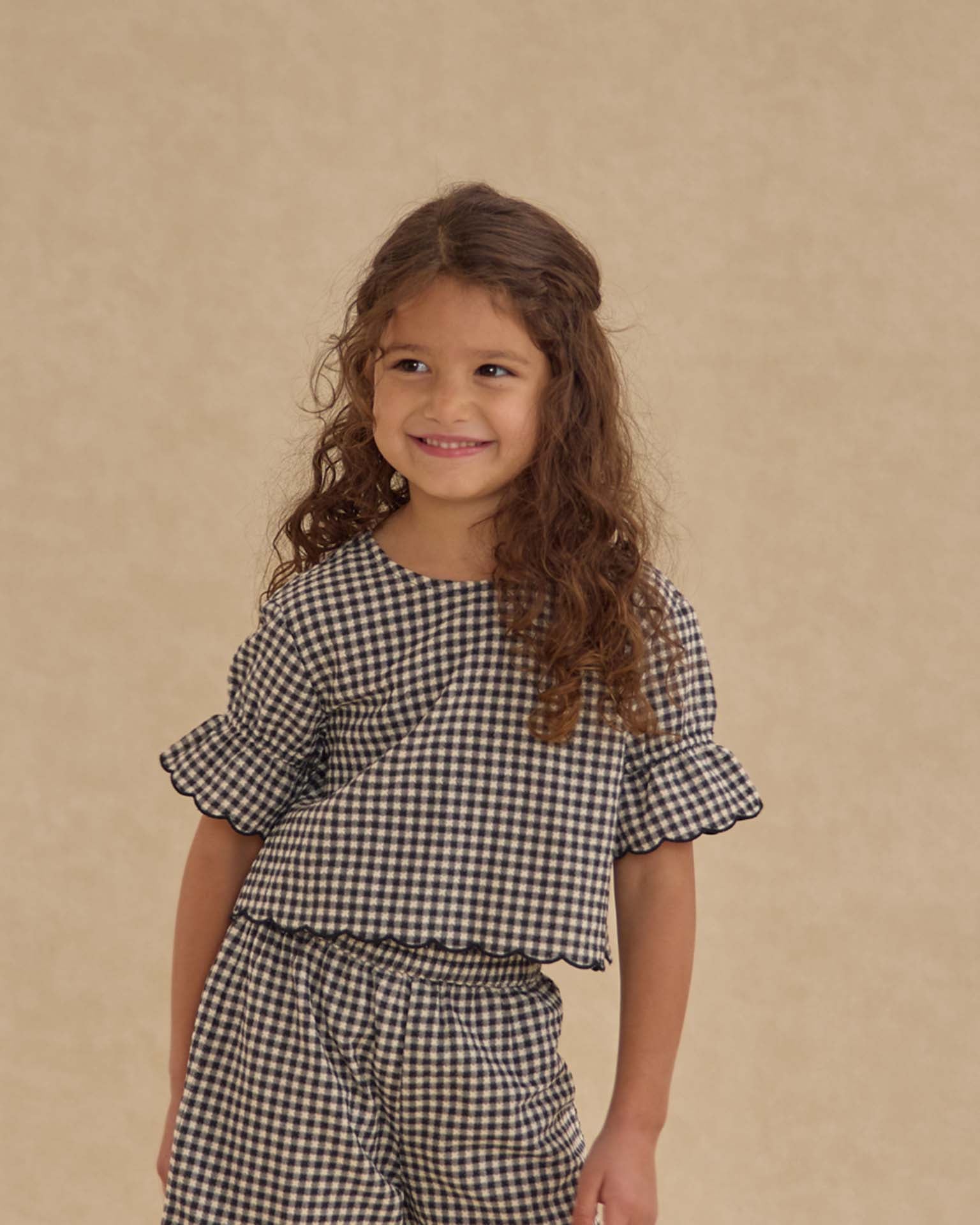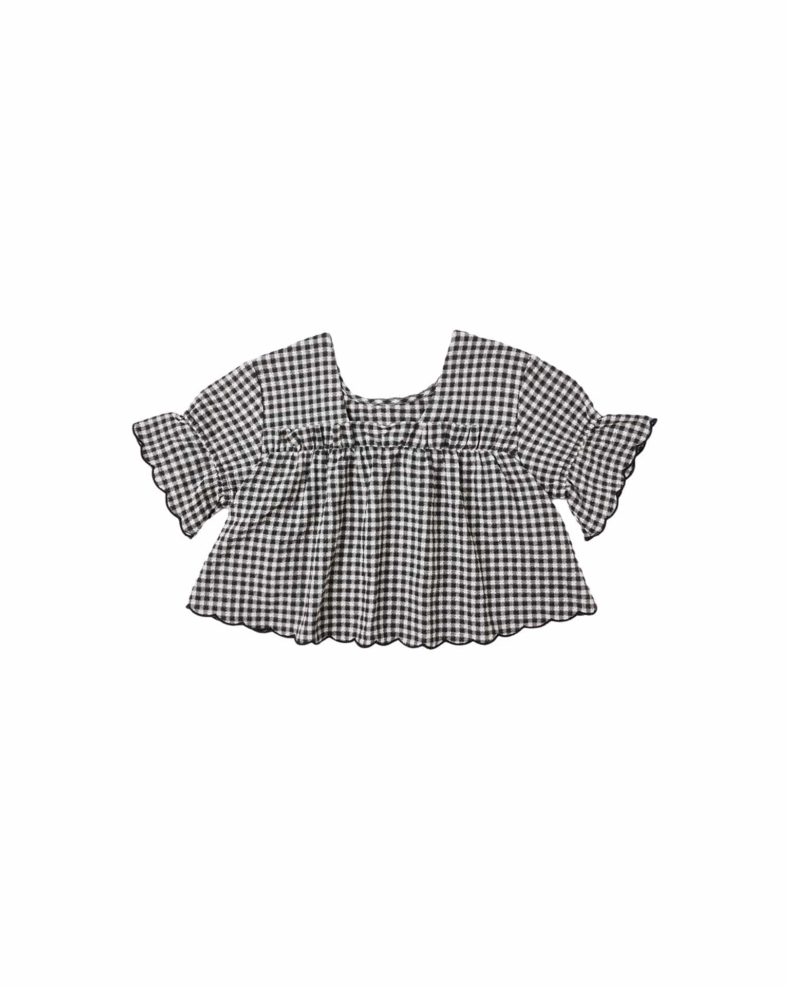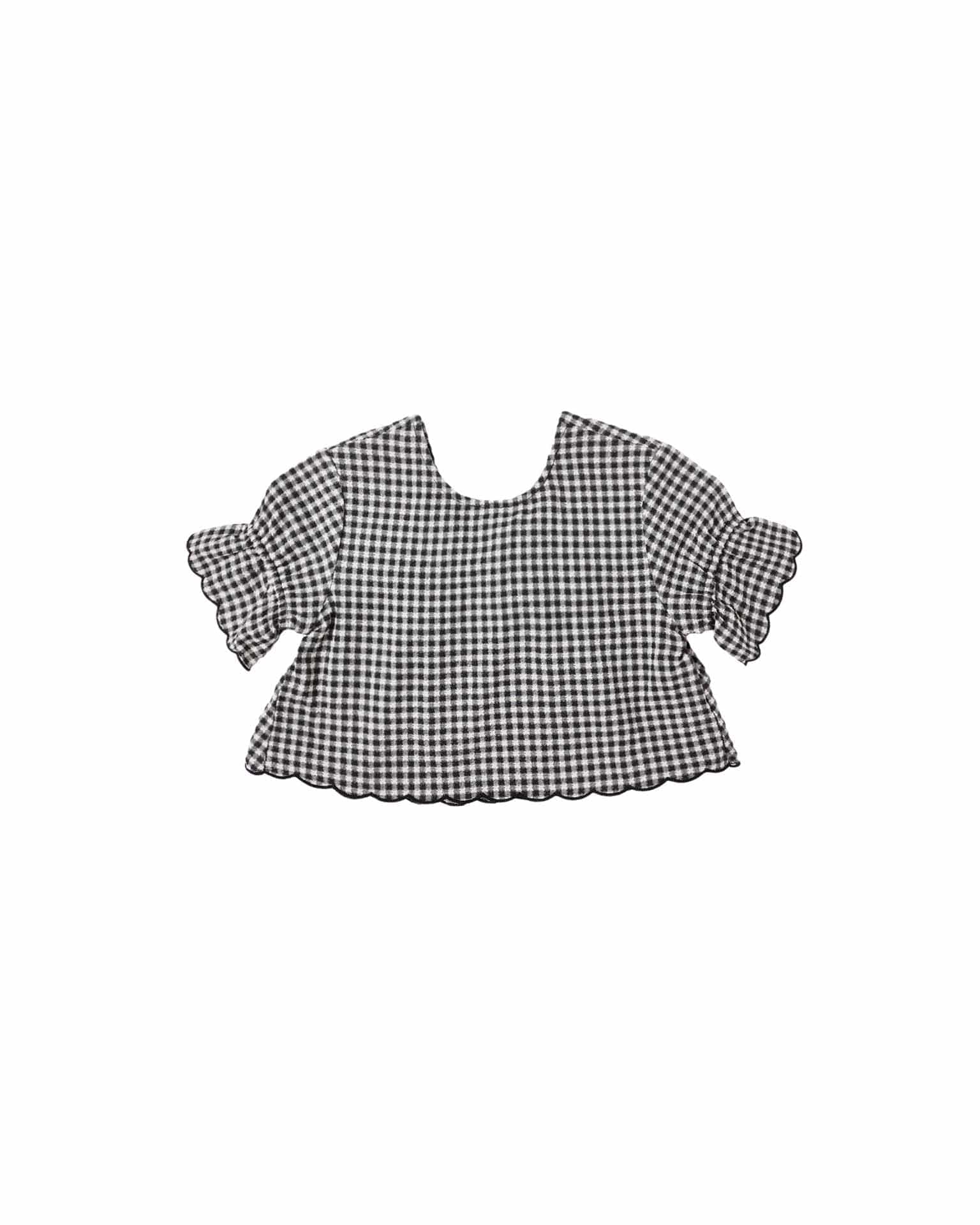 With a cropped fit, open back accented by ruffle trim, and scalloped hem, our Francie Blouse brings feminine details to everyday style.