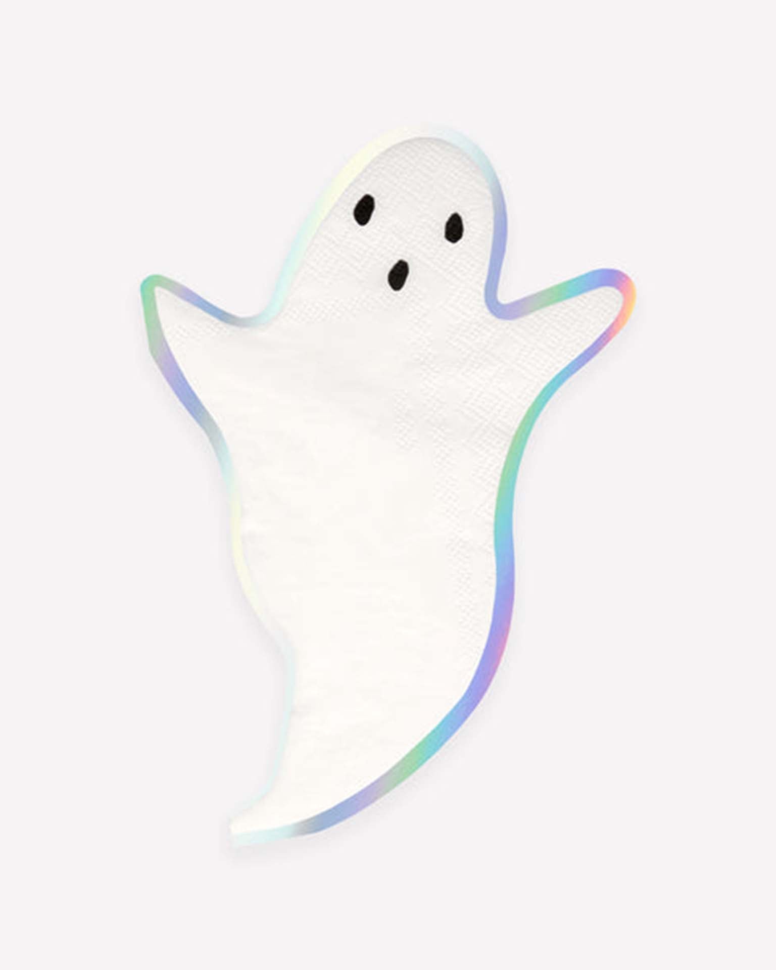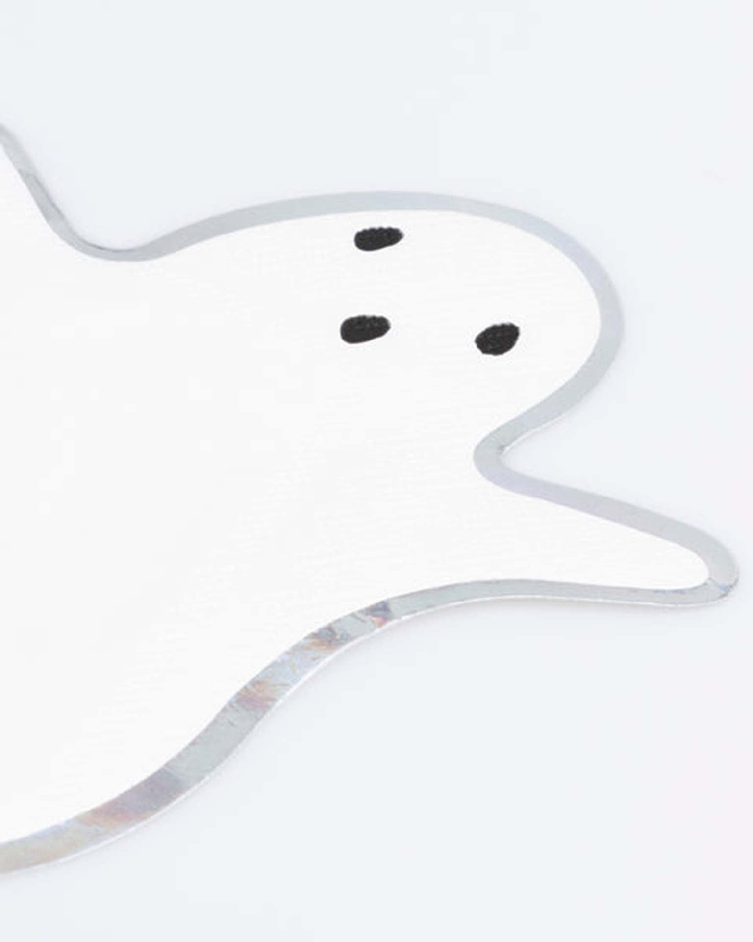 Boo! Elevate your Halloween party with our ghost-shaped paper napkins. Designed with a classic floaty ghost silhouette and a dazzling silver holographic foil border, they create a hauntingly cool effect. Perfect for kid-friendly gatherings or creepy cocktail parties.