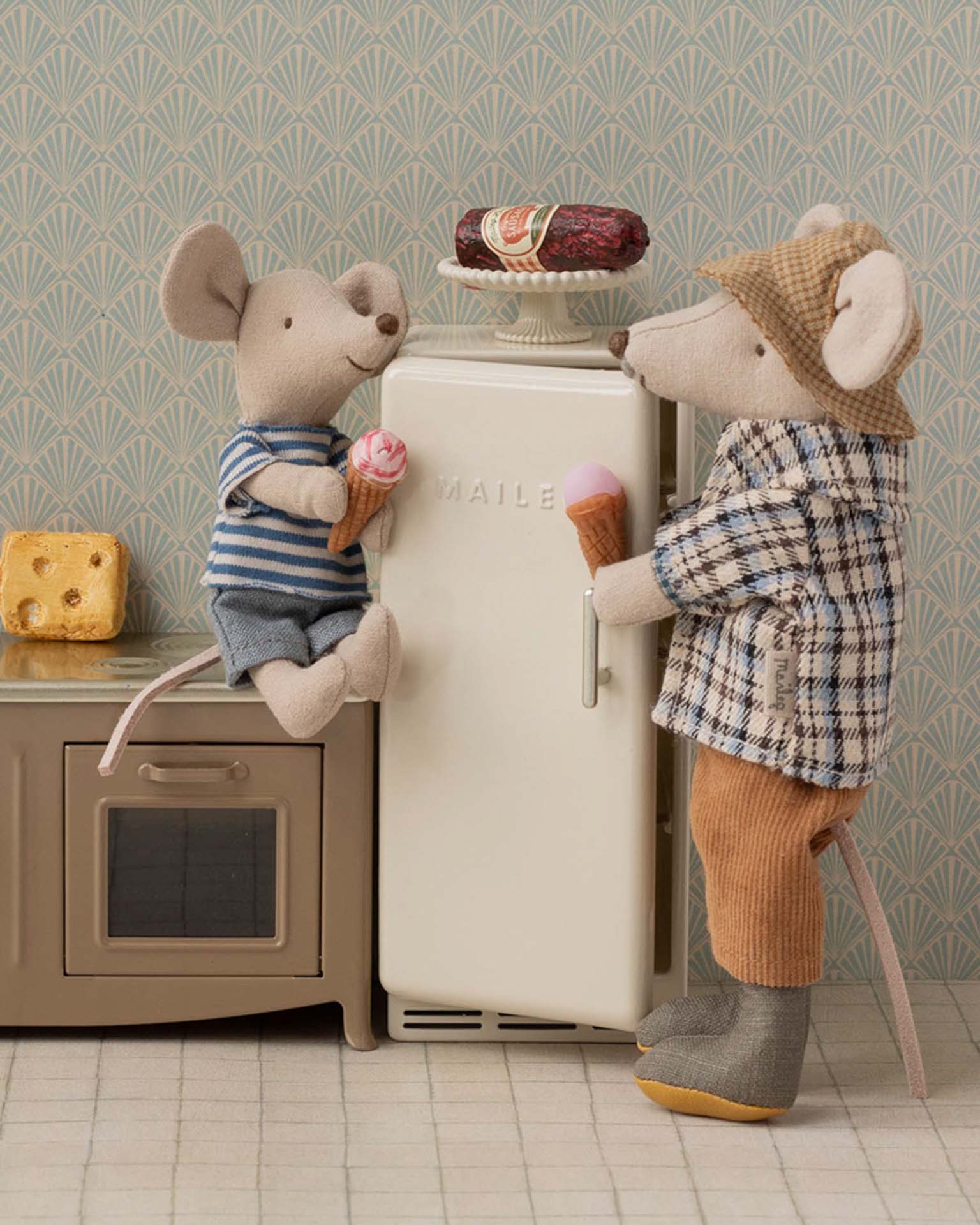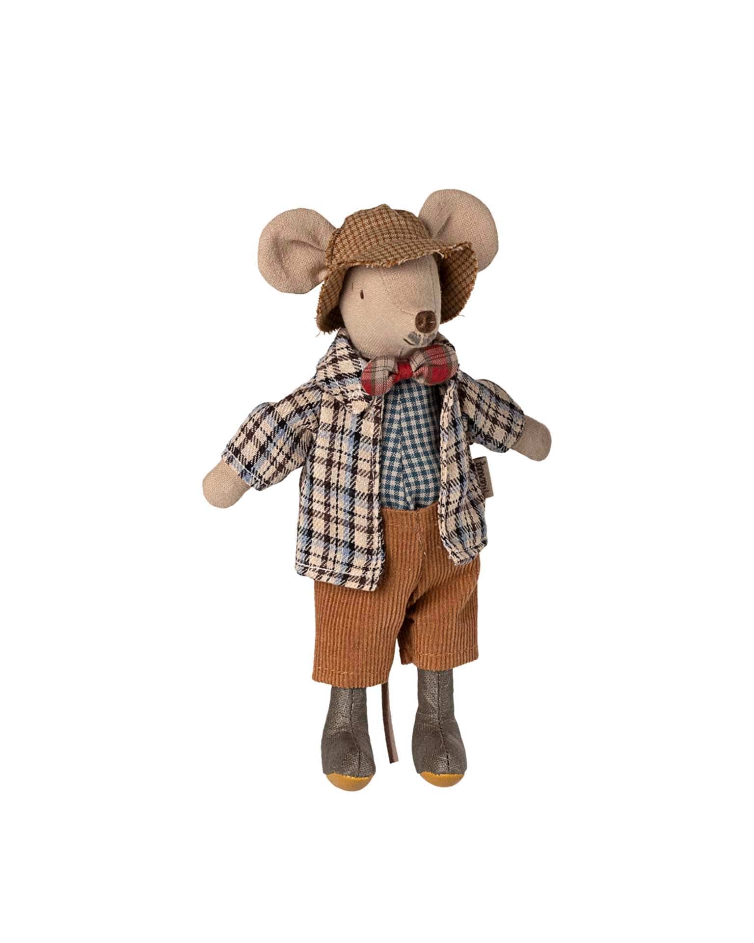 The granddad looks both wise and nice - he wears rubberboots, butterfly, pants and jacket and is always ready to cheer you up with all his many stories. The mouse has magnets in its hands.