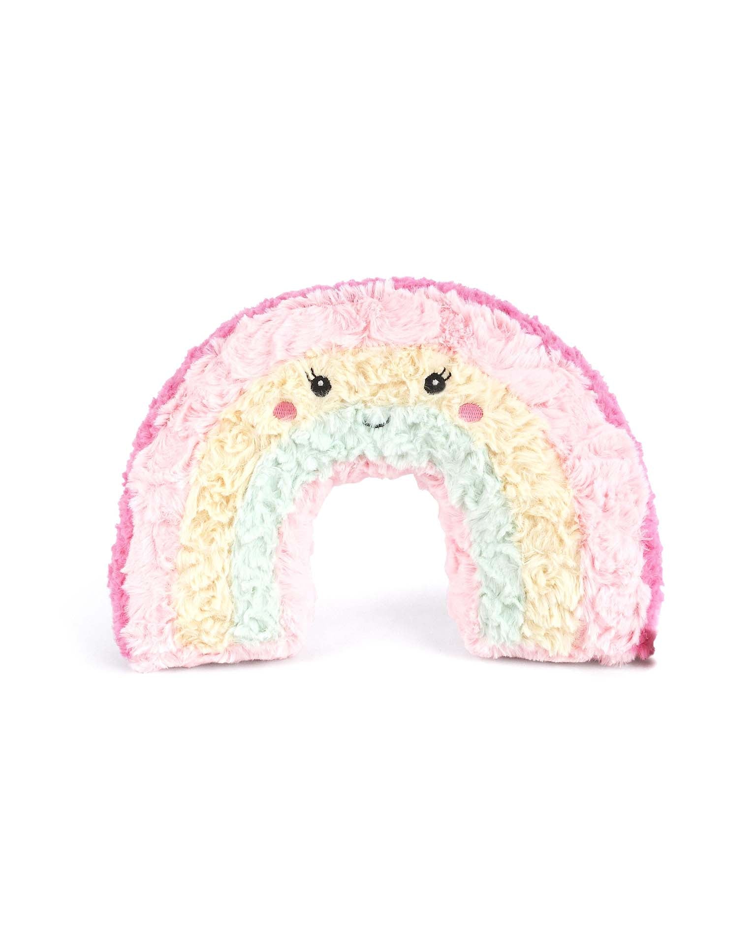 A rainbow of possibilities await! Mon Ami's Happy Rainbow Plush Toy brings loads of cheer to a child's room or playroom with its vibrant waves of color and happy embroidered face. Textured faux fur adds a tactile element that curious little hands will love while the squeezable shape puts a quirky spin on the typical plush toy.
