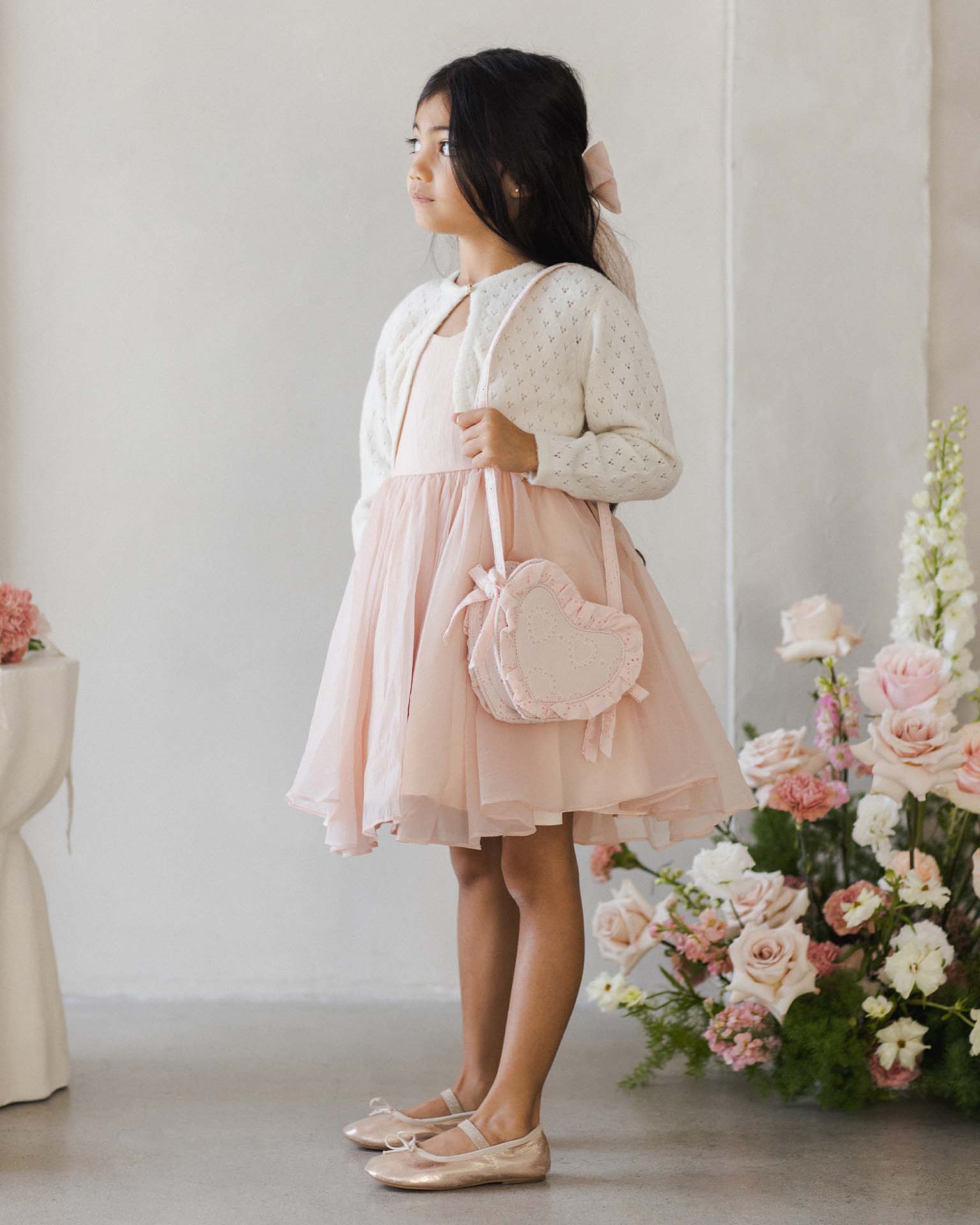 Our darling Heart Purse is sure to be a go-to accessory for your little ladies. With pretty bows on each side, and an easy zip top, available in our heart eyelet fabric.