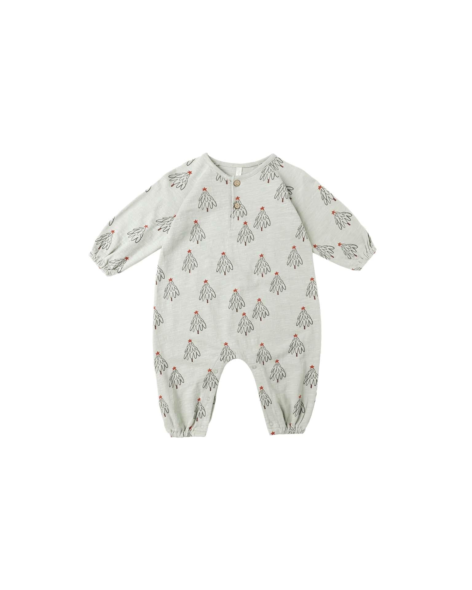 Our Henley Jumpsuit features a bubble silhouette with elasticized wrist and ankle openings, a two-button front placket, and bottom snaps for easy changes.