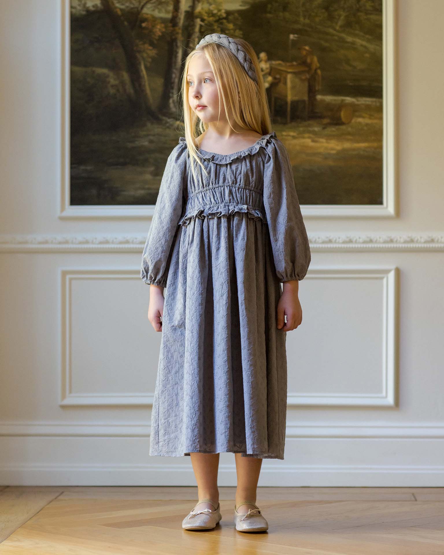 Our embroidered cotton Junie Dress features mid-length sleeves and a full skirt with an invisible back zipper. An elastic gathered bodice ensures a comfortable fit, while scalloped gathered ruffles along the neckline and a peplum waist add delicate, charming details. Coordinating bloomers included with size 2Y.