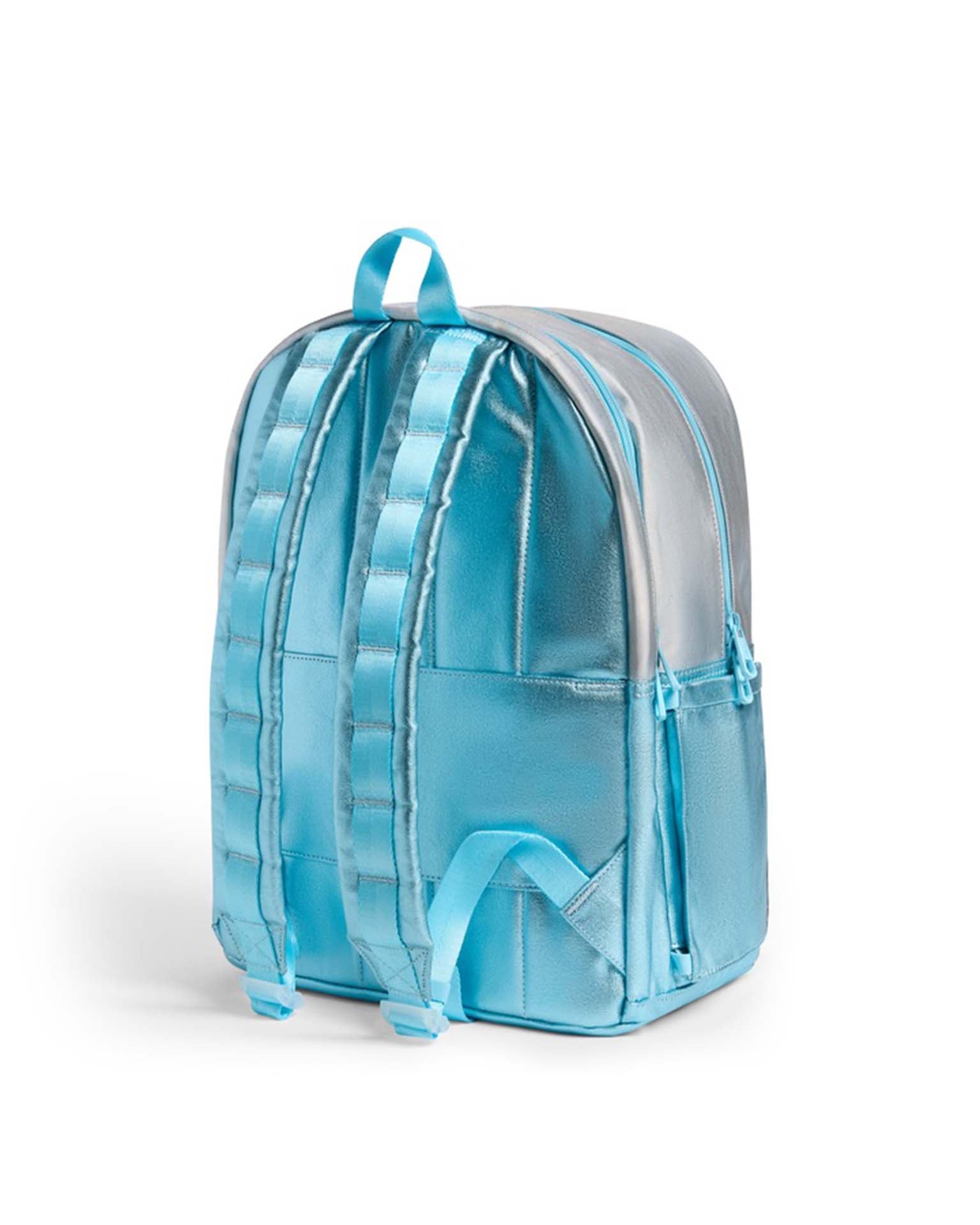 kane kids double pocket backpack in blue iridescent
