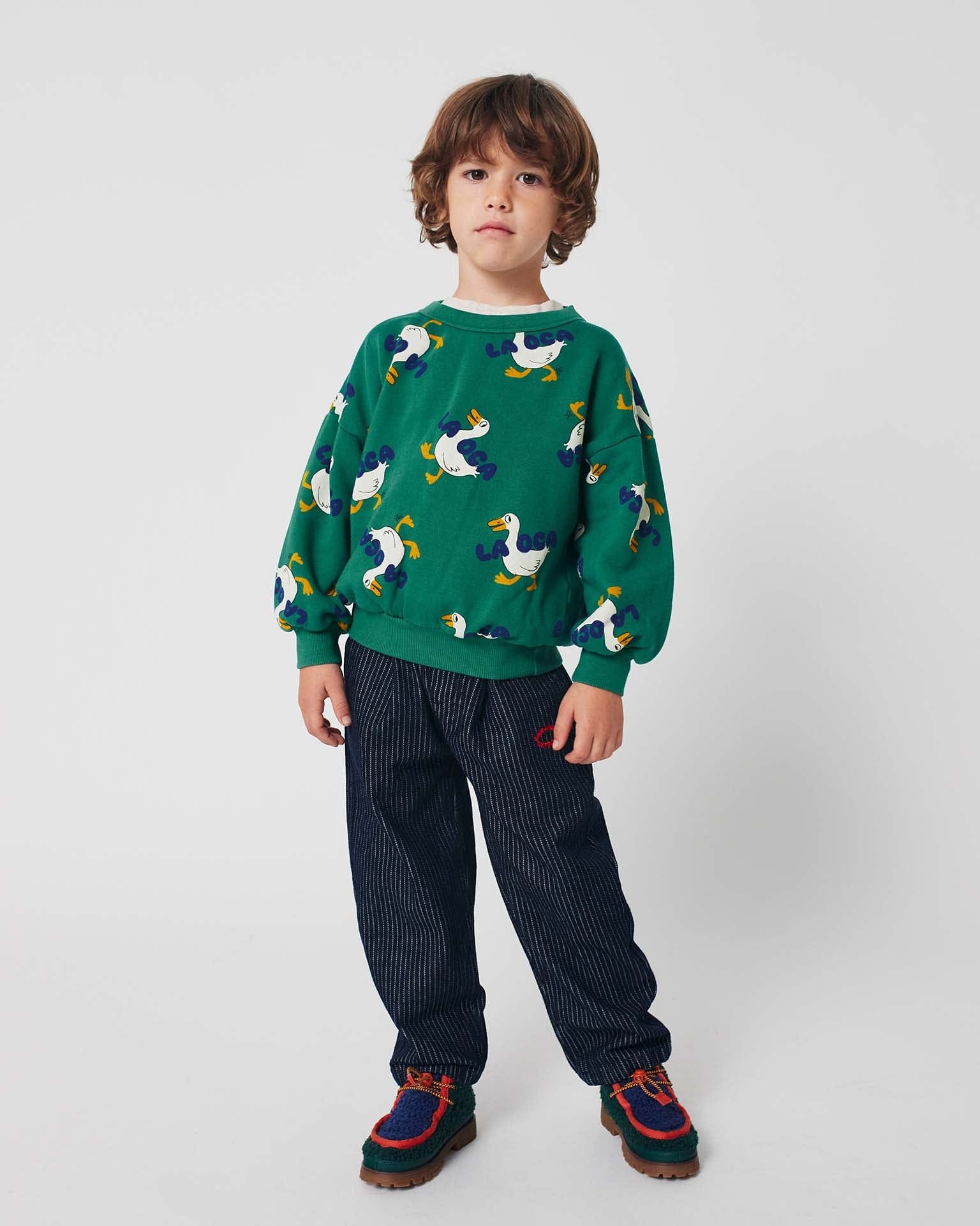 A classic crewneck sweatshirt with a twist, la oca's all over! This unique green sweatshirt is fun and has a relaxed fit. Pair it with the la oca joggers.