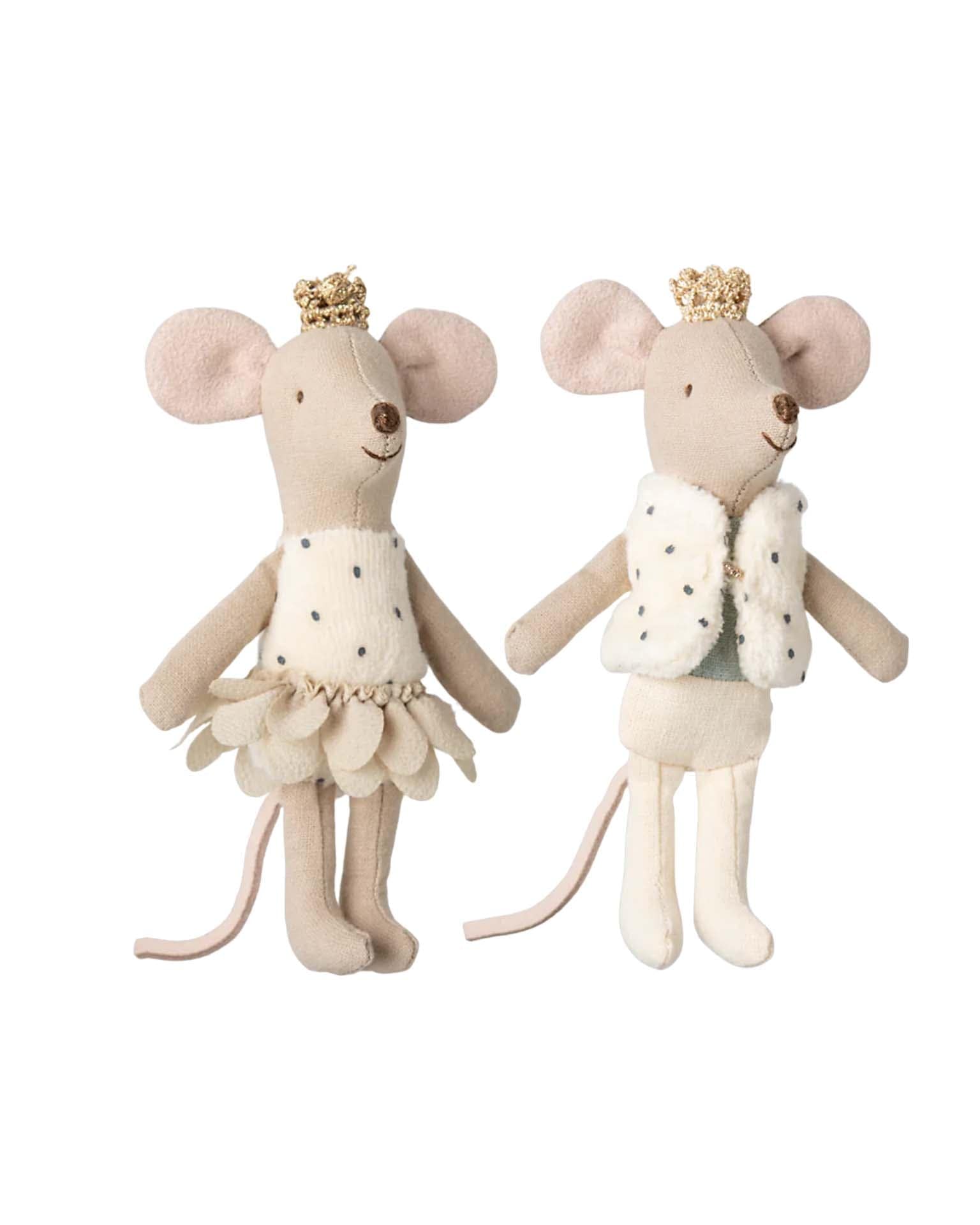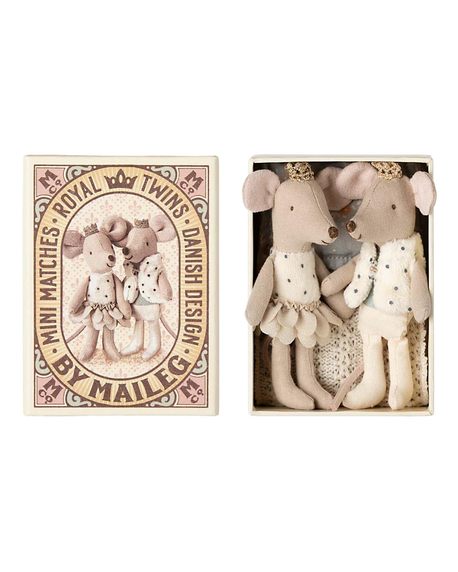 The royal twin mice is a set of a small princess and prince. They wear golden crowns and beautiful clothes. They sleep in a lovely decorated matchbox with a picture of themselves on the front. Inside the box you find the softest beddings.