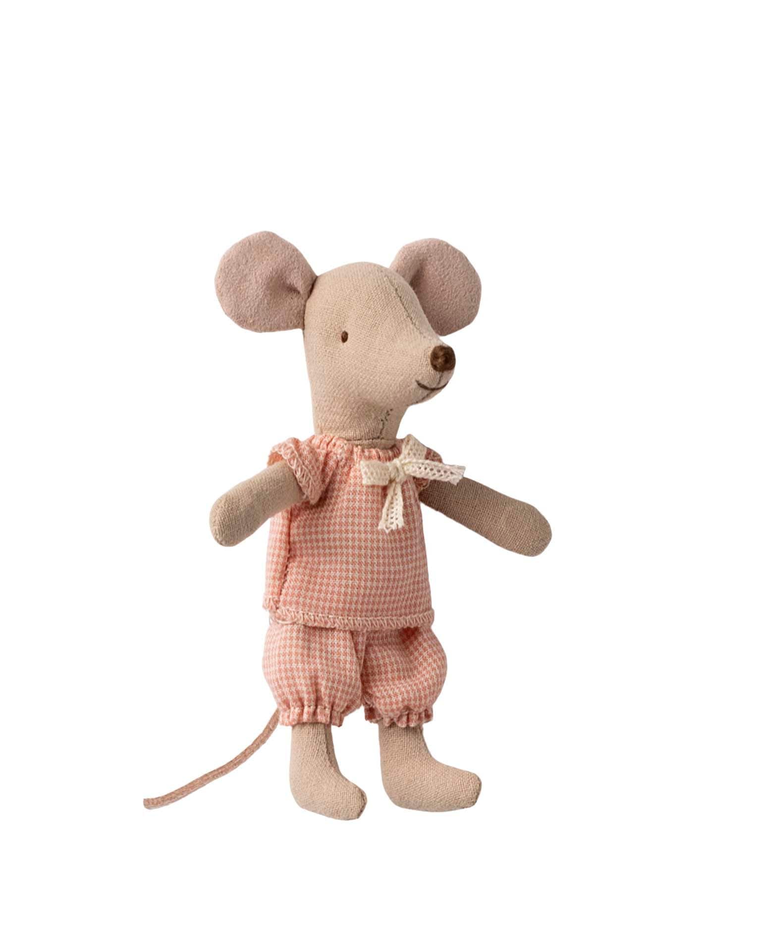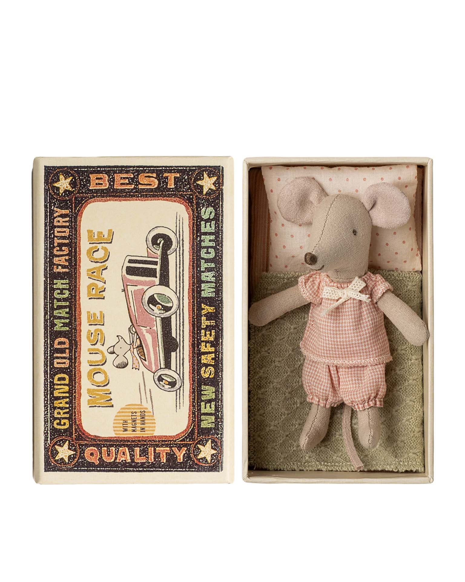 A classic Maileg item, this mouse is ready for hours of play and sleeps soundly in its little matchbox. The clothes and bedding are made of soft fabrics with unique prints in beautiful colors. The mouse has magnets in its hands.