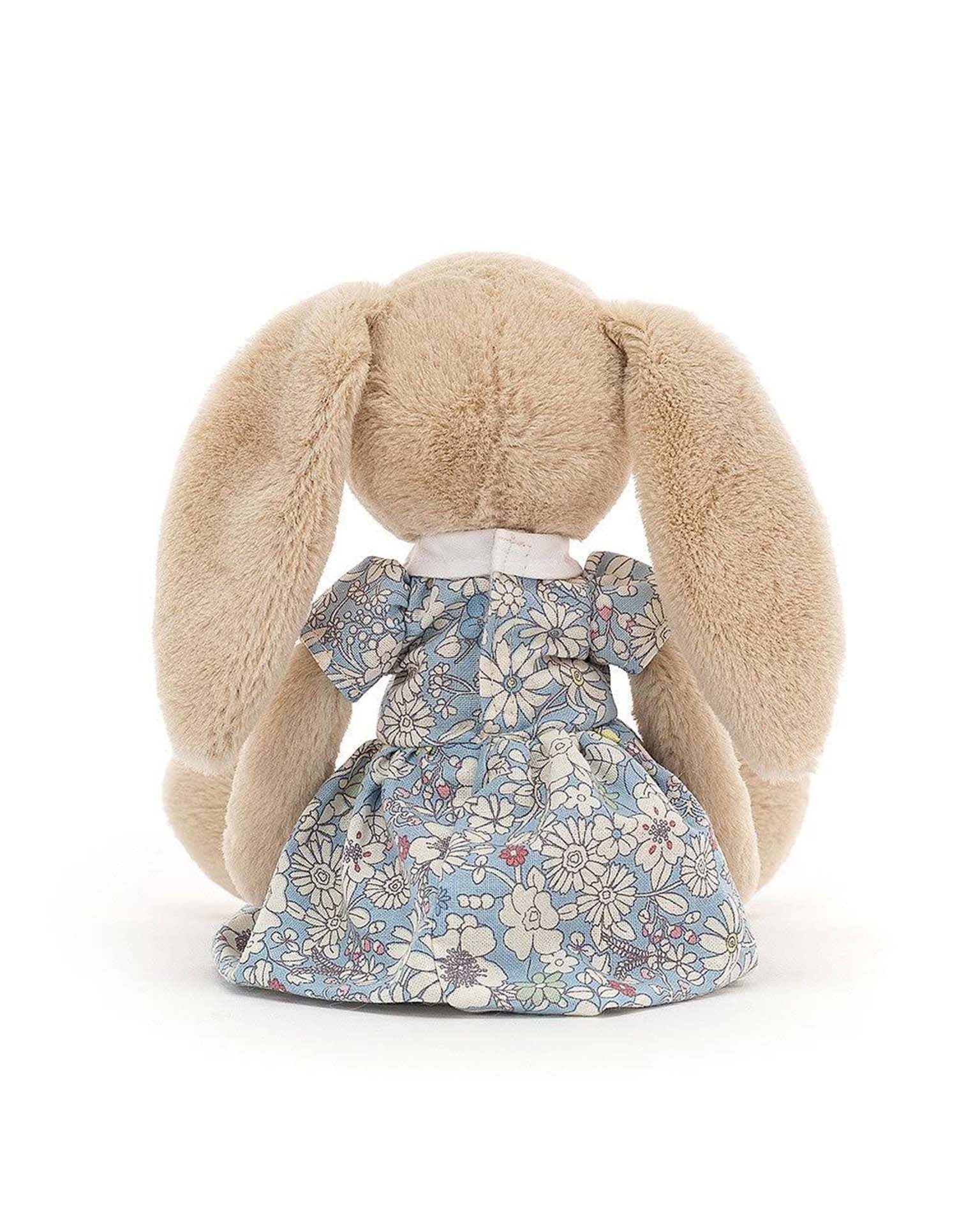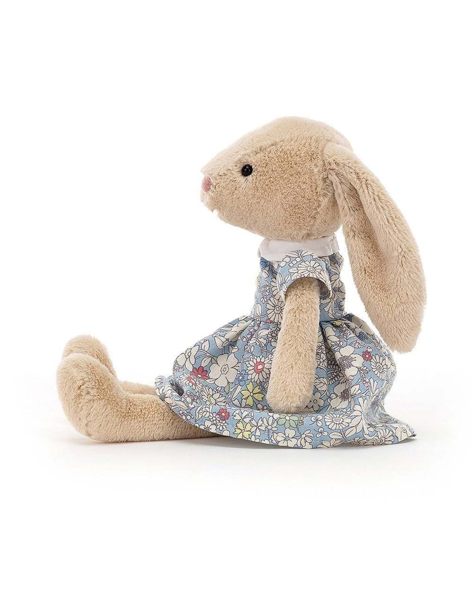 Lottie Bunny Floral is ready for a picnic in a pastel blue dress with pretty flowers! This oatmeal bunny has long flopsy ears, squish-squash paws and a sweet expression. A lovely present for spring or summer, full of joy and bounce!