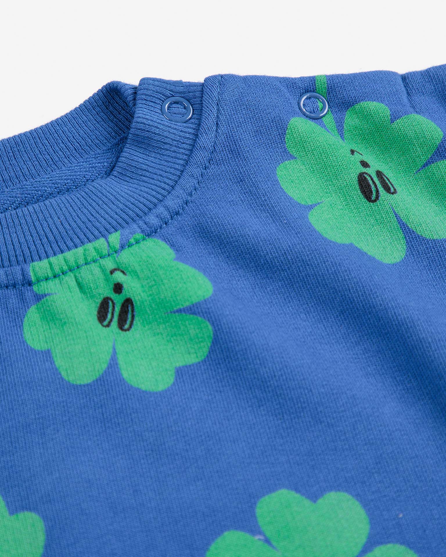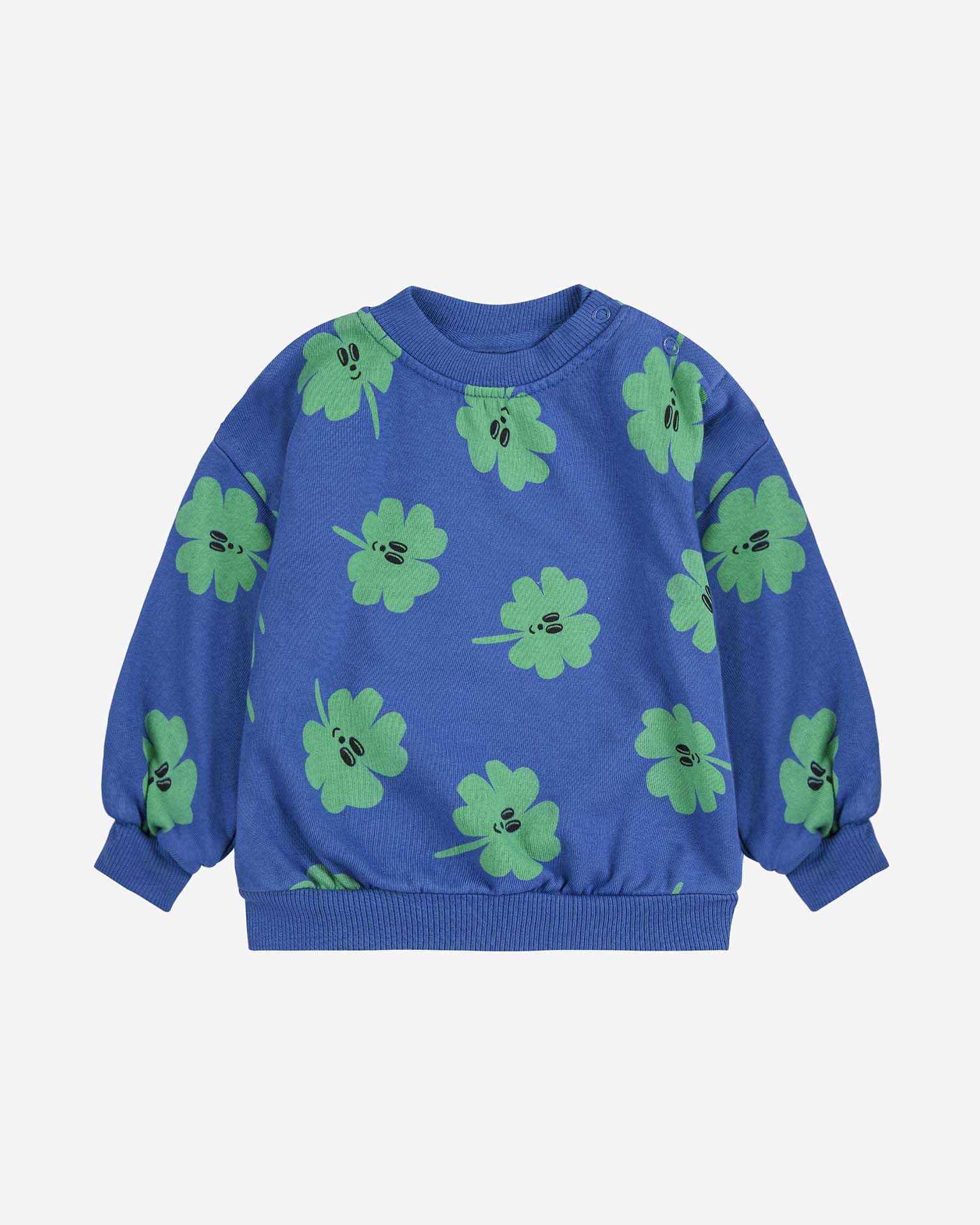 This lucky clover all over sweatshirt from Bobo Choses is fun and bright, featuring snap buttons at the shoulder for easy changing. Pair it with the matching joggers!