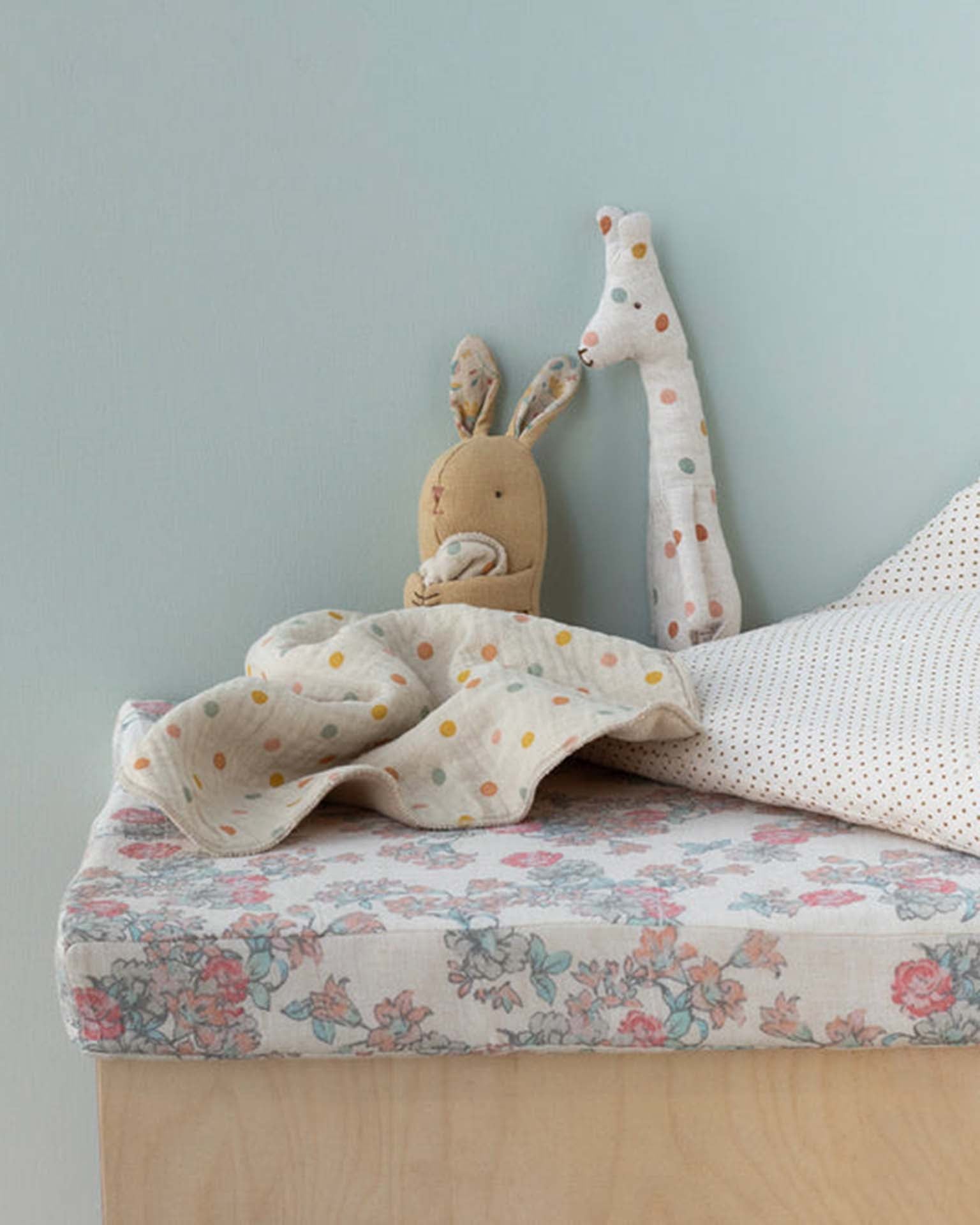 Lullaby friends is a collection of beautiful styles for babies. This is the perfect gift for a newborn as it includes a soft toy and cuddle cloth - all made in fabrics with unique Maileg prints on.