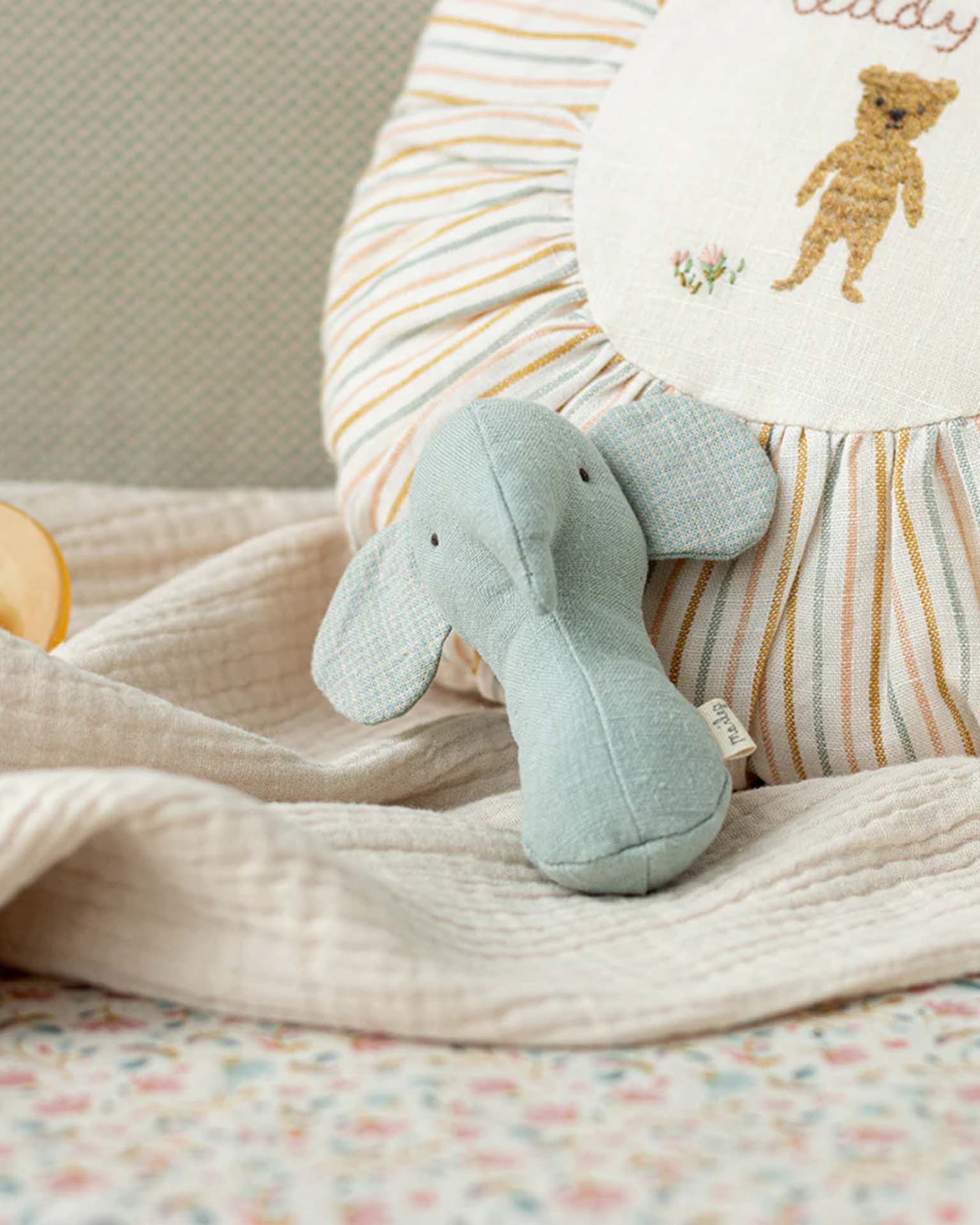 Lullaby friends is a collection of beautiful items for babies. This rattle is perfectly shaped for a small hand and has a stimulating rattle sound. It is made in soft fabrics with unique prints and packed in a beautiful gift box.