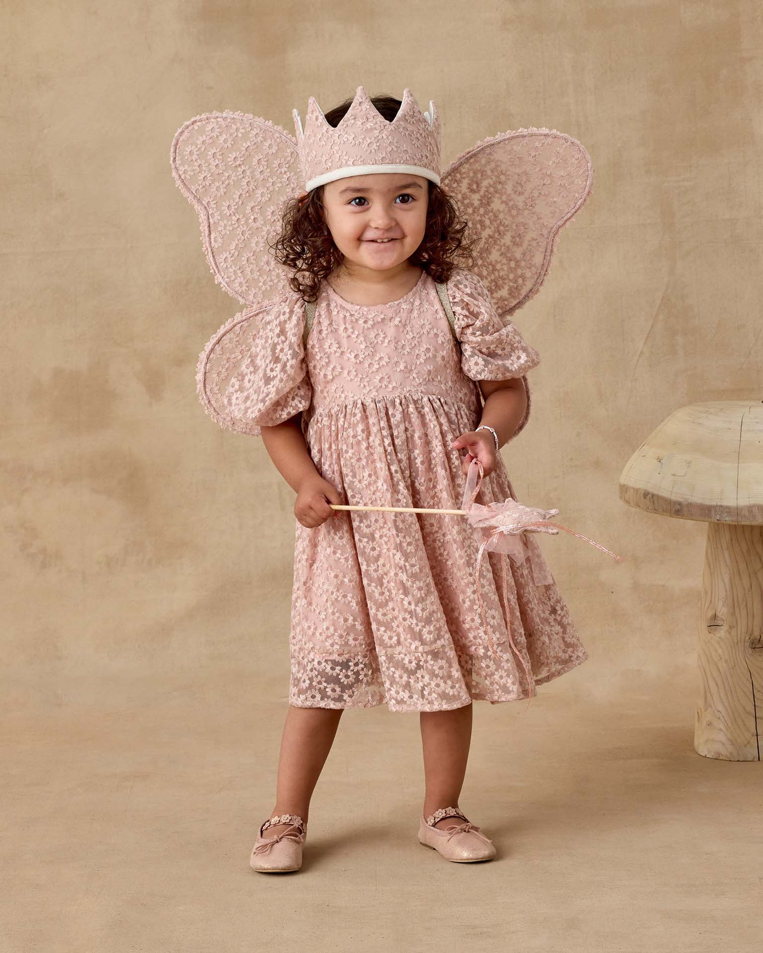 Our Luna Dress showcases a babydoll-inspired silhouette with sweet puff sleeves, a gently curved waistline, and two faux shell buttons at the back for a delicate finishing touch. Coordinating bloomers included with size 2Y.