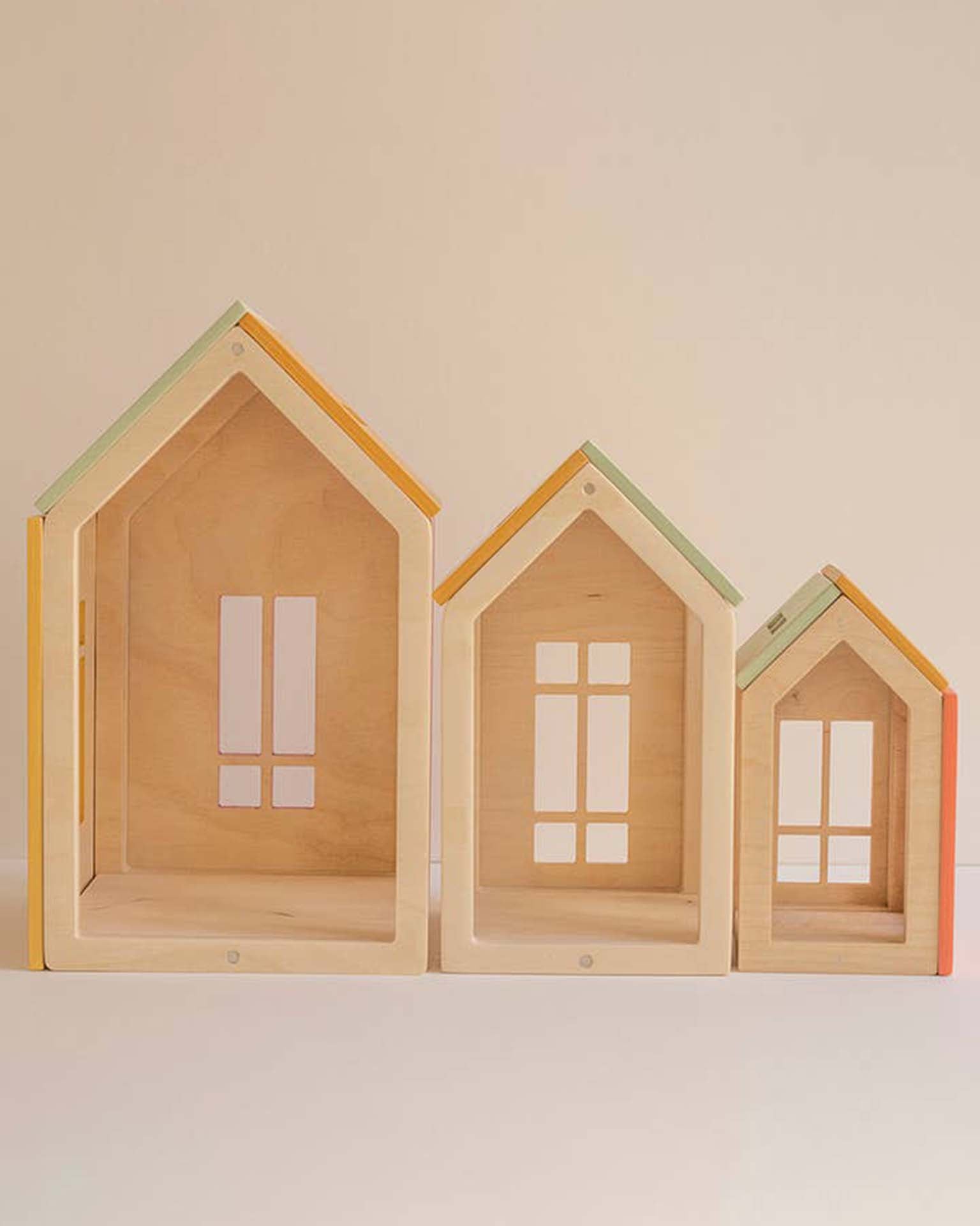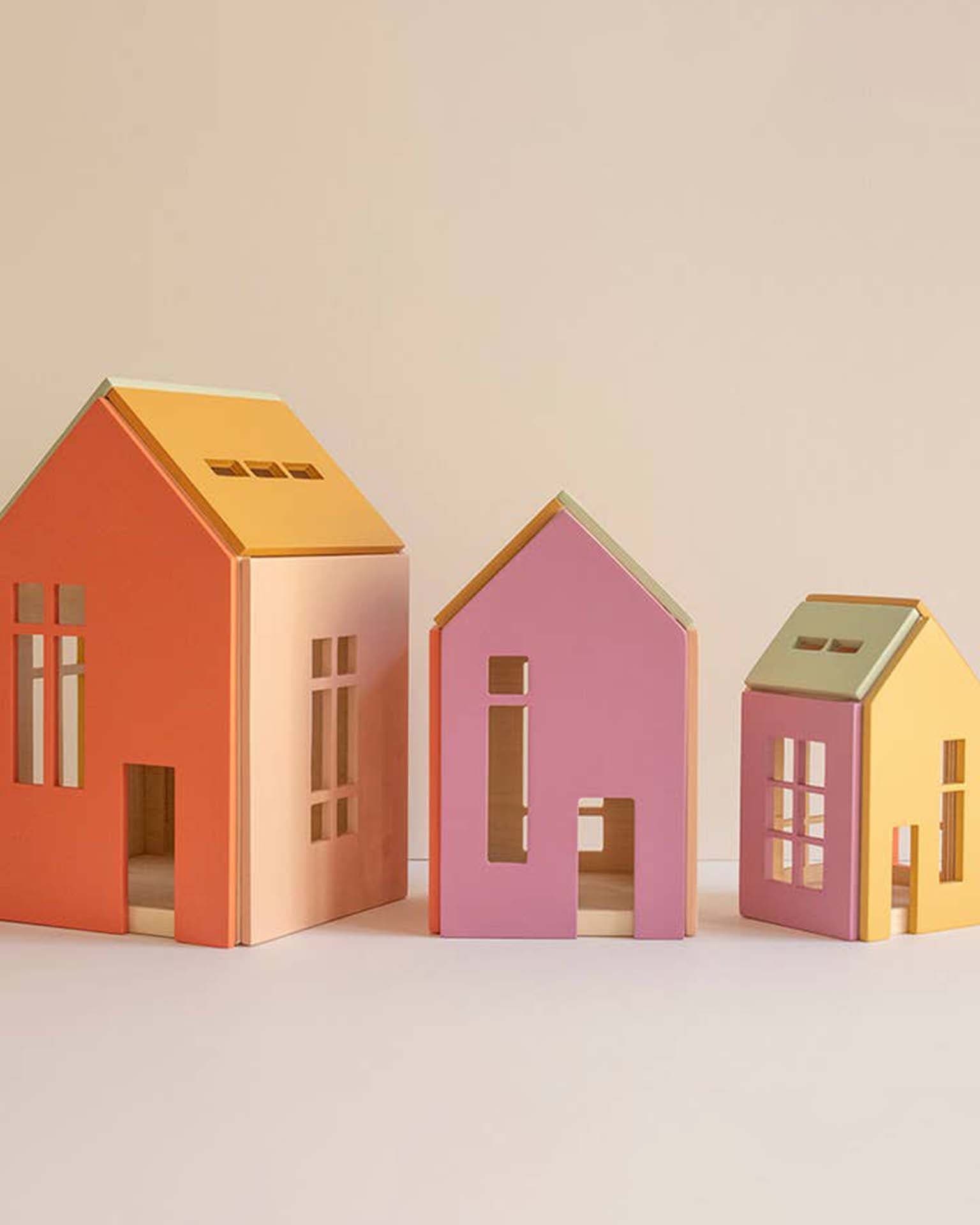 - Includes 3 dollhouses: large, medium, small
