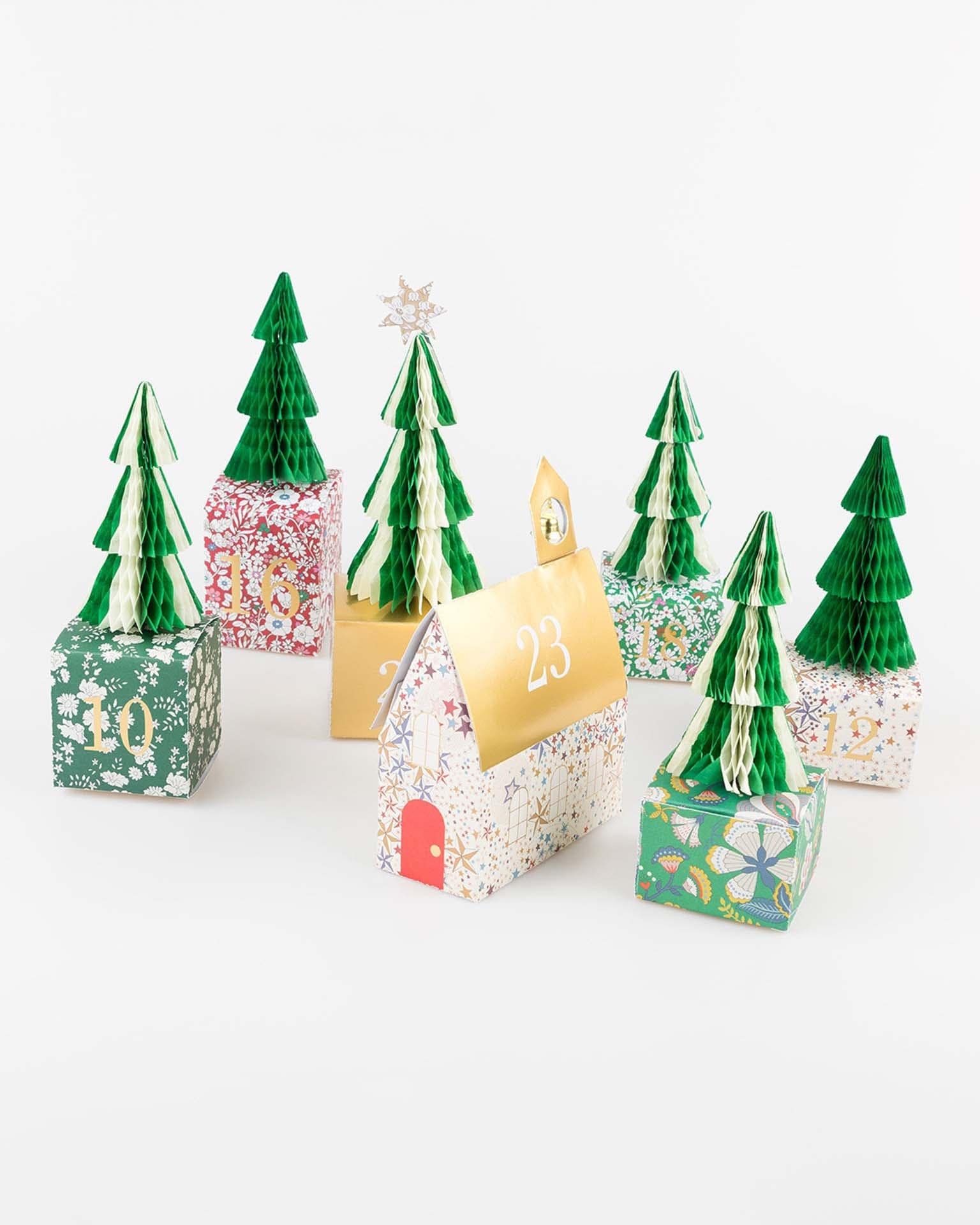 - On Christmas Eve open the number 24 paper box with a striped 3D tissue paper honeycomb Christmas tree decorated with a matt gold foil star and base, perfect to place in the village center