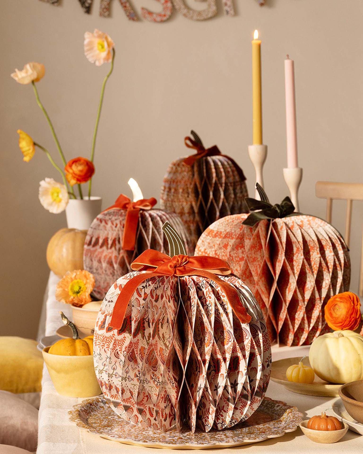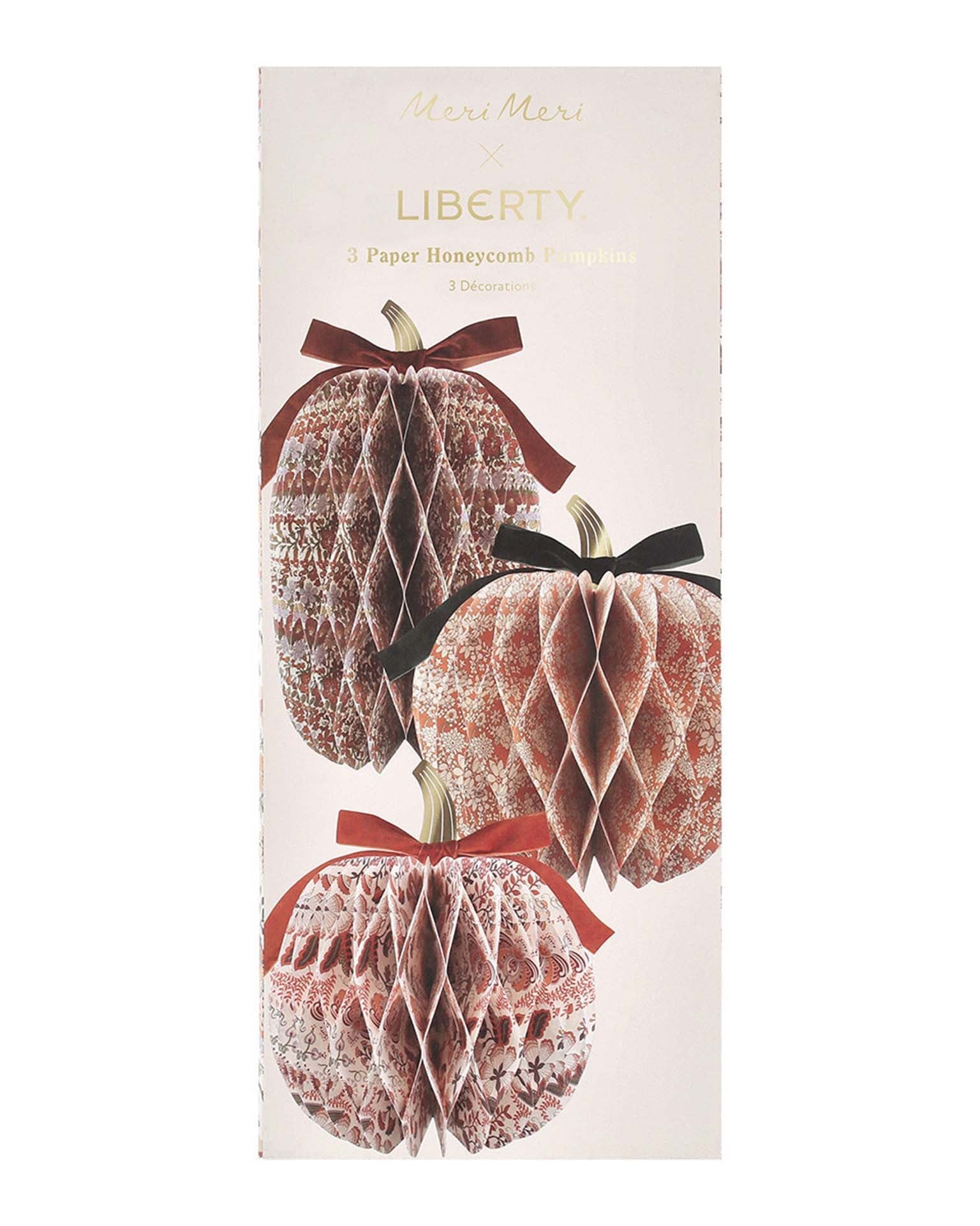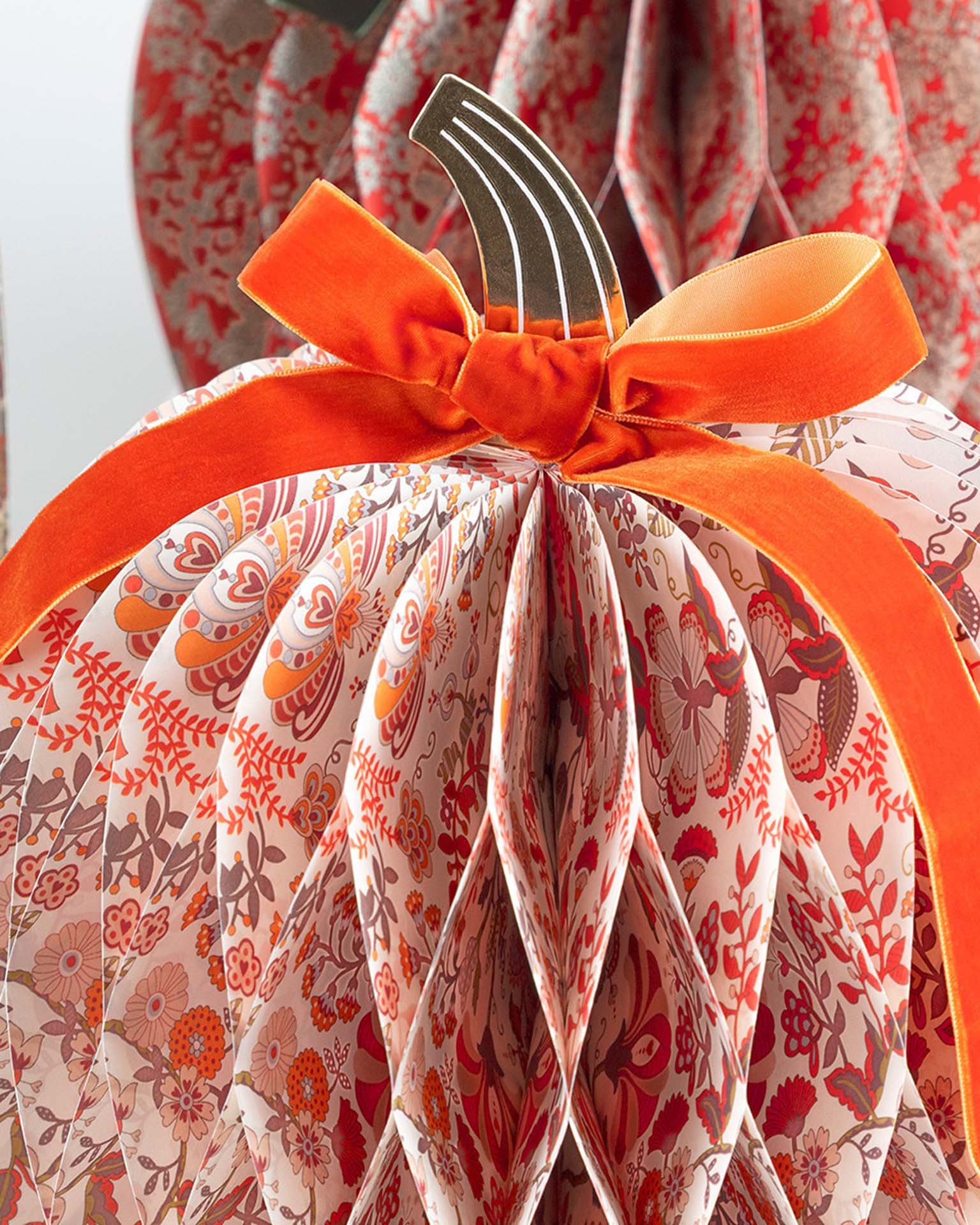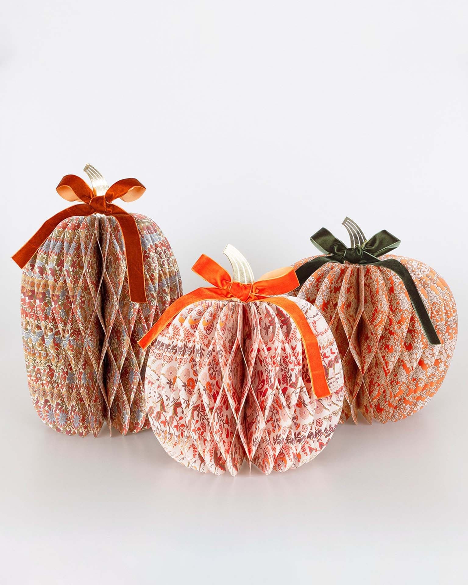 - 3 Honeycomb paper pumpkins, each with a different Liberty floral print and velvet bow in warm hues