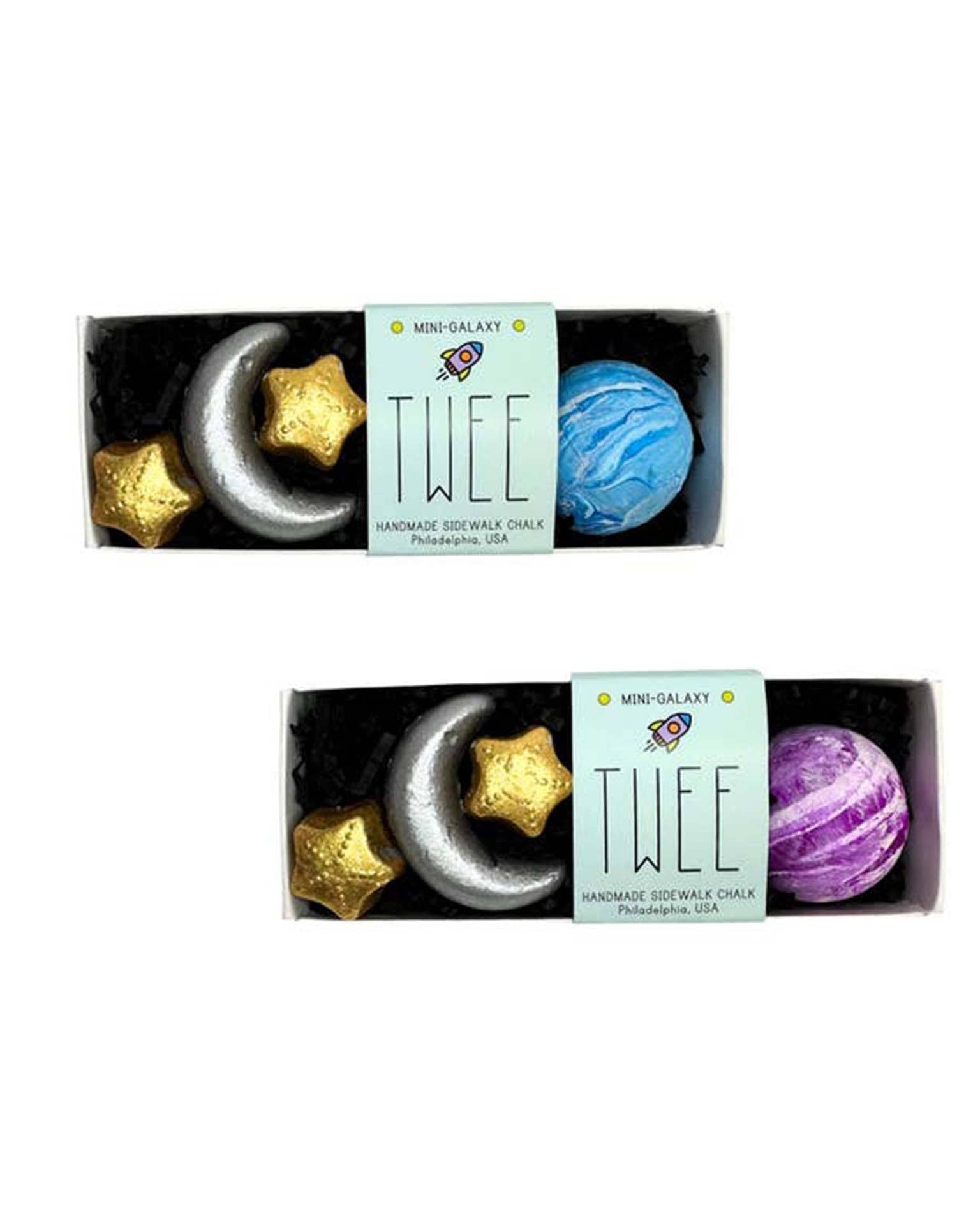 Snag a mini-version of our complete solar system, Mason's Planets, with a little added twinkle of two hand painted gold stars and a silver crescent moon! Our TWEE Mini Galaxy handmade sidewalk chalk provides young astronomers the opportunity to explore the solar system through fun and imaginative play!