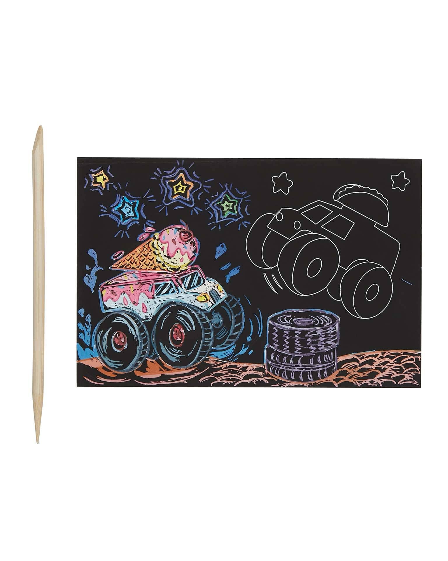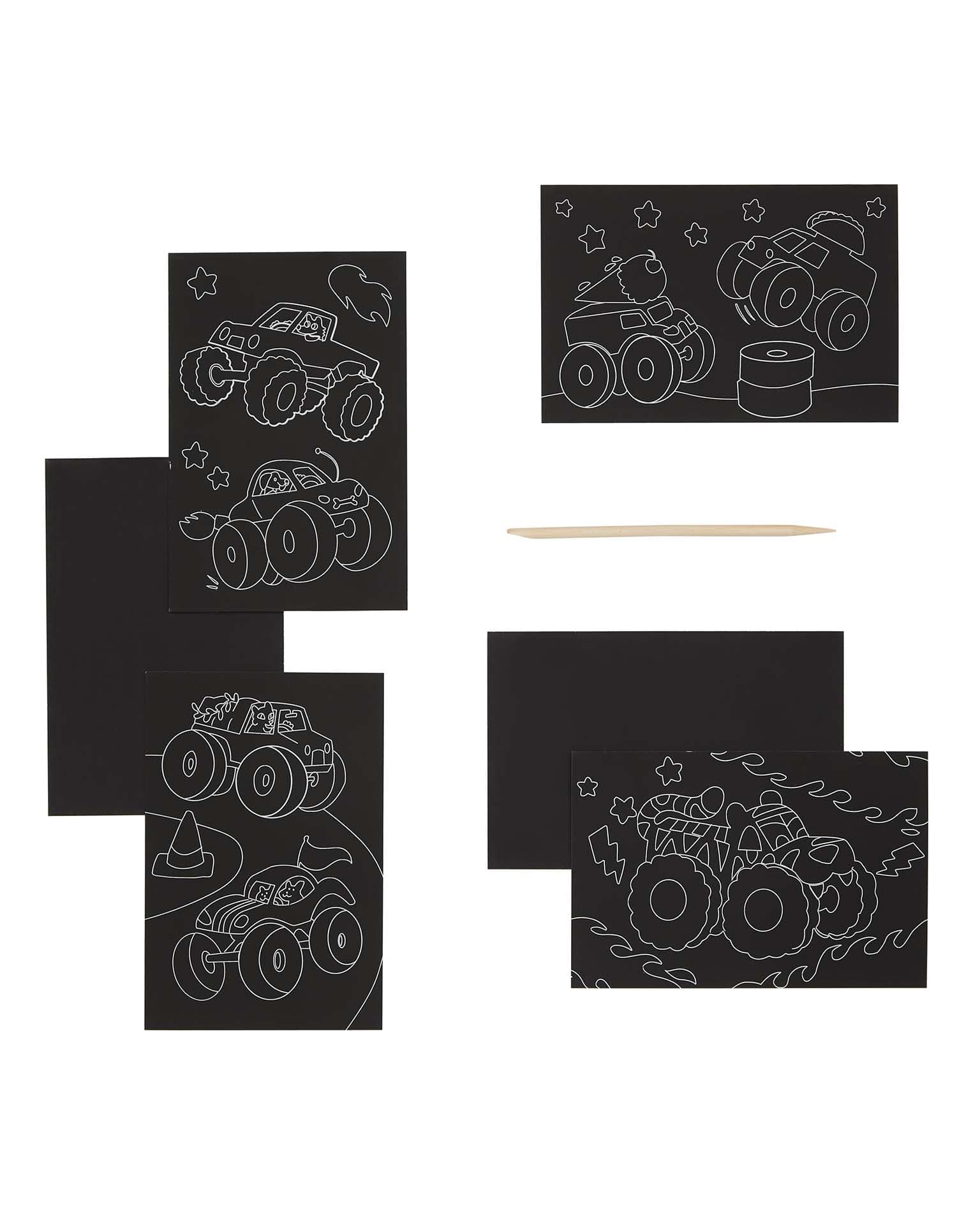 - Travel sized scratch art kit with Monster Truck