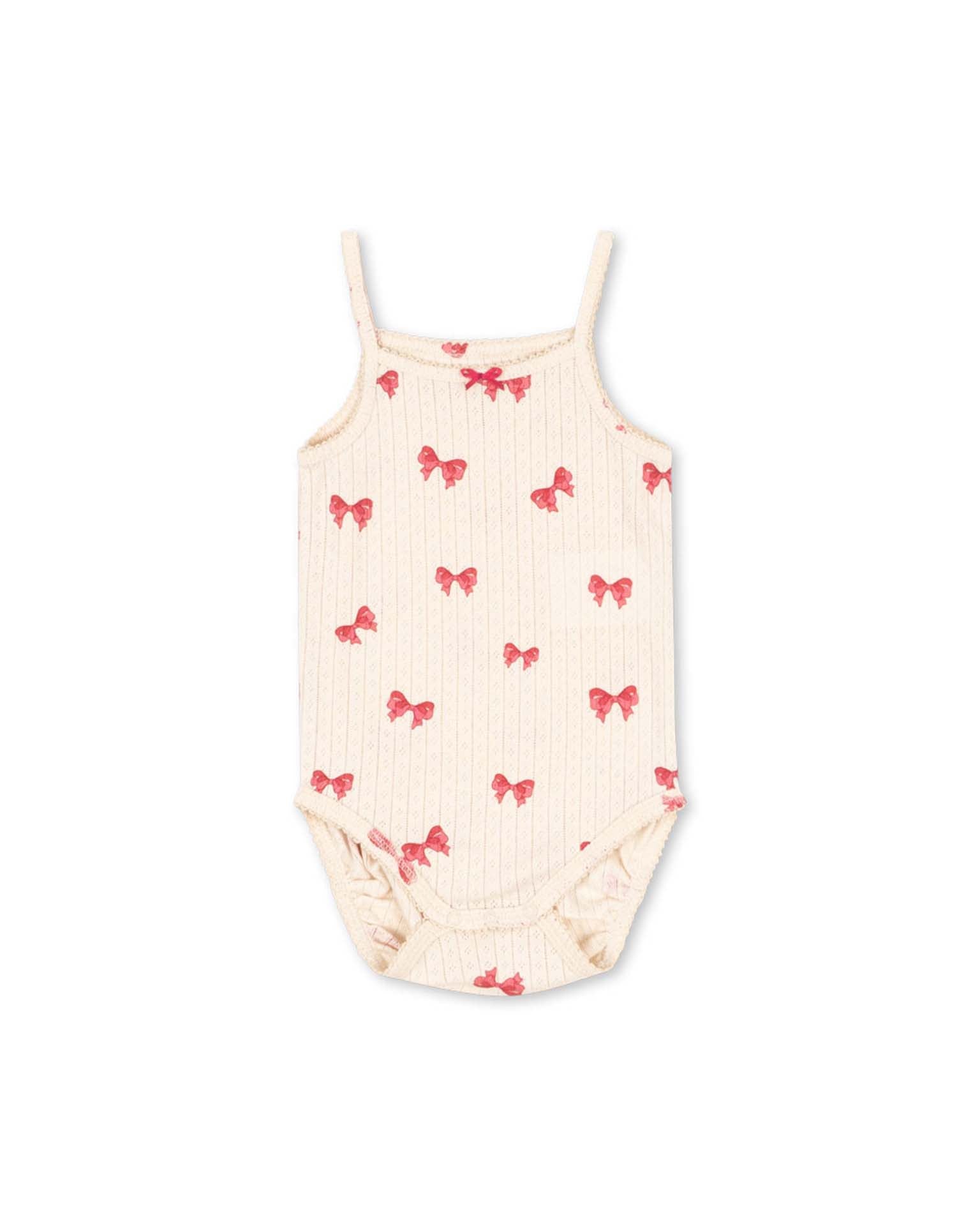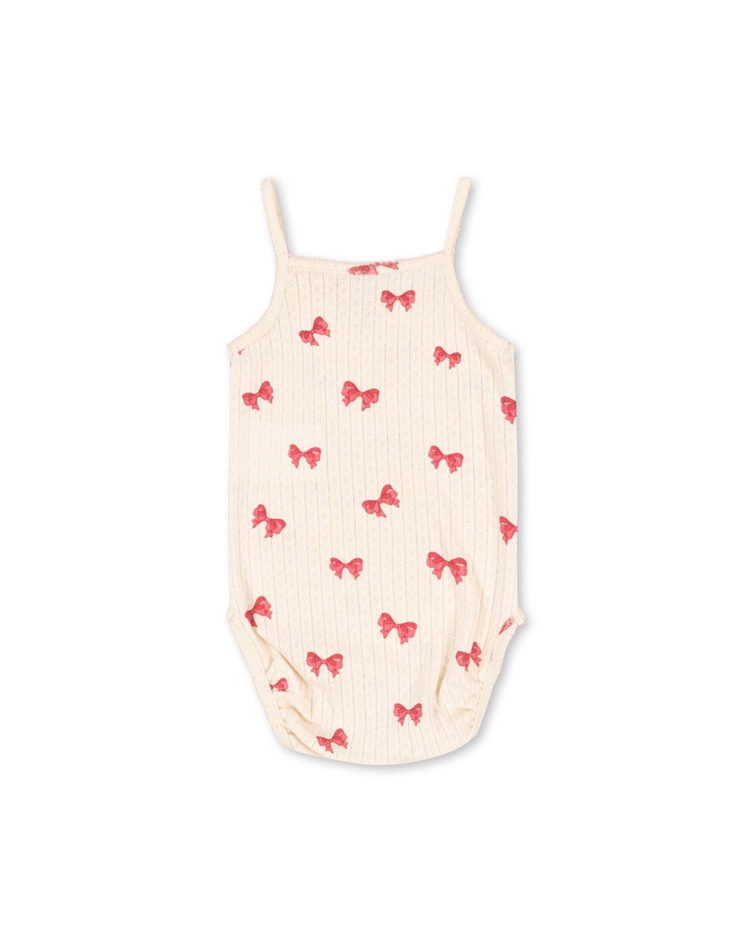 This soft, organic cotton body with a decorative pointelle pattern is designed with press buttons at the leg opening for easy dressing and slim straps.