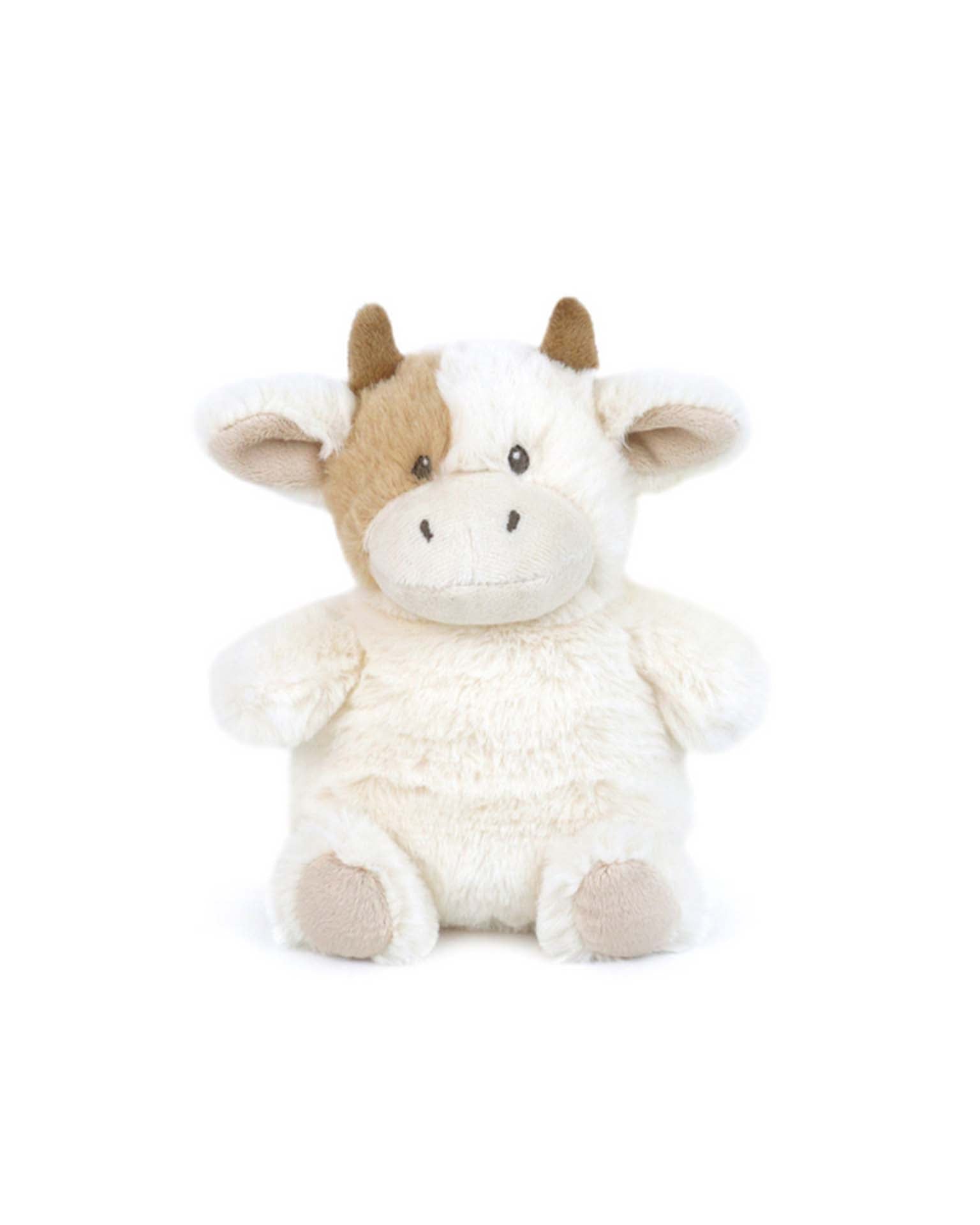Mocha the Petit Cow is an adorable and cuddly plush companion! This charming cow features a soft, fluffy white body with a delightful brown patch on one eye and tiny brown horns. Its friendly expression is accentuated by embroidered eyes and a sweet, smiley face. Mocha's soft ears and plump, rounded shape make it perfect for hugging. This pocket-sized pal is ideal for snuggles, playtime, or as a delightful addition to any stuffed animal collection.