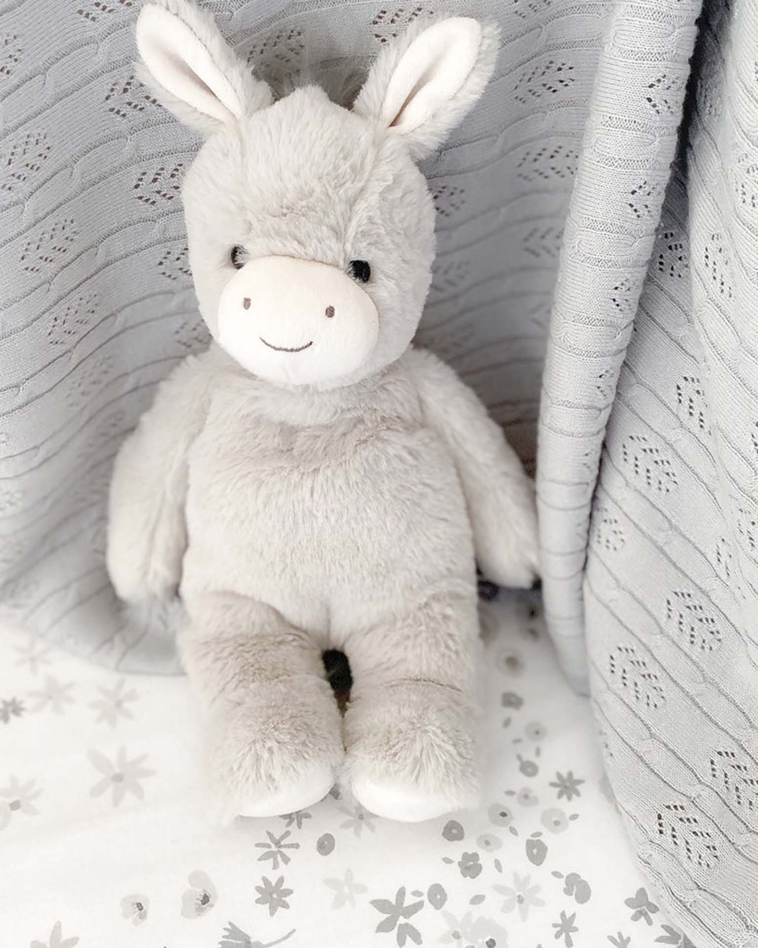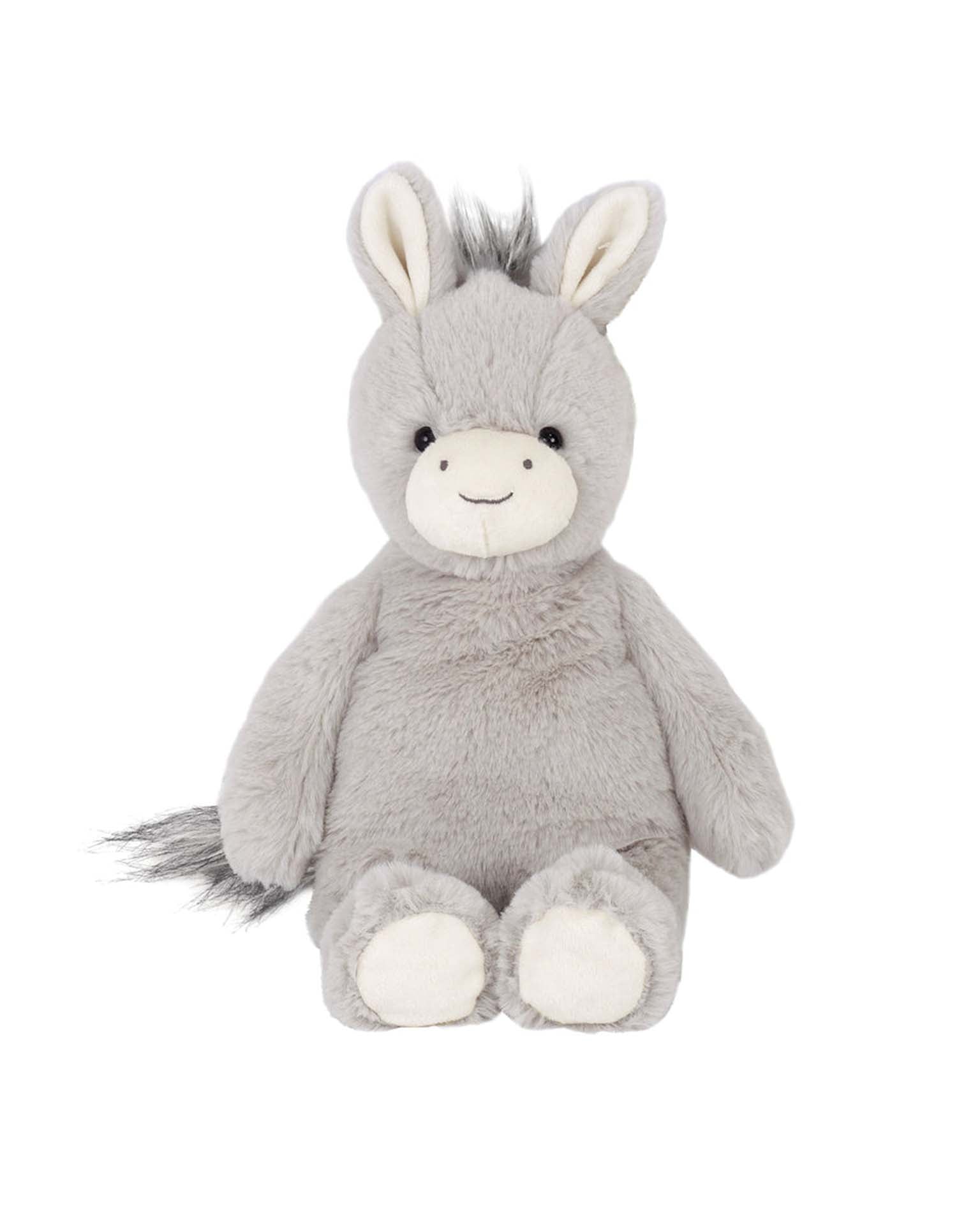 Hee-haw, hee-haw! Moses the donkey plush toy makes his grand entrance with a cute-as-can-be face, ultra-soft grey fur and swishy tail. Floppy, go-anywhere feet ensure this donkey plush toy will have his share of adventures from playtime to movie time to bedtime.