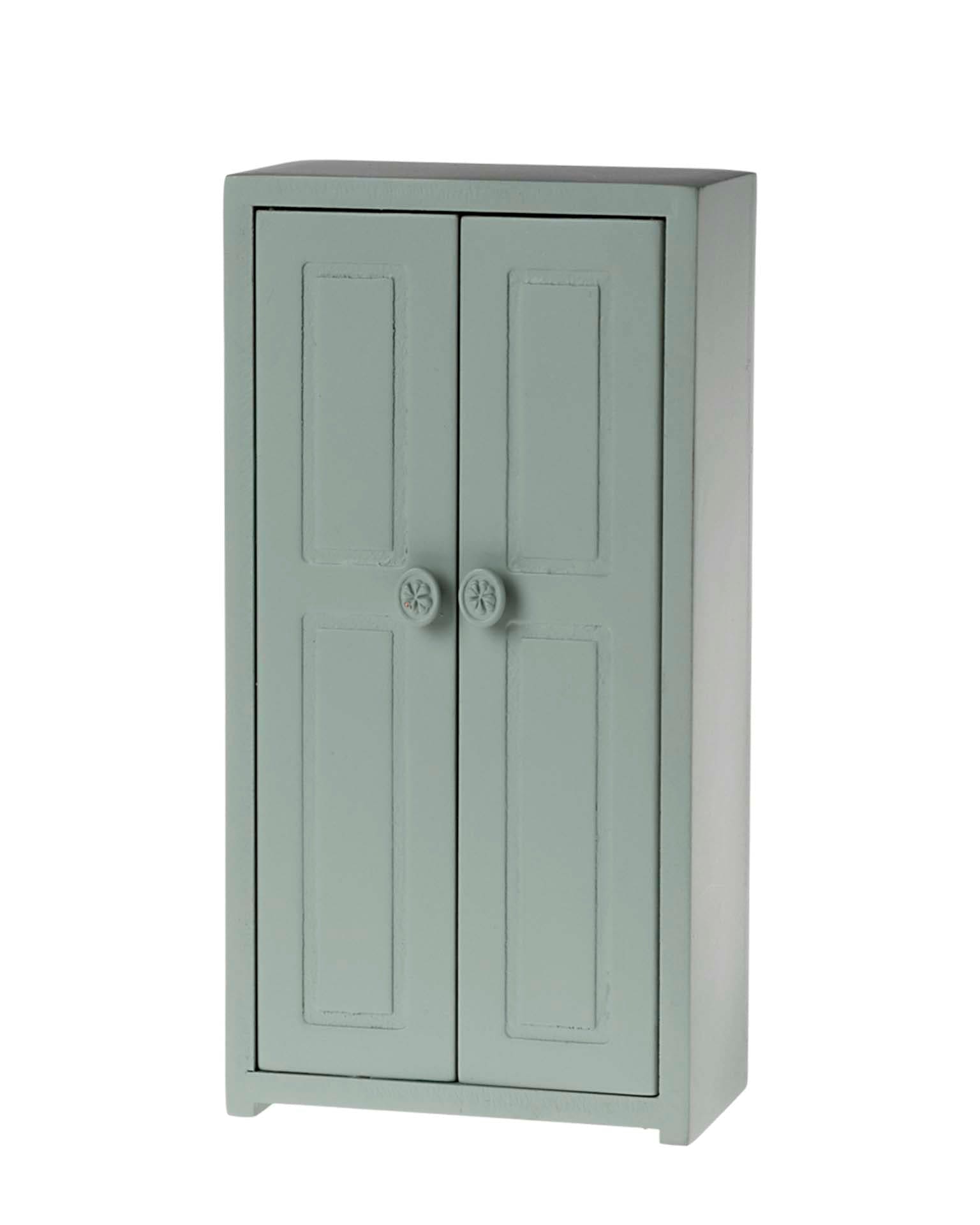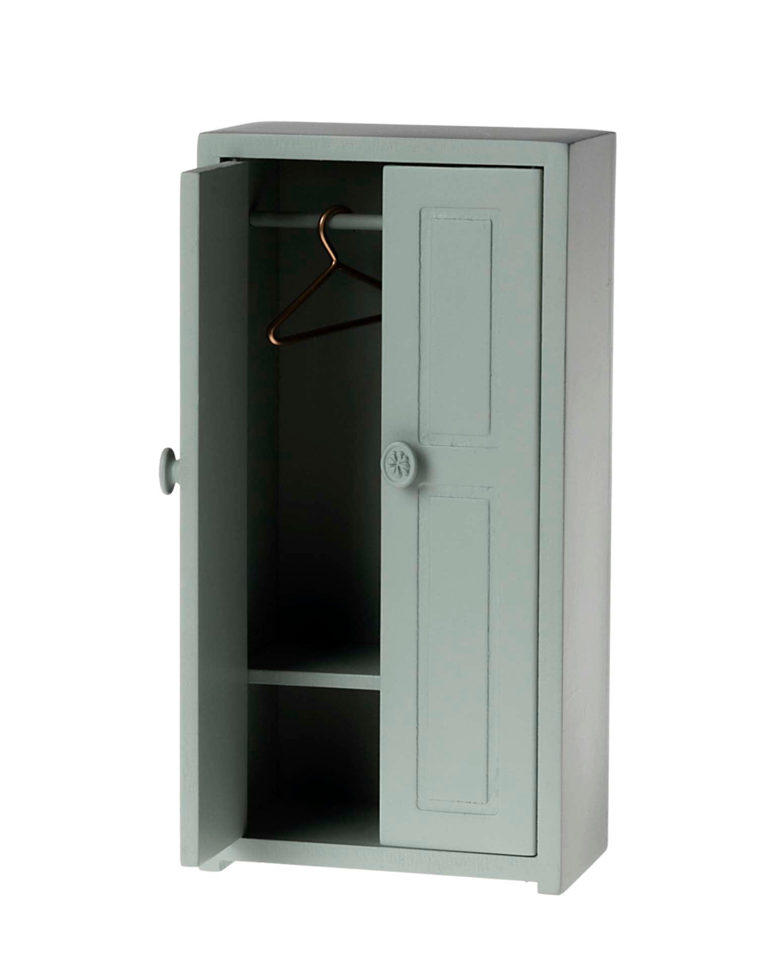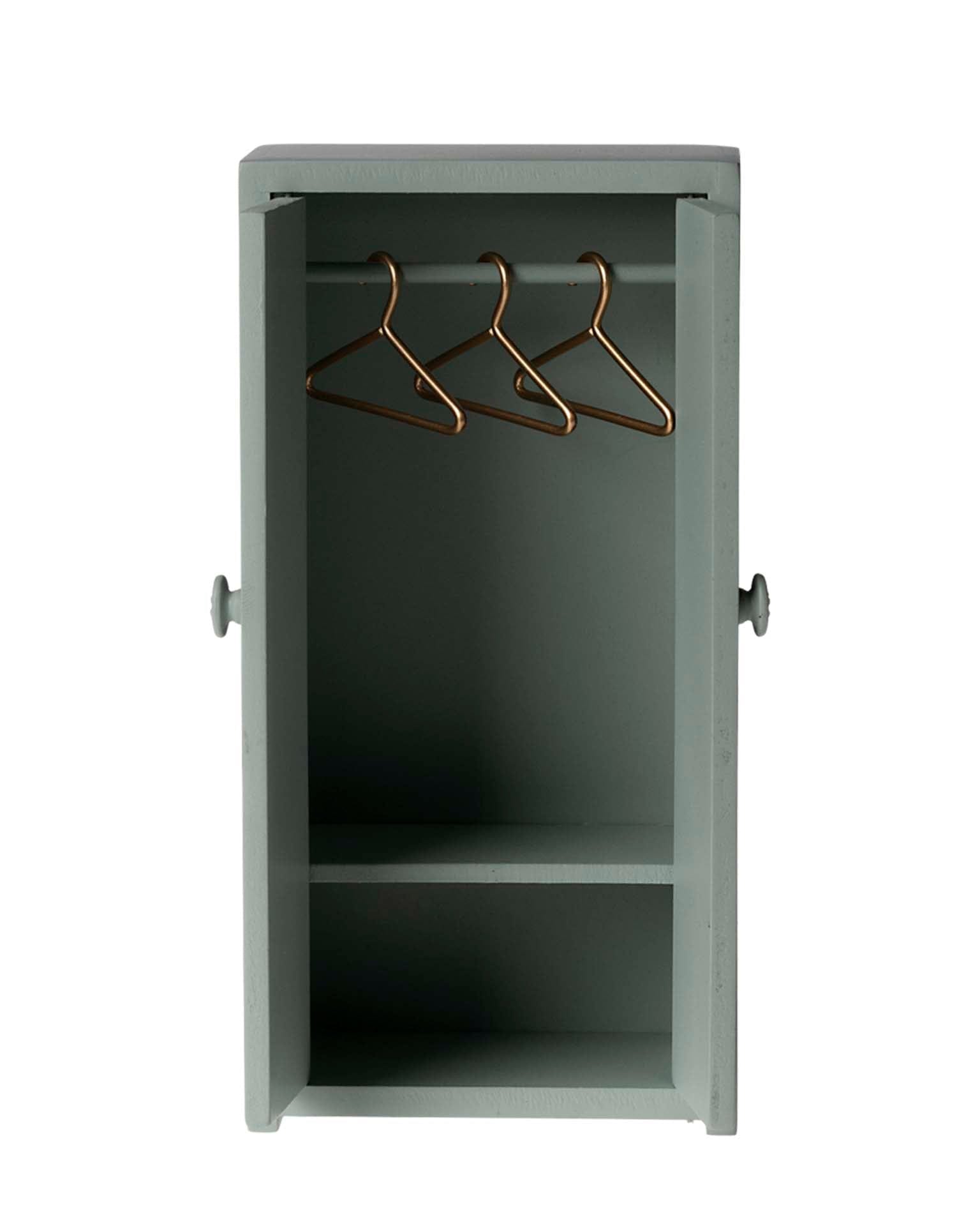 A small closet helps the mice family organize their wardrobe. The closet comes with three golden hangers.