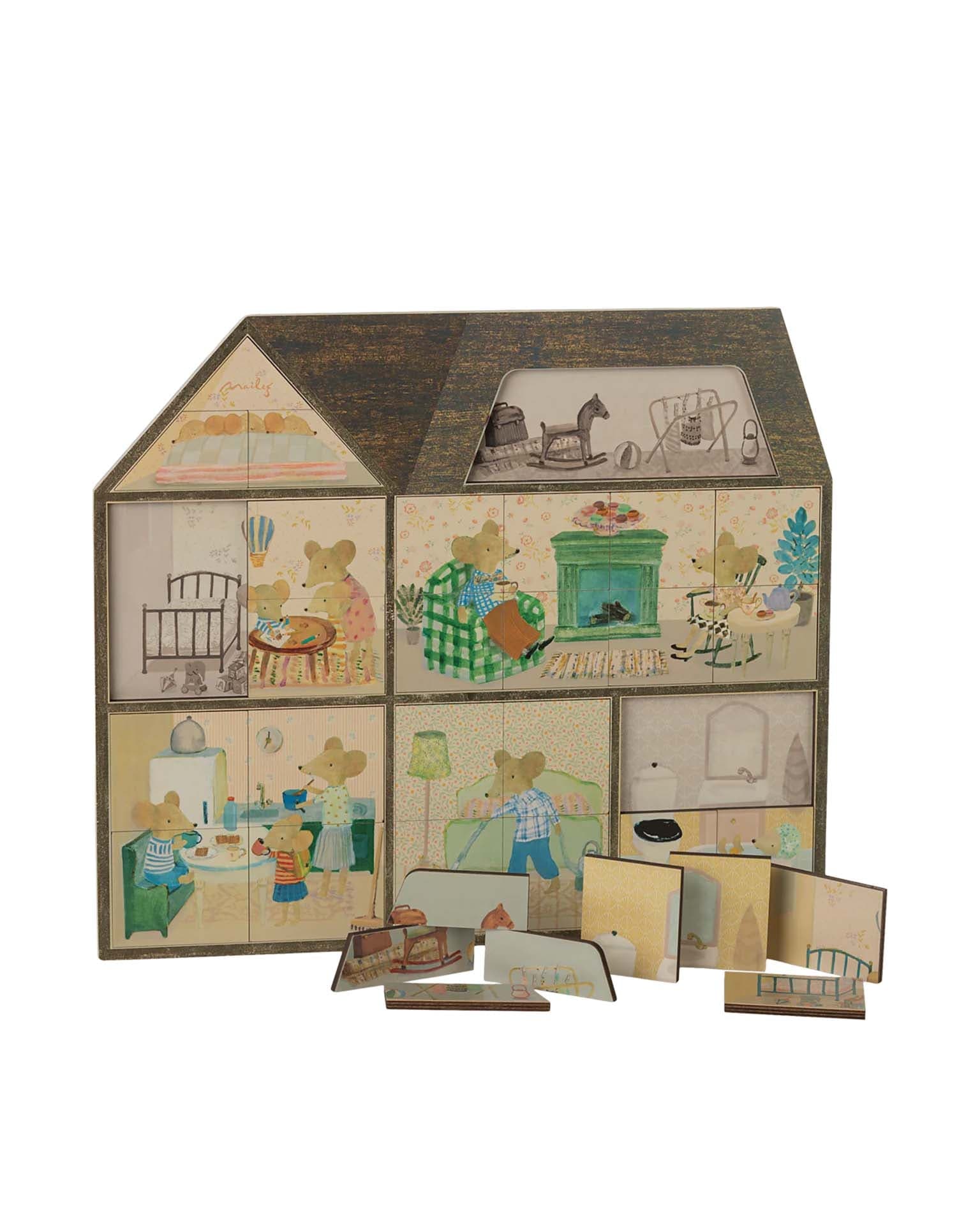 The wooden puzzle comes with 31 puzzle pieces without interlocking. The illustration is hand drawn by Dorthe Mailil and shows 7 different rooms in the Mouse hole Farmhouse. The puzzle has the graphic printed on the ground plate as well.