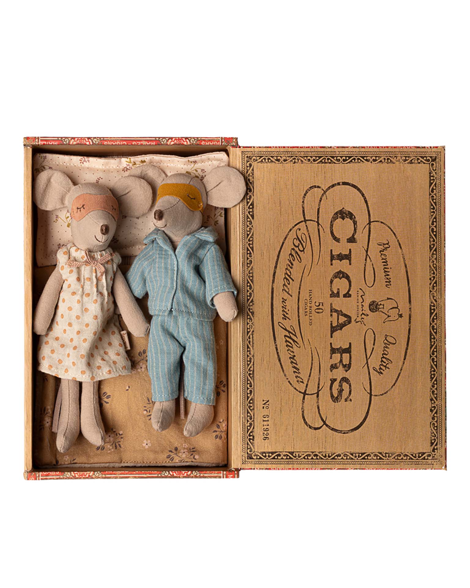 A classic Maileg item. Mum and Dad mice are wearing their beautiful nightwear and eye masks. The cigar box is a perfect bed for a good night’s sleep and sweet dreams.