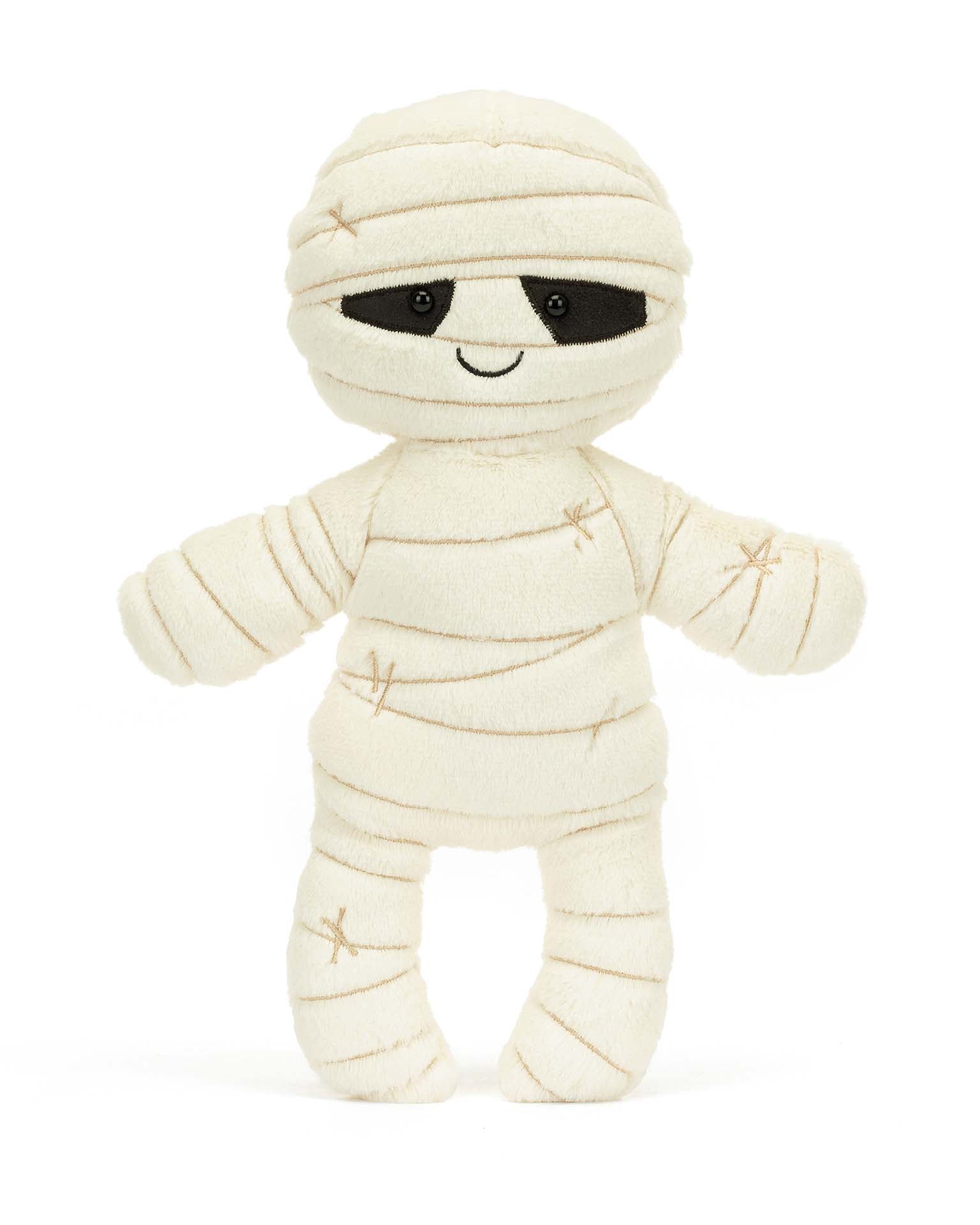 Even skeletons need Halloween costumes! Meet Mummy Bob – an undead softy in cream fur bandages, with delicate embroidered stitches. Look closely to see Bob's shiny eyes peeking out from all those layers!
