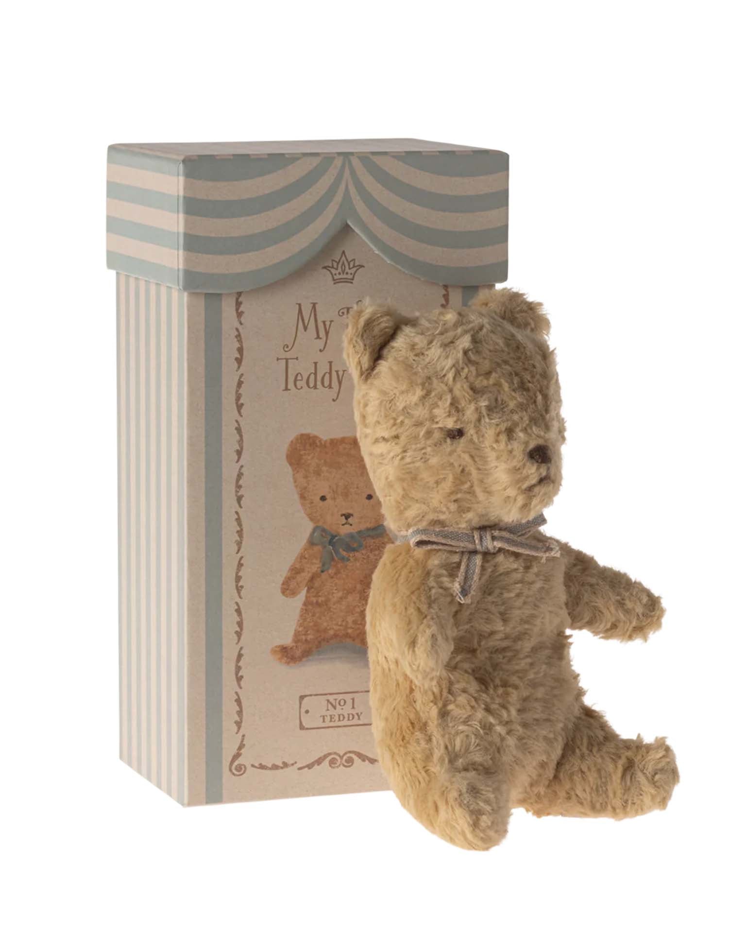 The perfect gift for any new born baby. The fabric is very exclusive and gives the small teddy bear a sweet classic vintage look. Ready to be loved for many years. You can write the name, date, height and weight of the baby on the inside of the box.