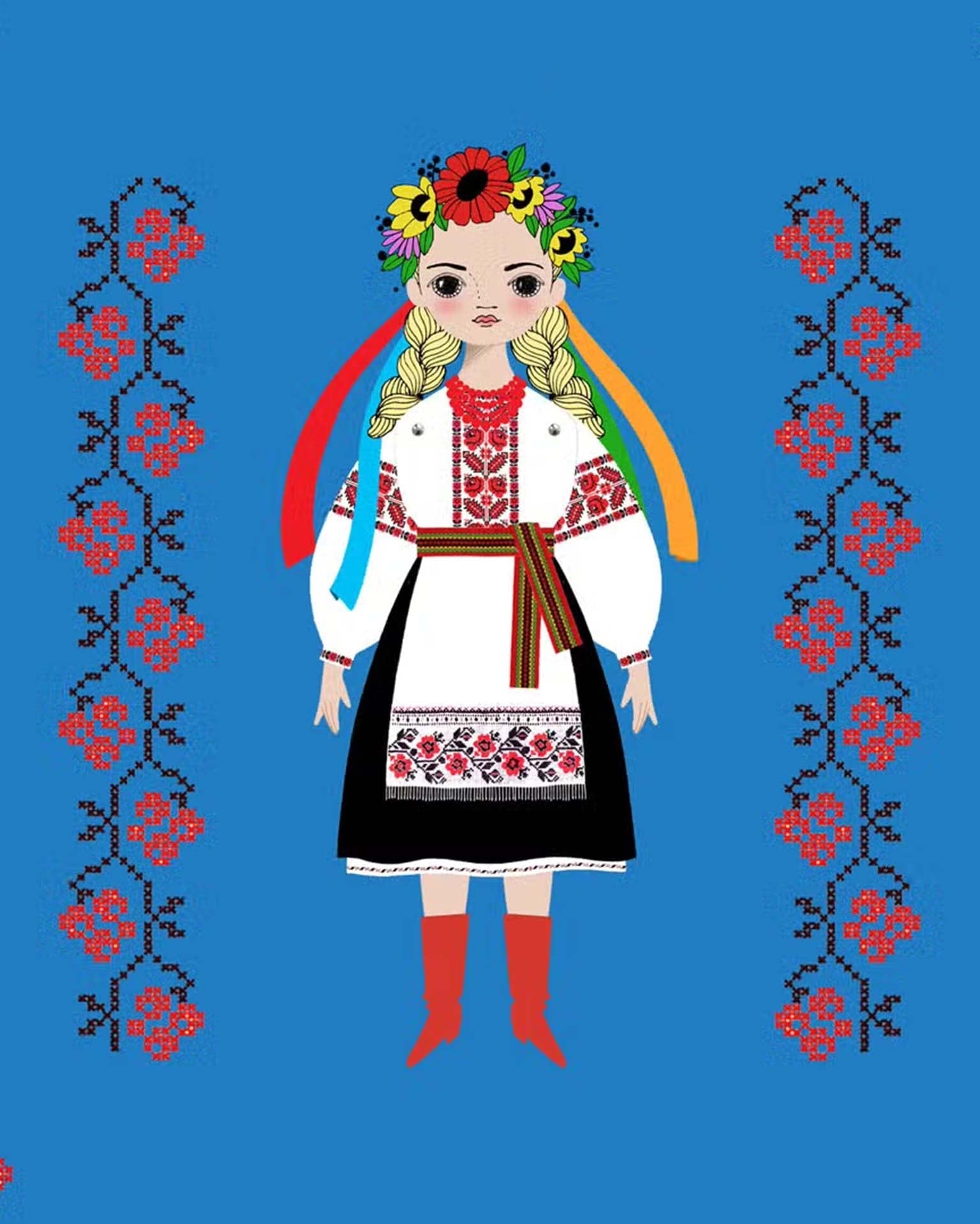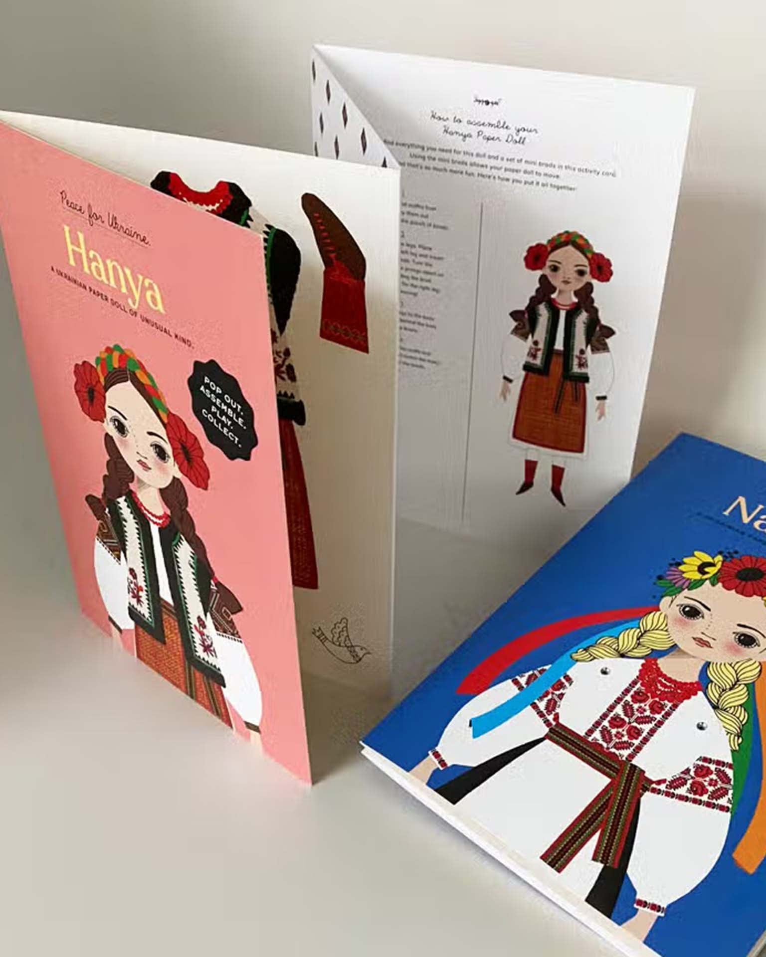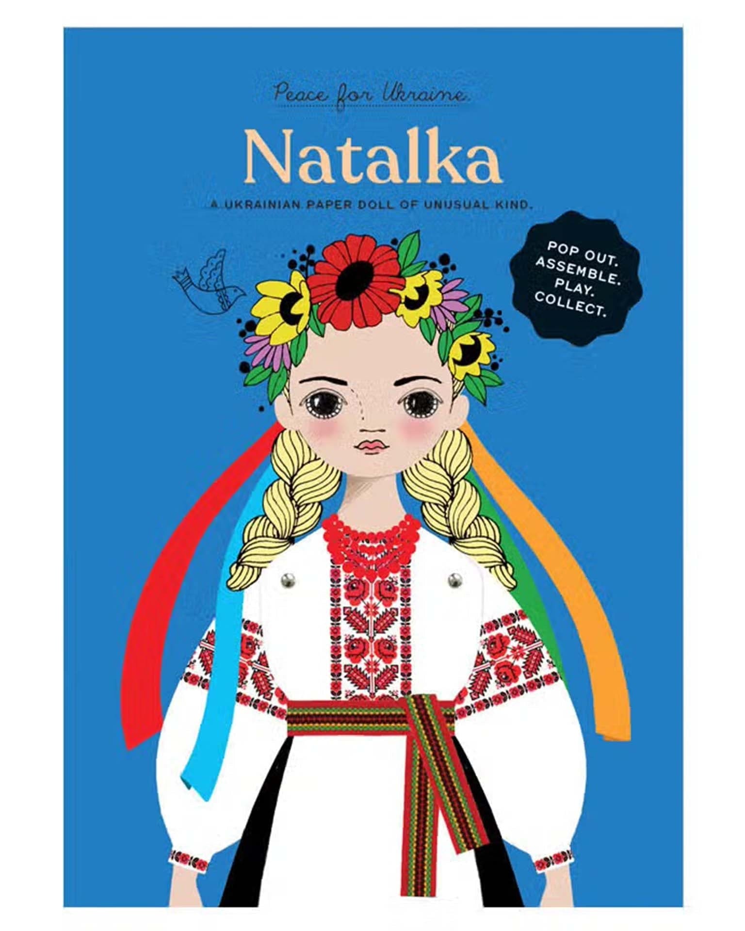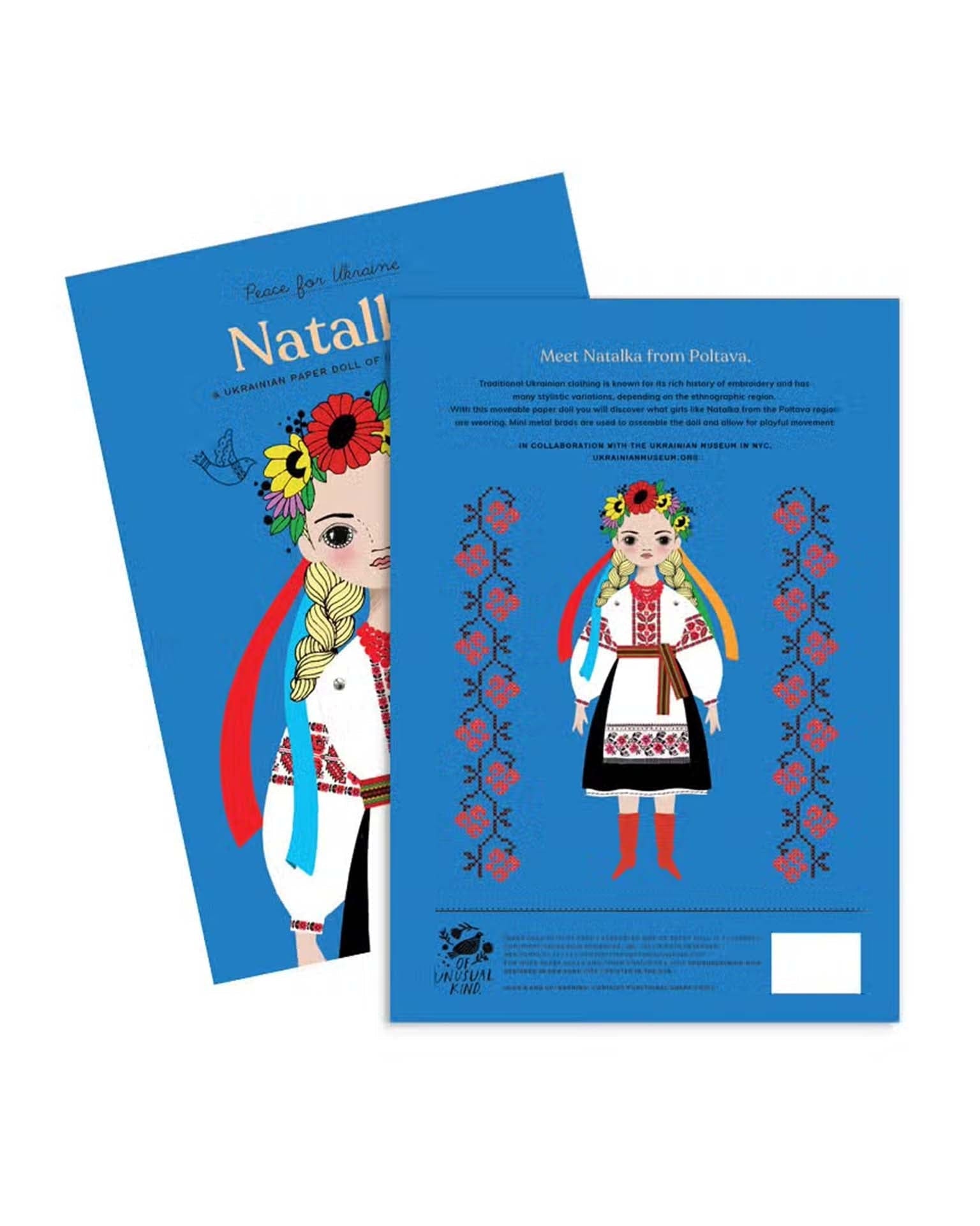 Meet Natalka from our “Peace for Ukraine” Collection that we created in collaboration with the Ukrainian Museum in NYC. This paper doll accordion card measures 6”x 8.5” and unfolds to reveal 4 panels. Pop out the paper doll parts. Assemble the doll with the enclosed assembly instructions and mini metal brads. Learn about the traditional Ukrainian dress Natalka is wearing.
