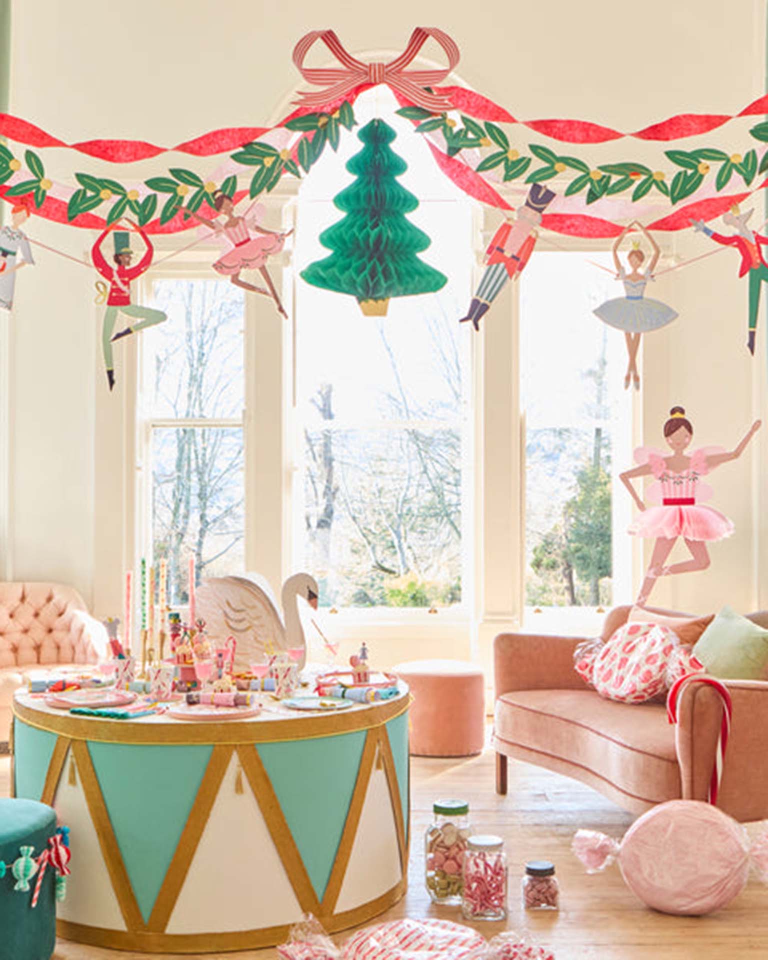 Enchanted by the Nutcracker Ballet? Then this show-stopping garland is a must for your Christmas decor! It features elegant dancers alongside a 3D honeycomb tree, with paper streamers and foliage, and a chic striped bow topping the scene, for a statement effect. Classic Christmas colors of red and green team beautifully with pink and blue to create a modern aesthetic. Whether styled as a striking centerpiece, or as an eye-catching accent, this will captivate and delight all who see it. Reuse year after year for instant joy.