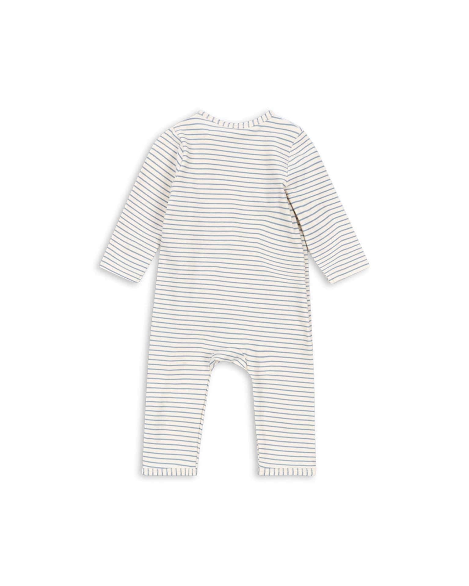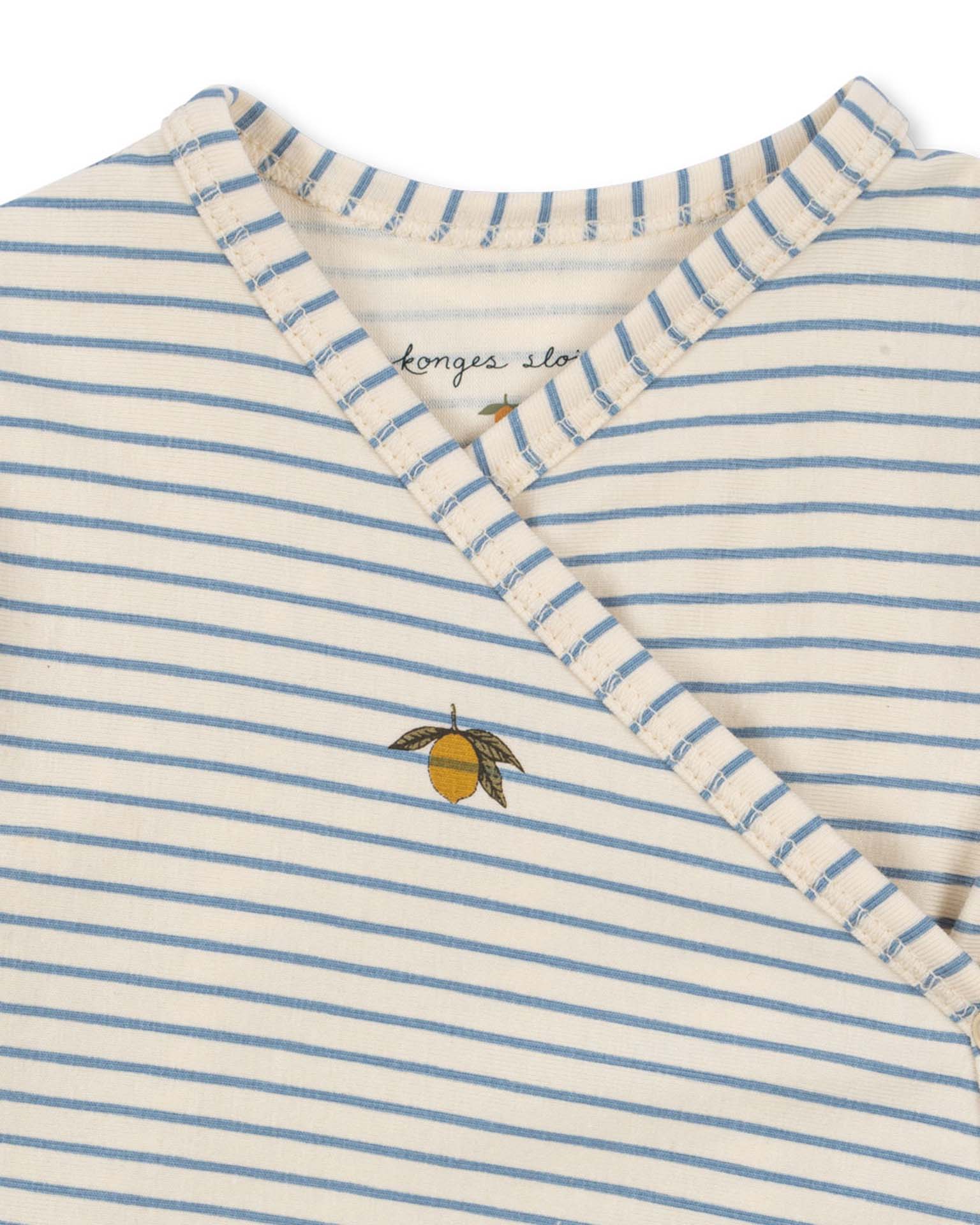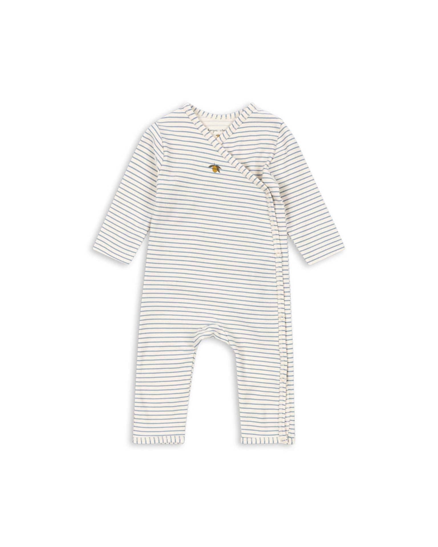 Soft onesie for newborns in a light cotton blend with a hint of stretch. Designed with a wrap closure that features snap buttons along the body and legs for easy dressing.