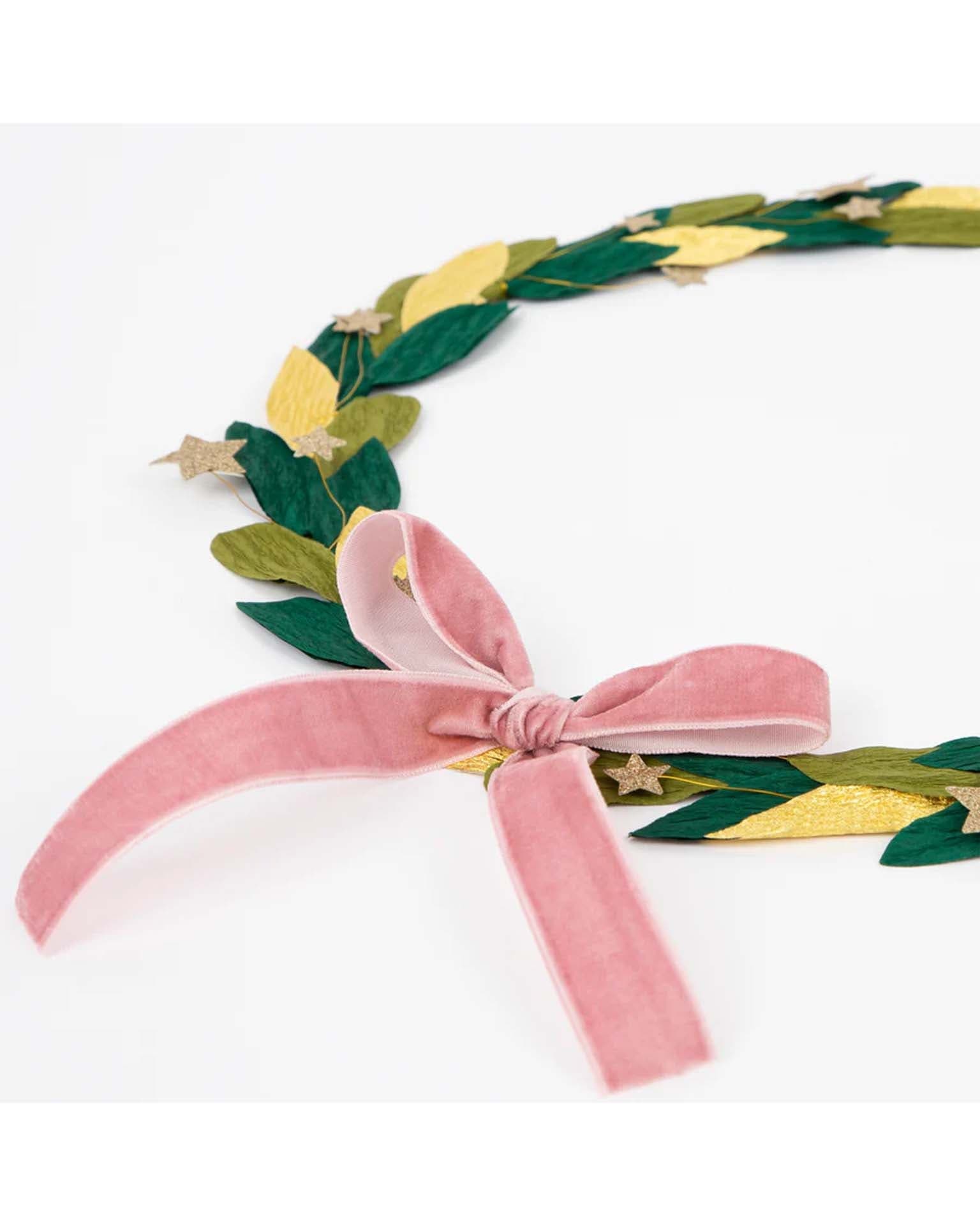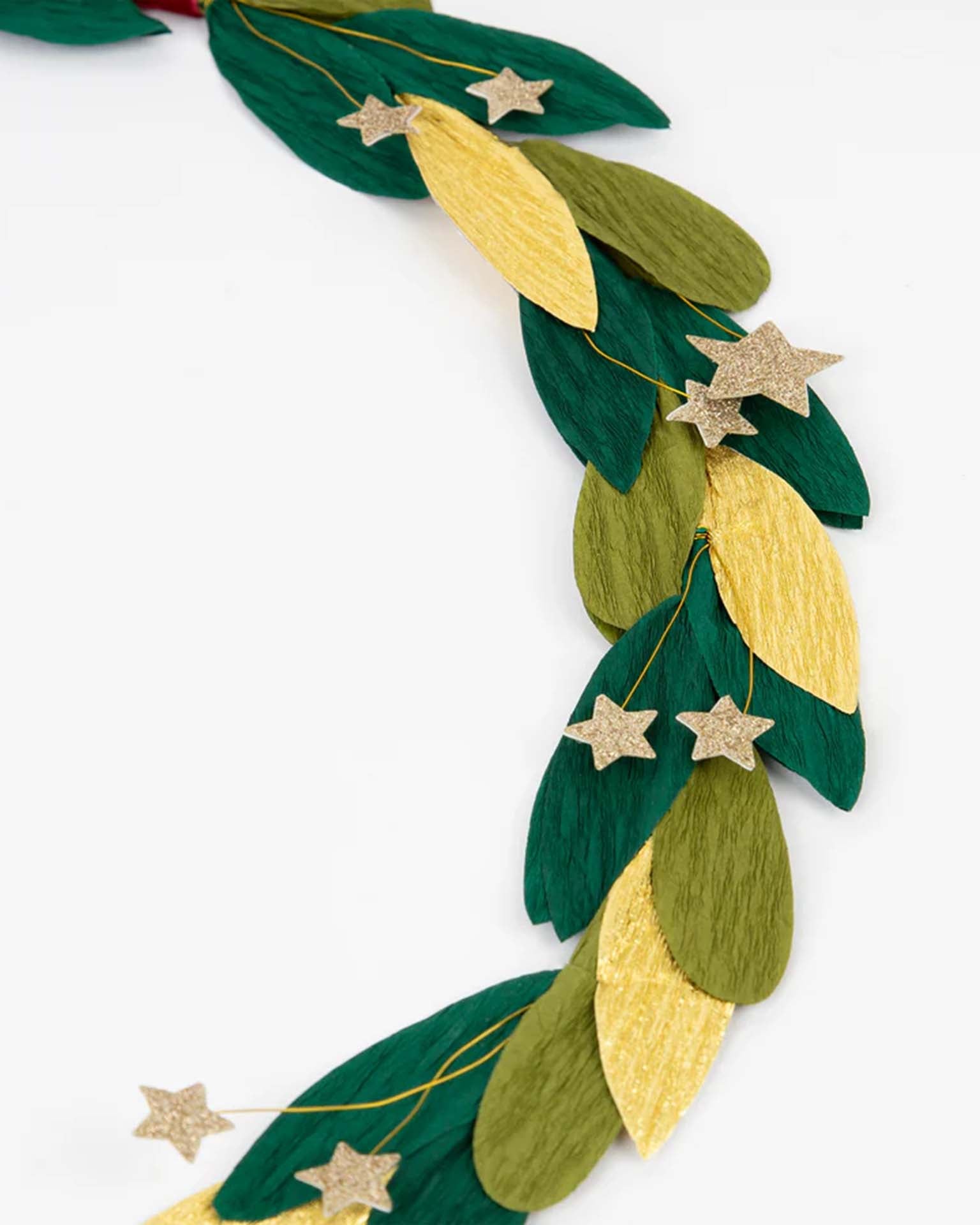 - Paper leaves crafted from crepe paper in mid green, dark green and metallic gold