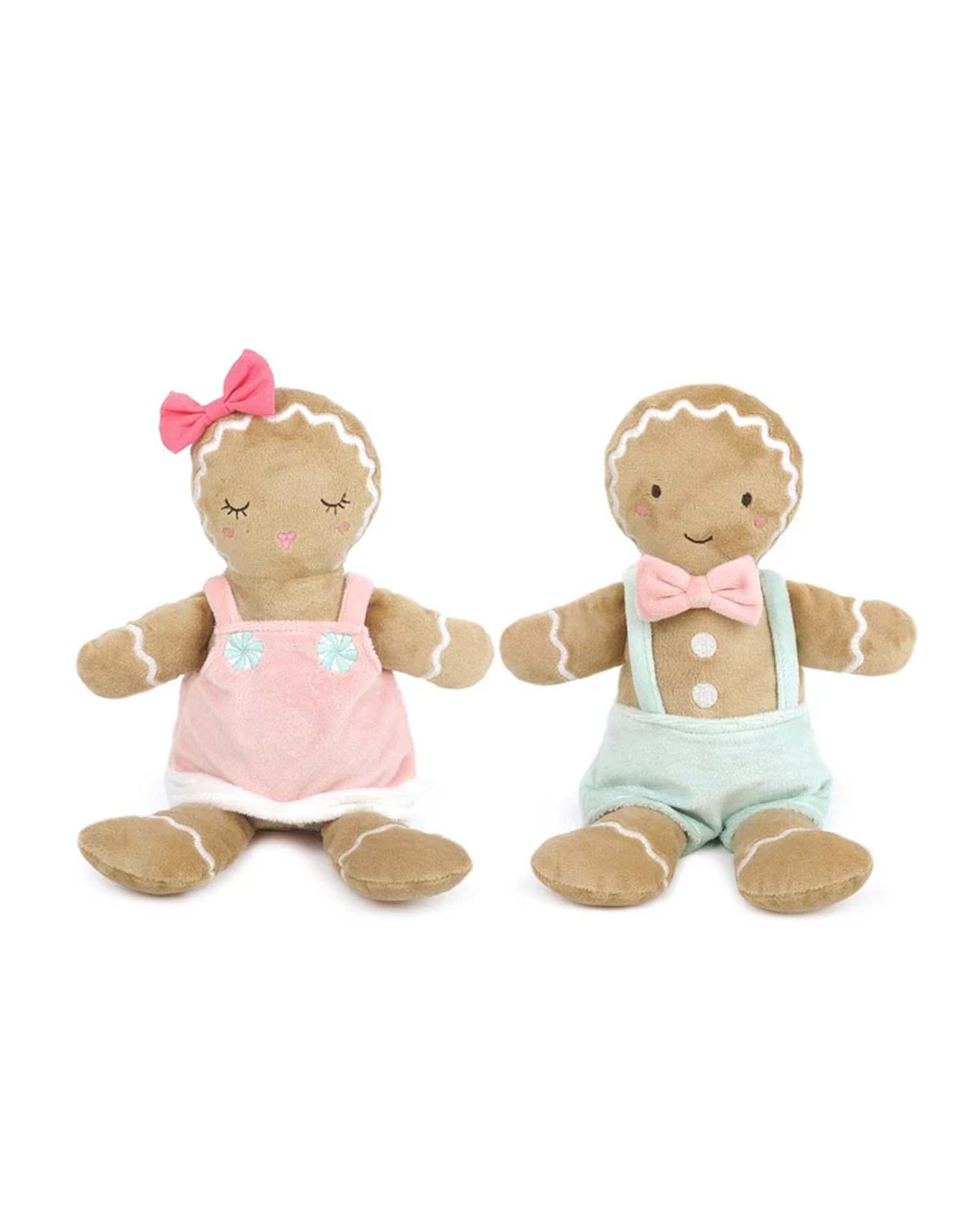 Meet the cutest gingerbread couple you'll ever see, brought to life in soft, huggable plush! Dressed in cozy pastels, these gingerbread friends are ready to sweeten any holiday season. The girl wears a lovely pink dress adorned with mint-green embroidered "buttons" and a matching pink bow on her head, with embroidered lashes and rosy cheeks giving her a delicate charm. Her companion sports a mint-green overall with a matching pink bow tie and embroidered button accents, all topped off with a sweet smile. These plush gingerbread pals are perfect for holiday decor, cuddles, or as whimsical gifts that spread joy year-round!