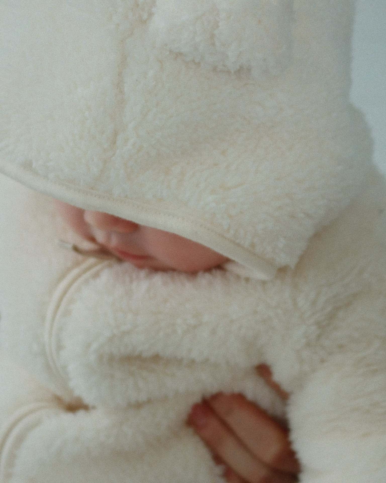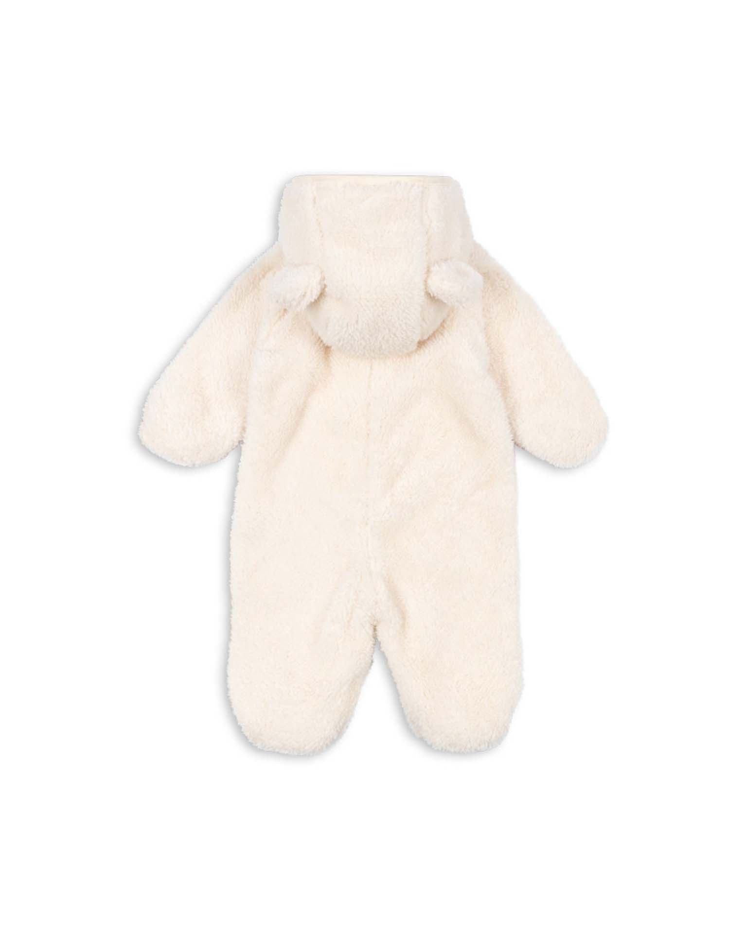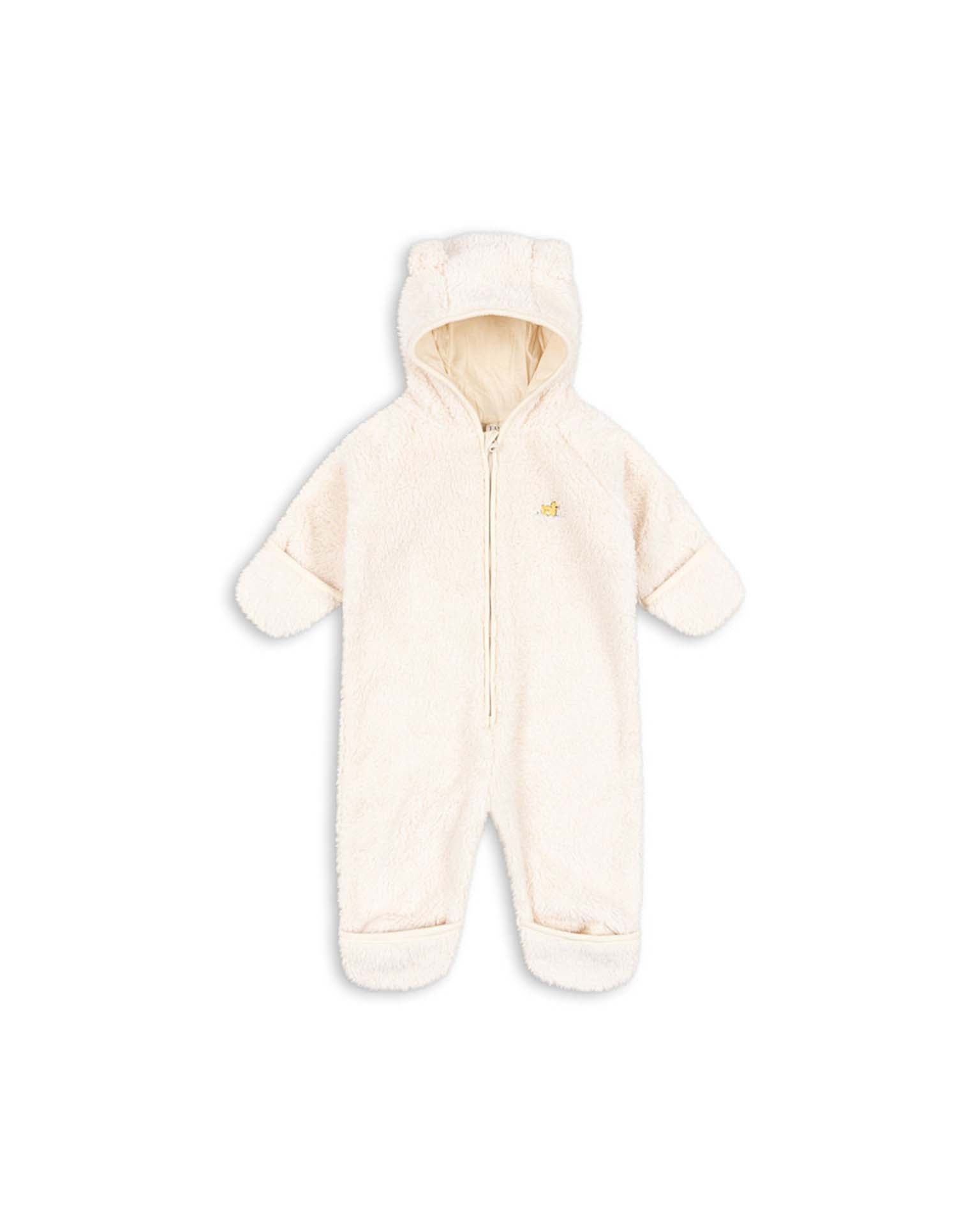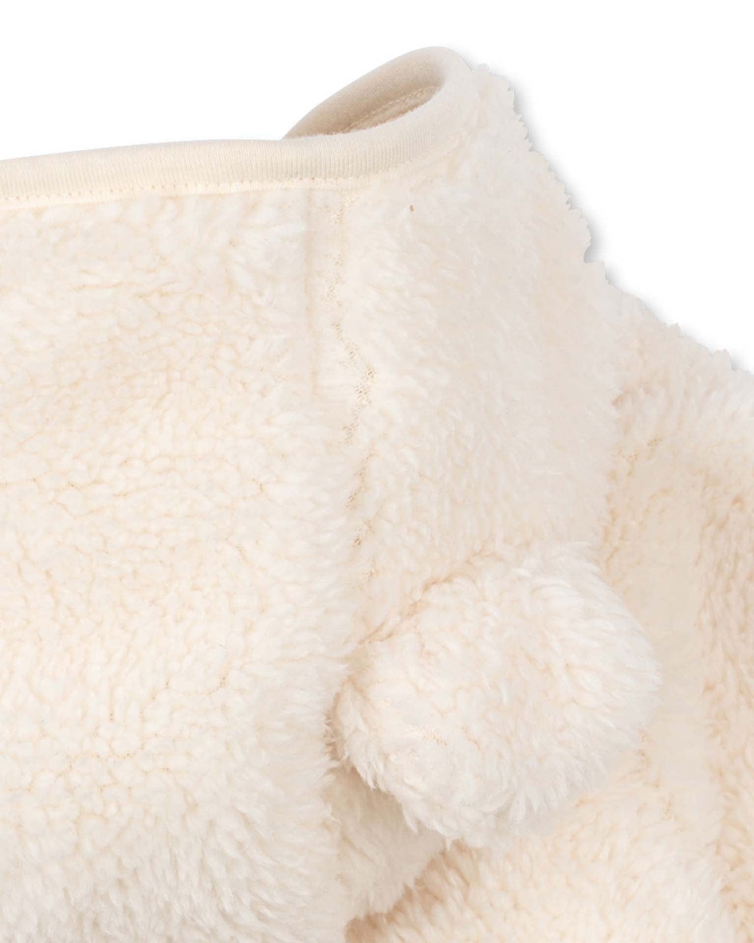 Soft and fluffy onesie that is perfect for keeping little ones warm during nap time. Designed with a soft hood with little bear ears on top, a full zipper closure in front, and a convenient fold-up feature for hands and feet.
