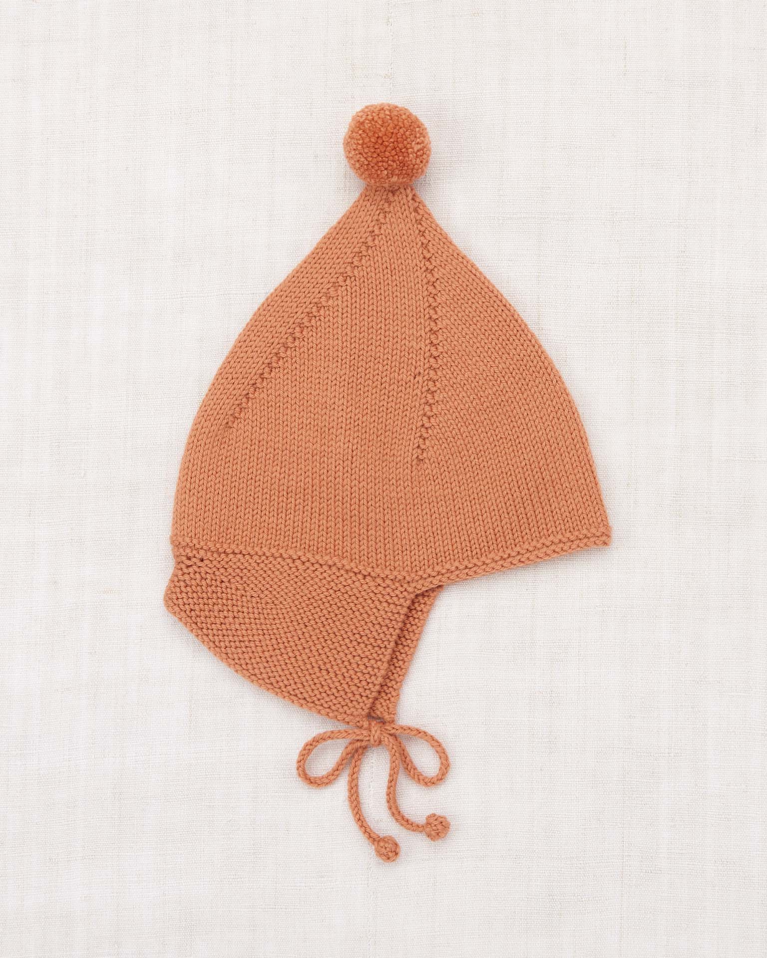 A hand-knit hat in Merino wool, with ear flaps, a stand-up pointy pom-pom top, and popcorn tie closure for a secure fit.