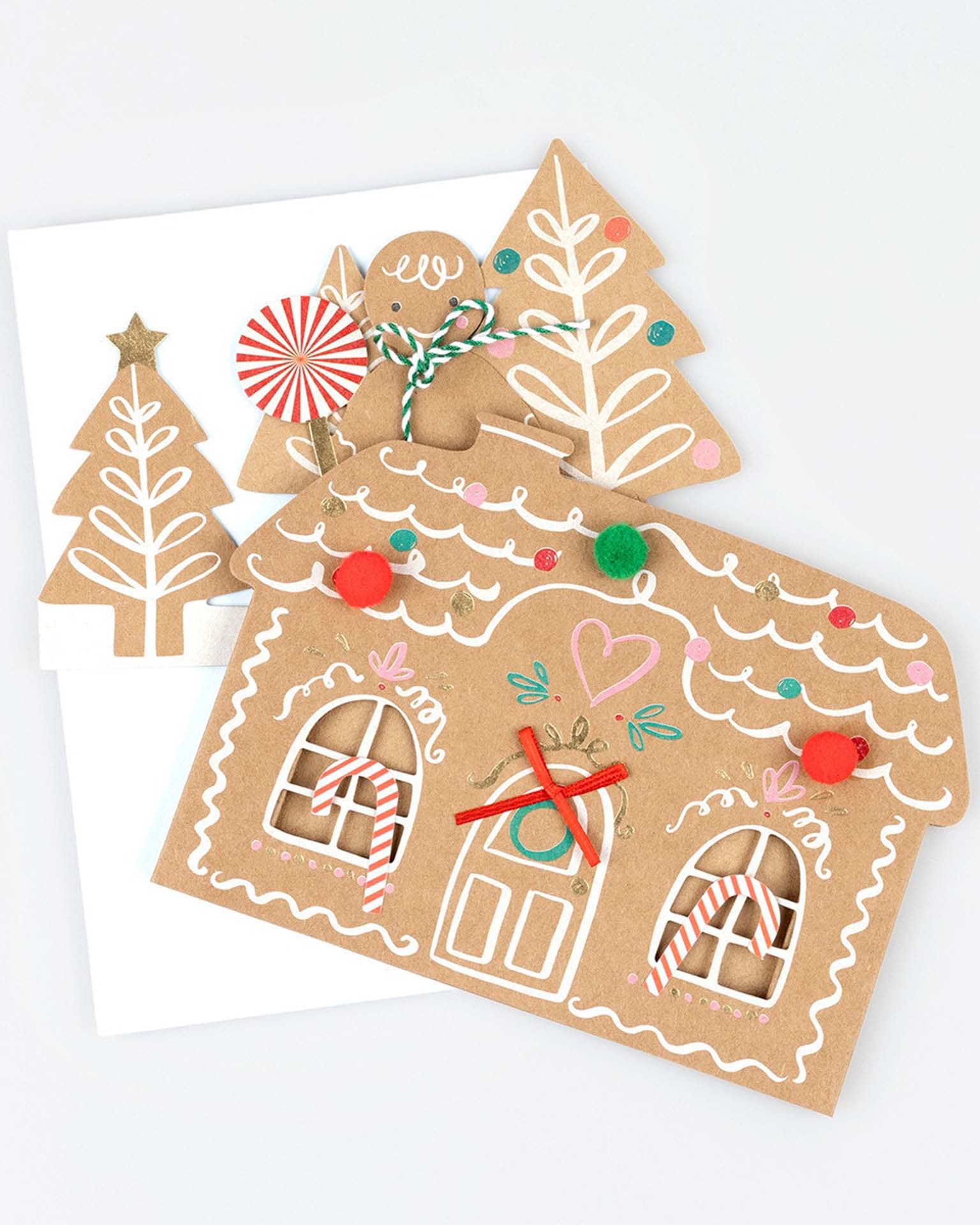 Gingerbread is still having a moment! This beautifully designed pop-up card is a charming way to send festive cheer and give a joyful Christmas mantel decoration! Featuring a gingerbread house, person and trees, with fun embellishments of pompoms, ribbon and twine bows, paper candy canes and shiny gold foil, it's guaranteed to delight everyone who sees it. A keepsake they'll treasure long after the season is over.