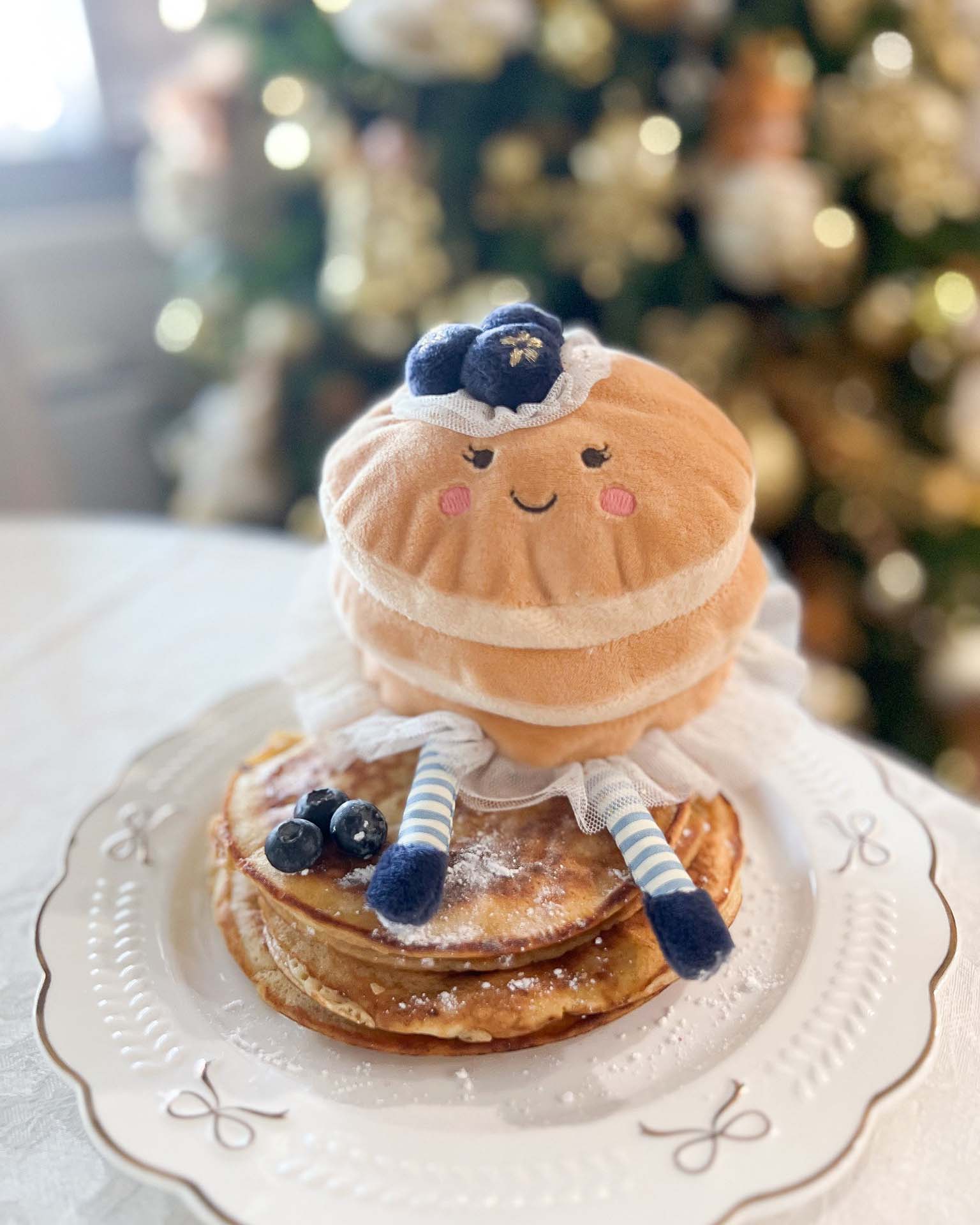 Stacked with sweetness and topped with charm, Pretty Pancake is here to flip your day into a cozy delight! With its soft golden layers, fluffy white tulle trim, and a crown of plush blueberries, this breakfast-inspired beauty is simply irresistible. Her blushing cheeks and cheerful smile add a sprinkle of whimsy, while her striped legs give her an extra dose of playful flair. Perfect as a gift or an adorable decor accent, Pretty Pancake serves up style, snuggles, and endless smiles!