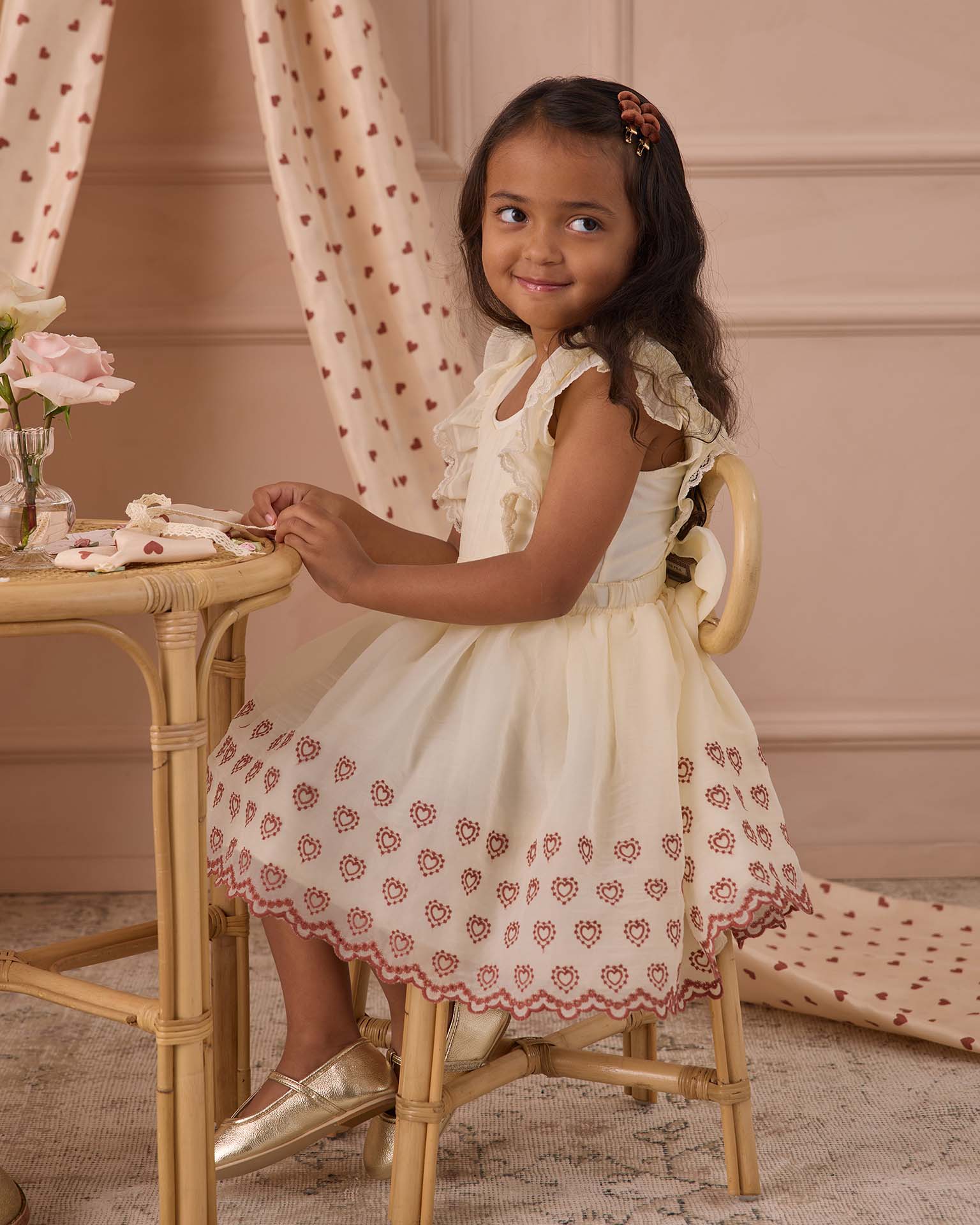Heart embroidery, flutter cap sleeves, a full organza skirt, and button enclosure come together to make this dainty vintage-inspired pinafore dress. Matching cap sleeve bodysuit included.