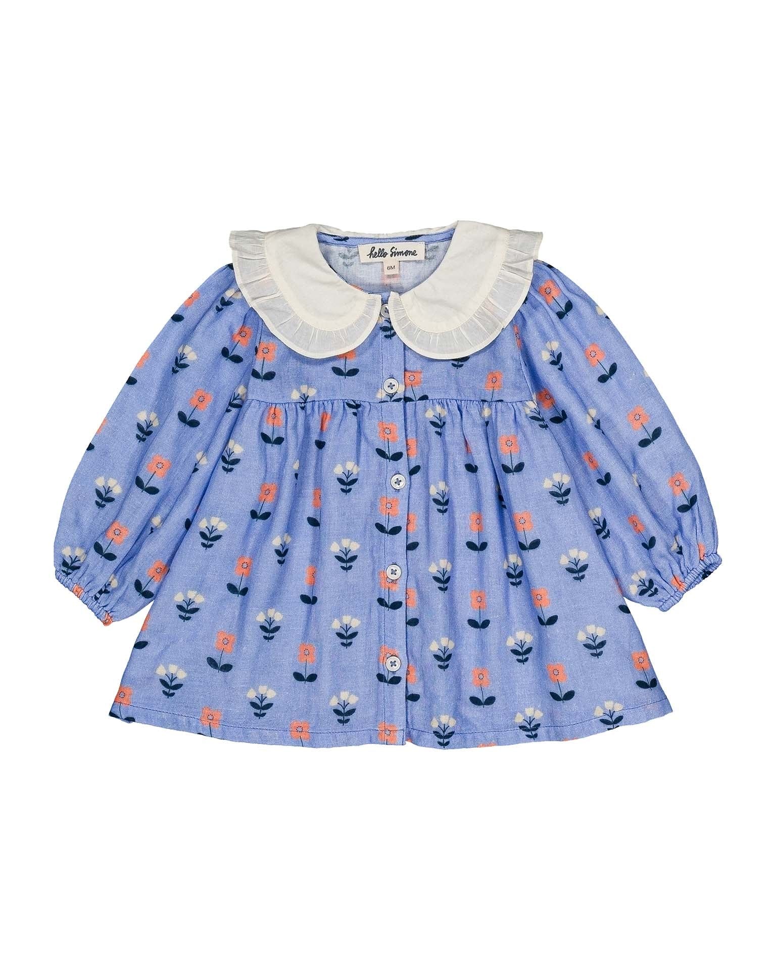 The prunette baby dress from Hello Simone features a contract collar and buttons up the front. Billowy sleeves and a relaxed fit, this dress is darling for your little one. Pair it with tights for cooler days.