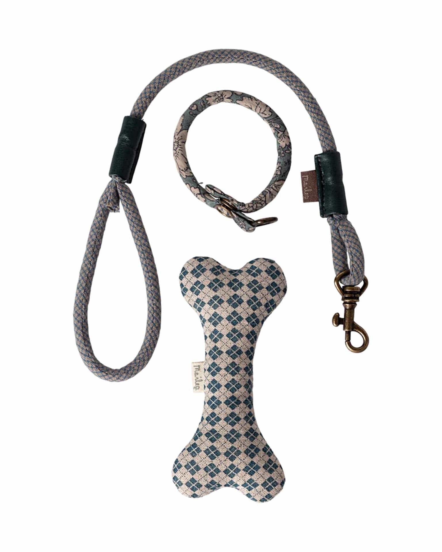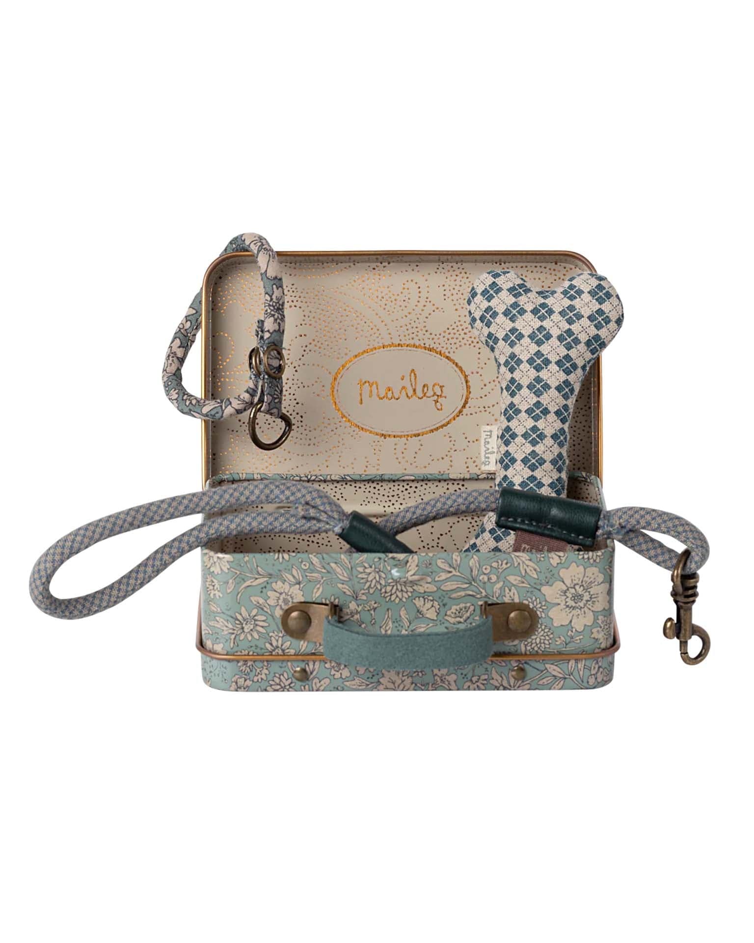 This set is all you need for your soft plush dog. The set includes a bone, collar and leash packed nicely in a metal suitcase with a beautiful Maileg print.