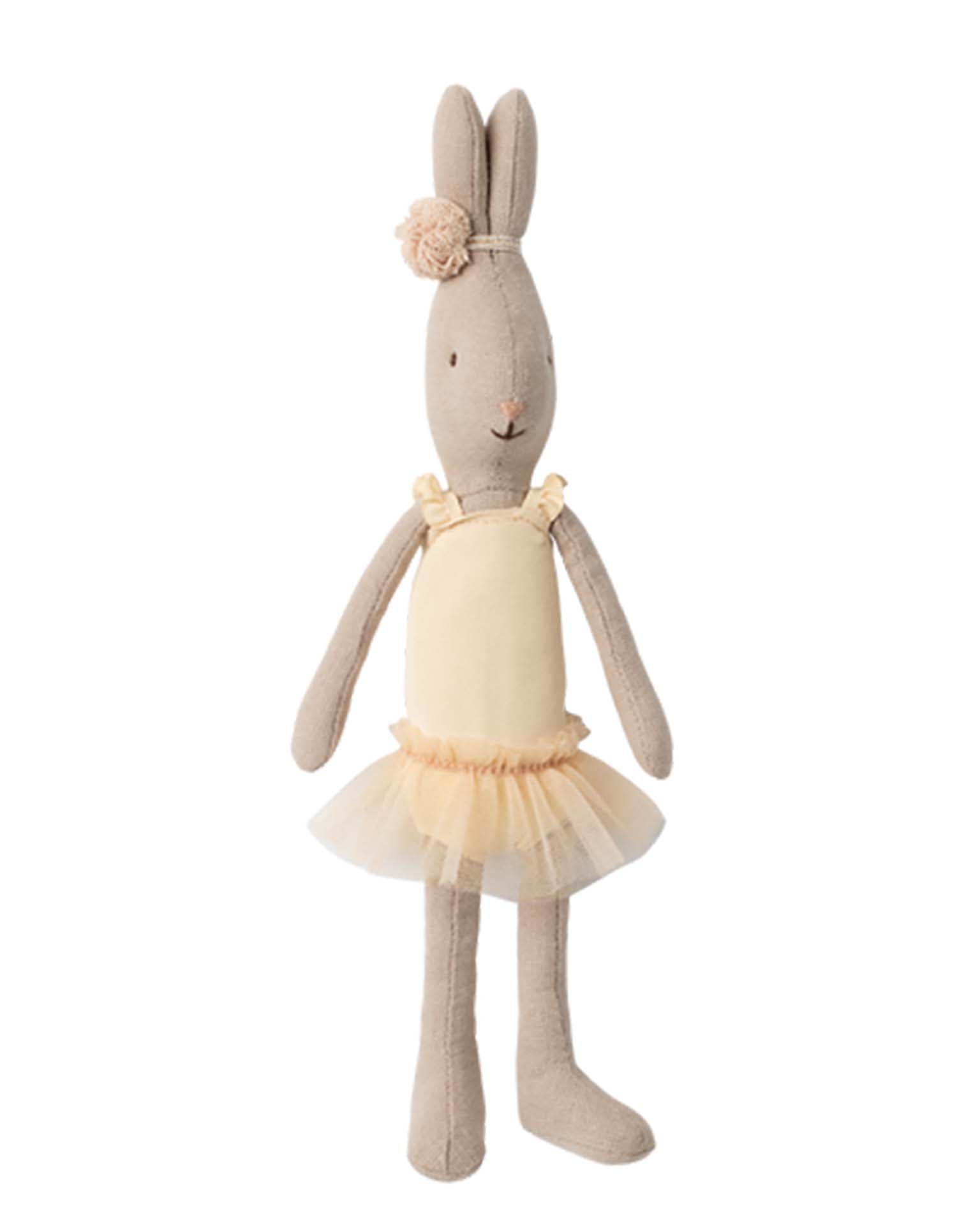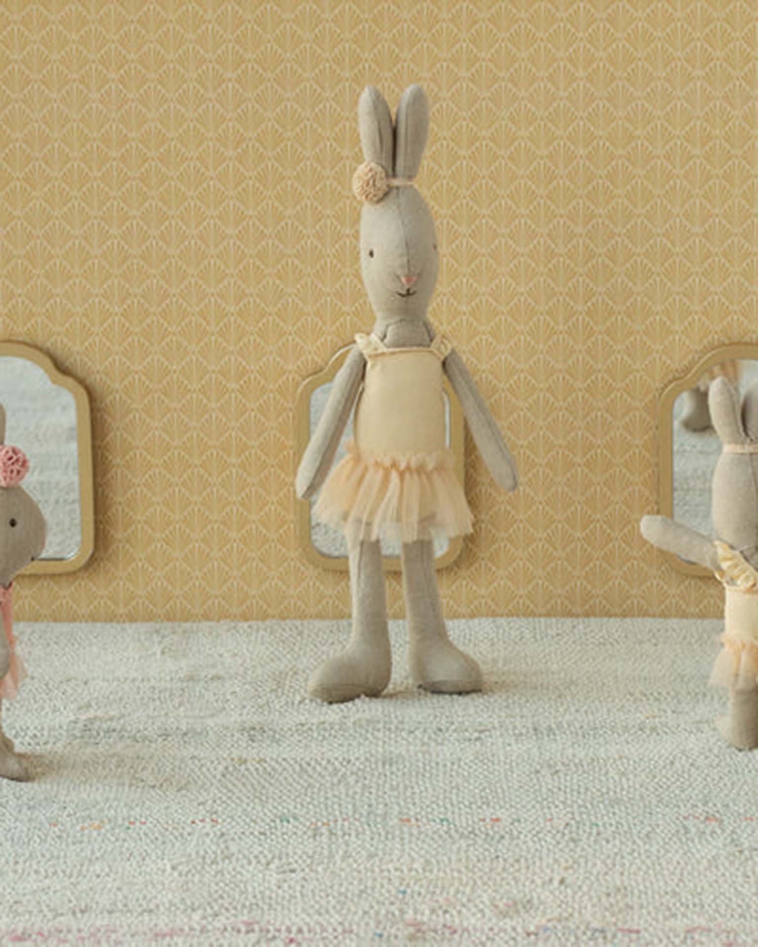 The well-known Maileg micro bunny dressed up as a ballet dancer. It wears a suit and tulle skirt and has a small decoration around the pointed ears.