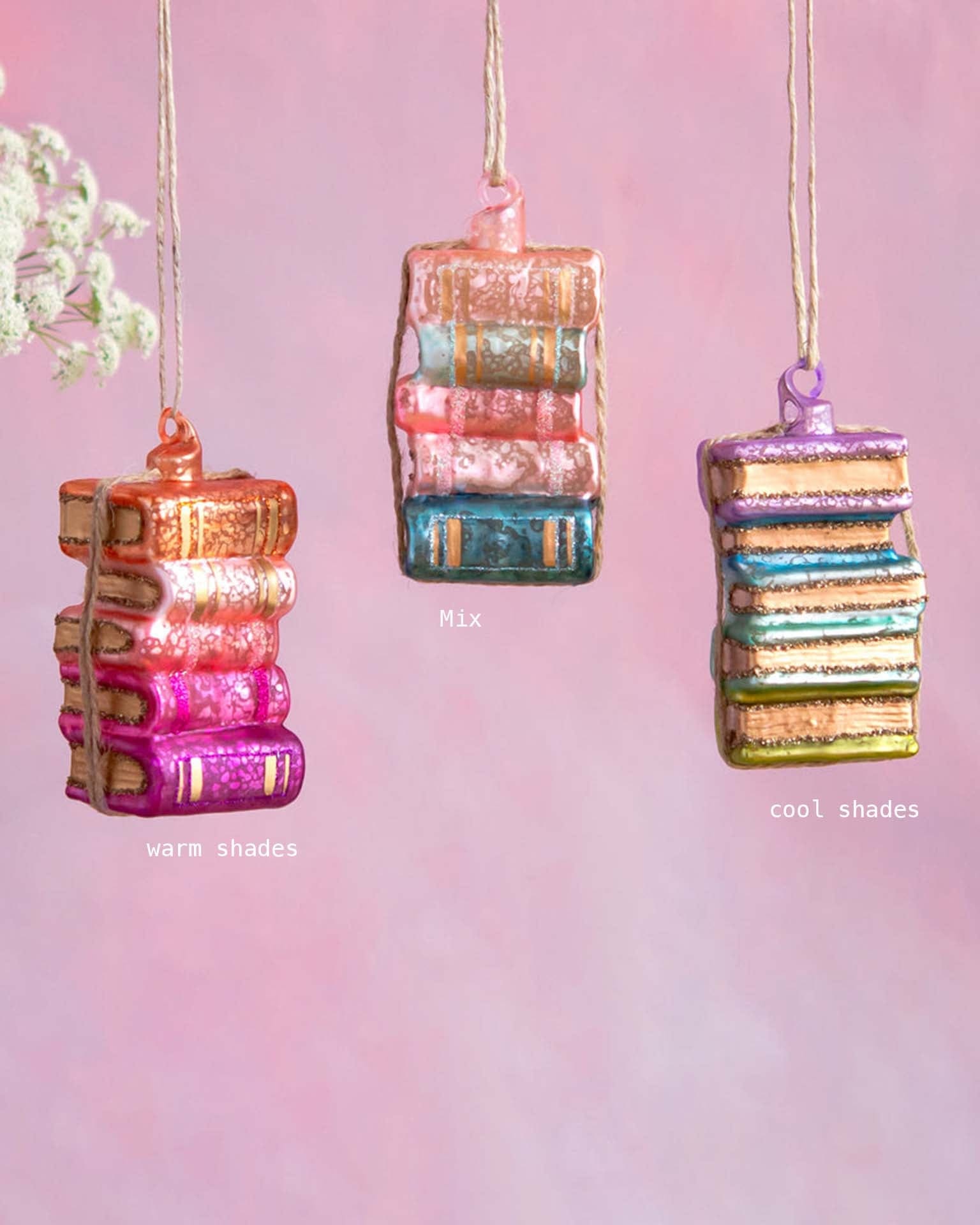 This beautiful glass ornament is perfect for the bookworm in your life. The three color combinations look gorgeous on their own or all together as a set. Just a touch of glitter to add a little shimmer.