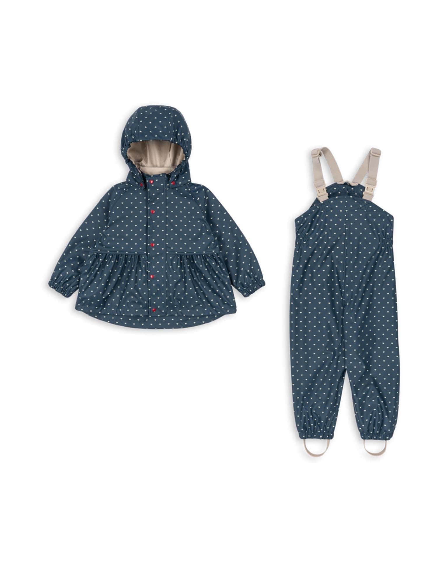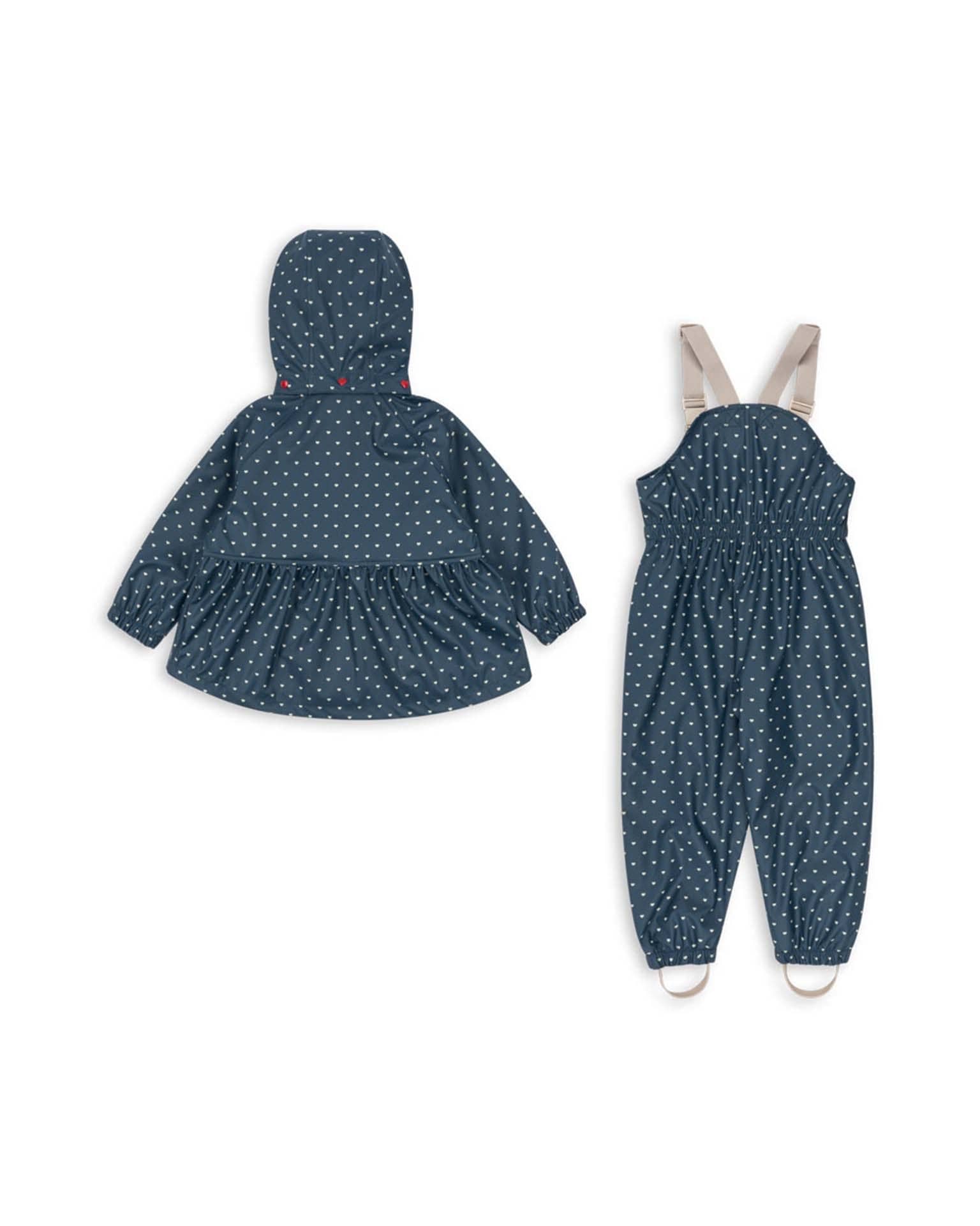 Wind-resistant and waterproof PU rain set for functional everyday wear. Features essential detailing like a lined, detachable hood, elastic cuffs, and welded seams for complete protection against the elements. Please note: Up to size 4 years, all rain pants are designed with suspenders. For sizes 5-6 years and up, rain pants feature an elasticated waist – easy to pull on and off.