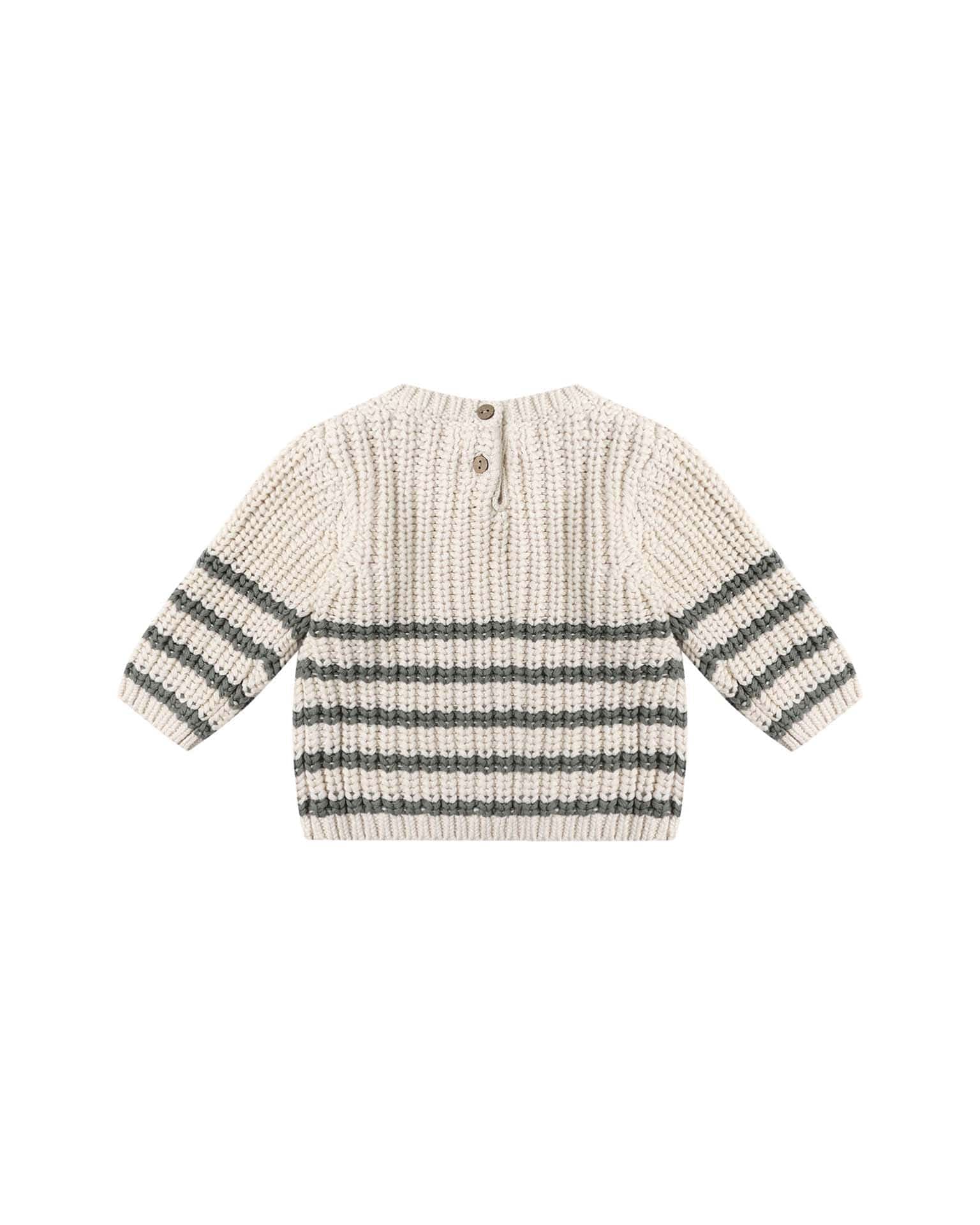 Cozy and chunky, our Rex Sweater features ribbing at the neck, cuffs, and hem, plus a back button placket for easy changing.