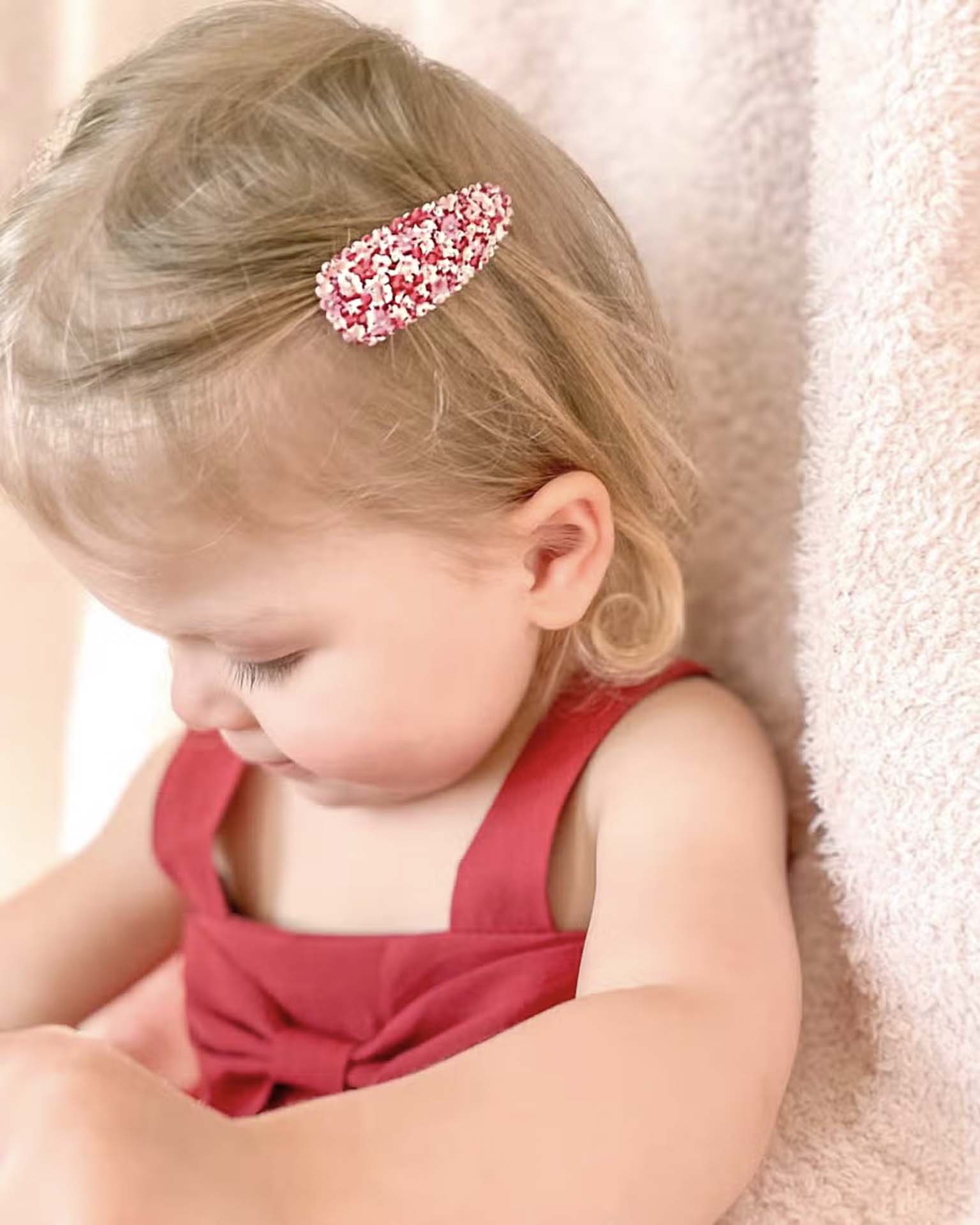 A beautiful set of fabric covered snap clips featuring a scalloped edge detail. Soft, comfortable and easy to wear. Our pretty hair clips are perfect for any age from toddler to adult. This hair clip set features beautiful high quality fabric.
