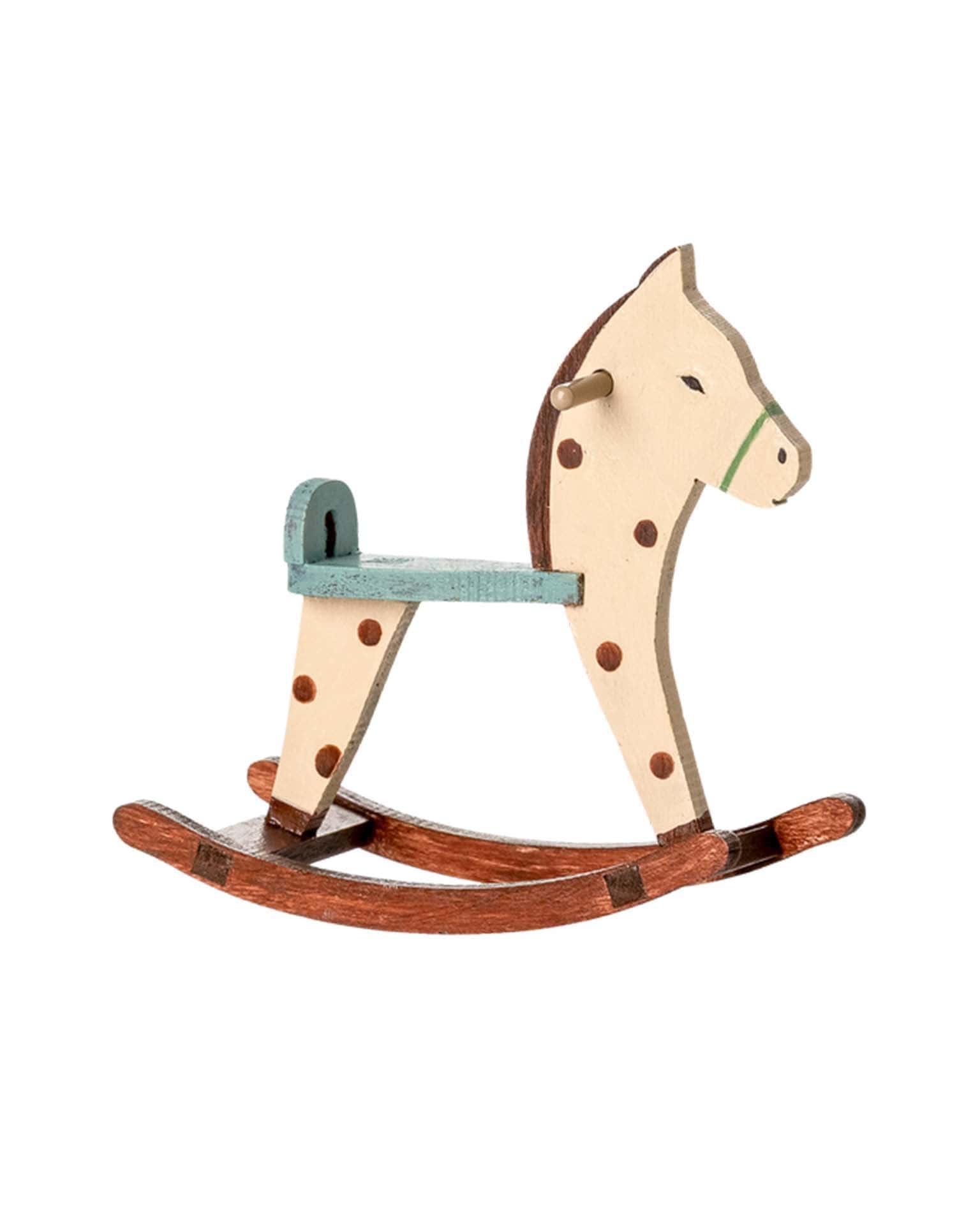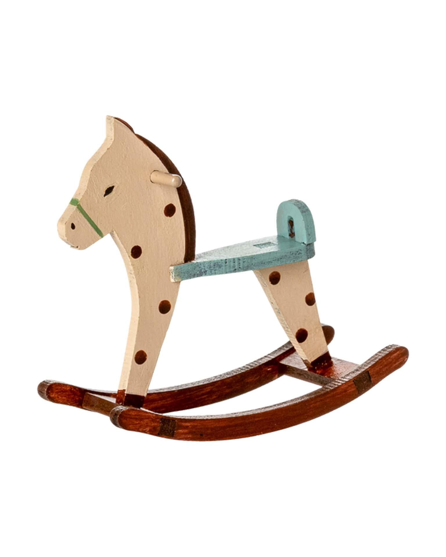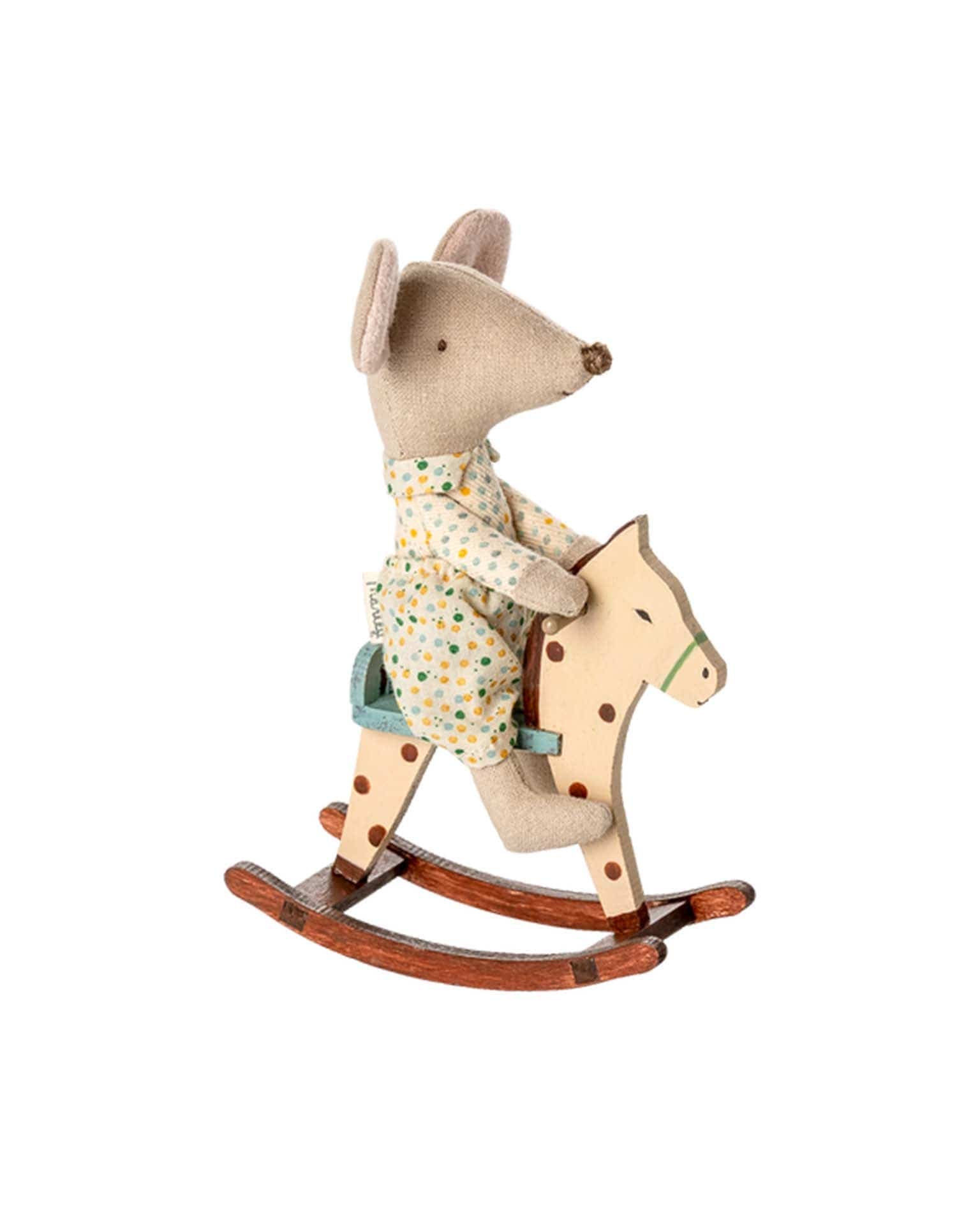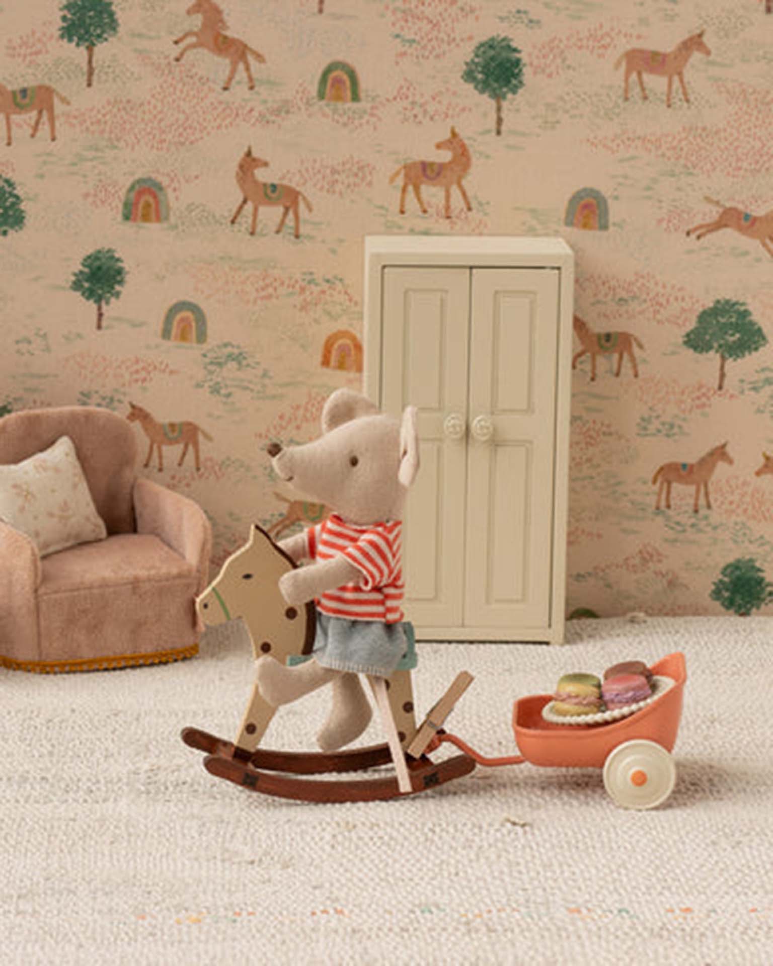 This wooden rocking horse is a must have for all playful mice. Its metal handles make it easy for mice with magnets in hands to hold on and the small hole for the tail ensures a nice ride. Fits size little- and bigbrother/sister mice.