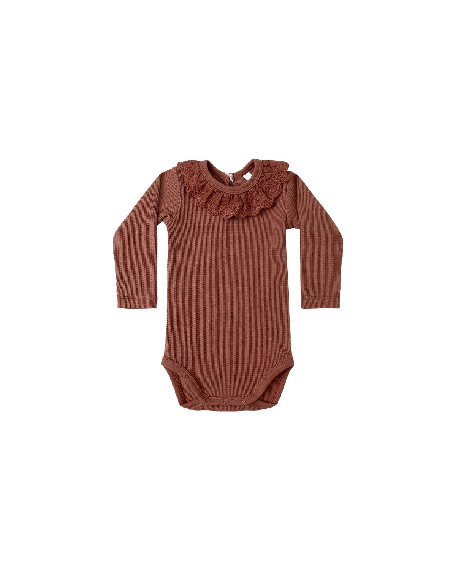 Long sleeve onesie, with a cute ruffled collar. All sizes have snaps at the inseam for easy changing.