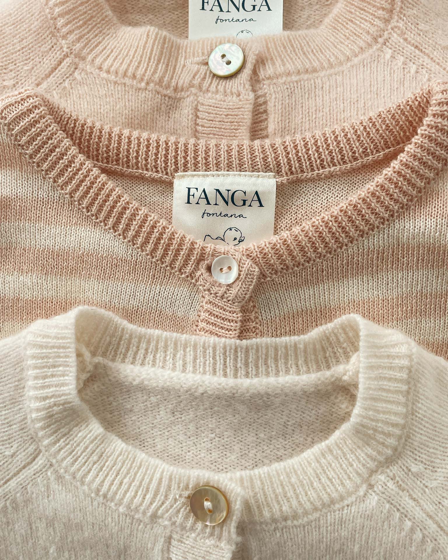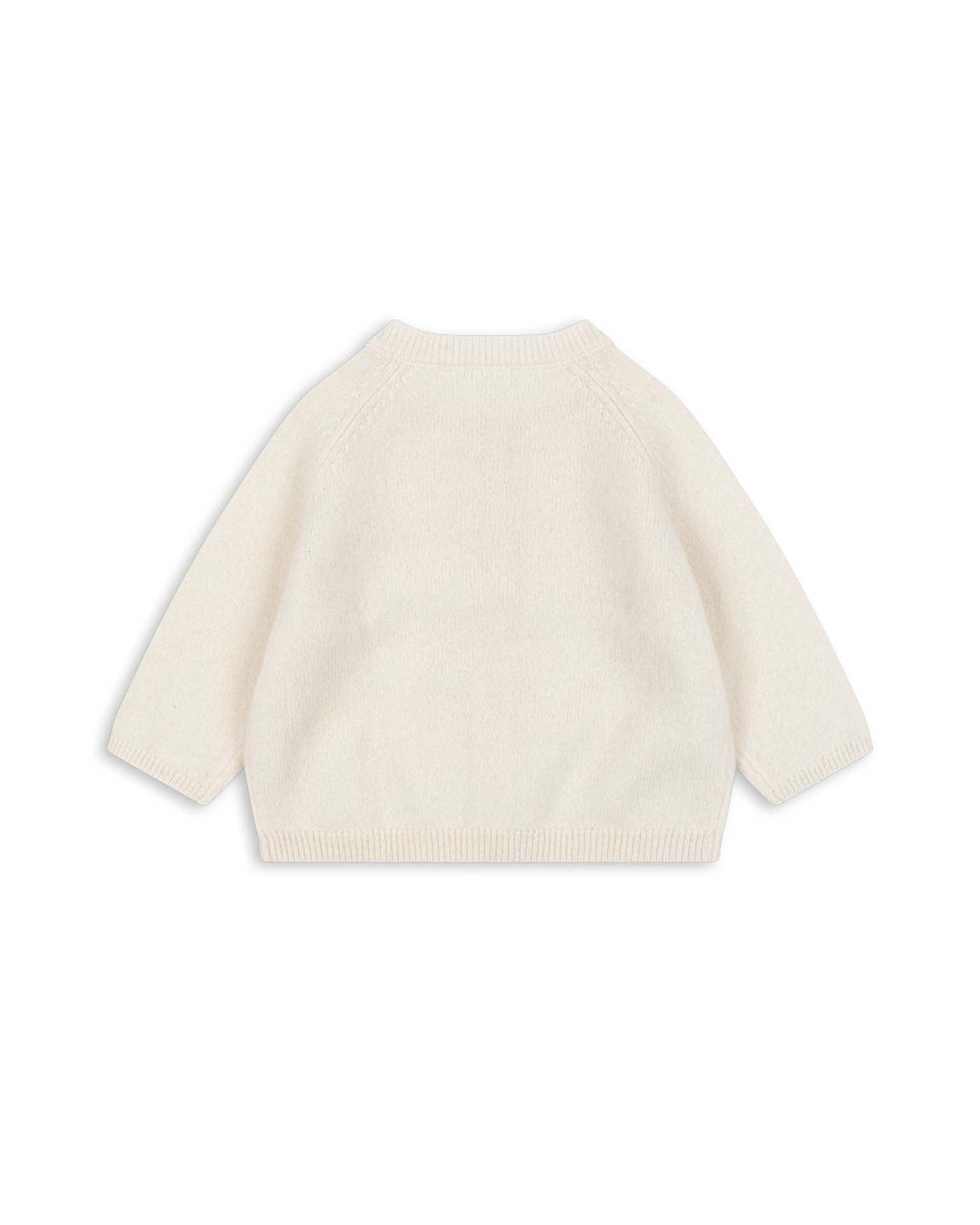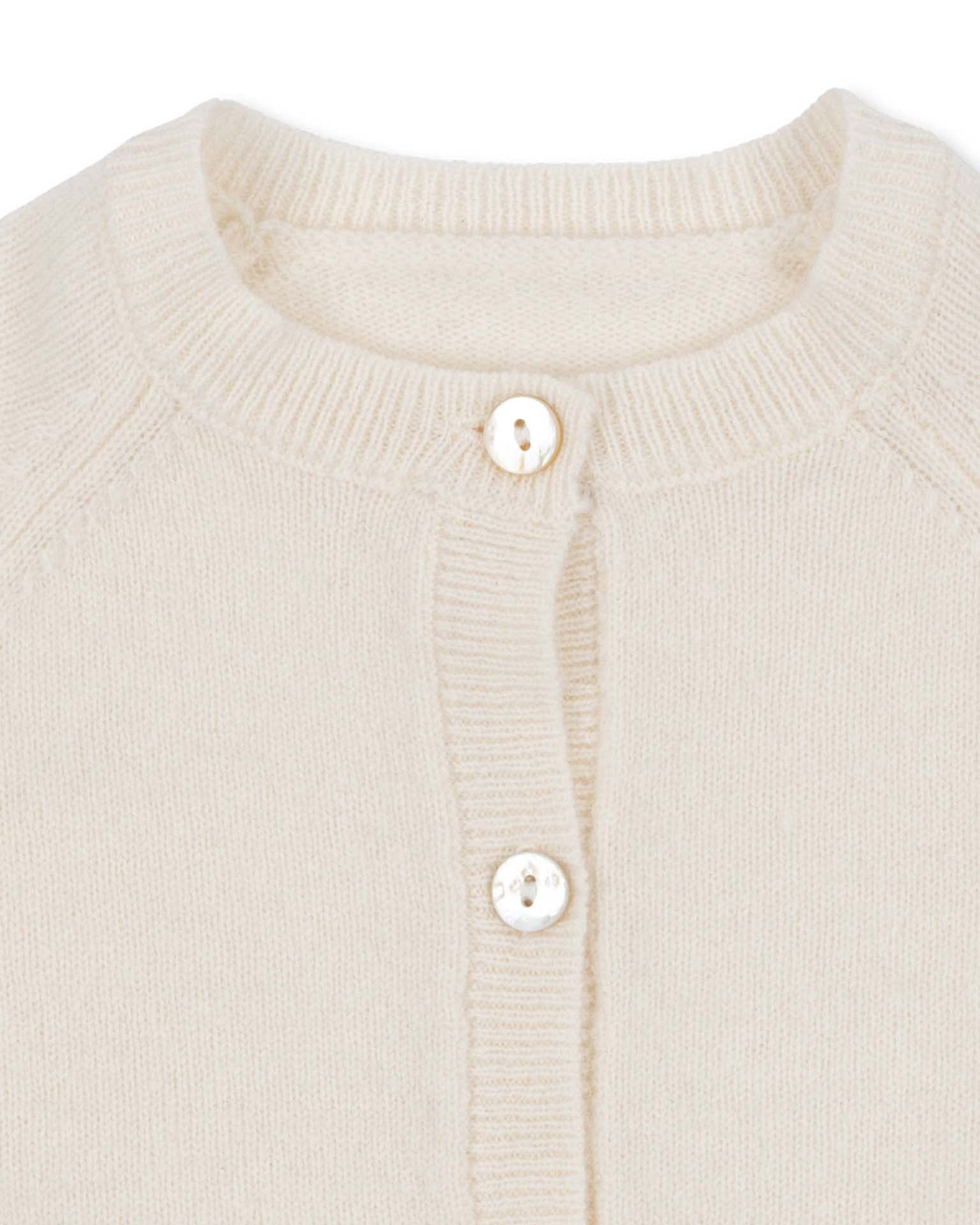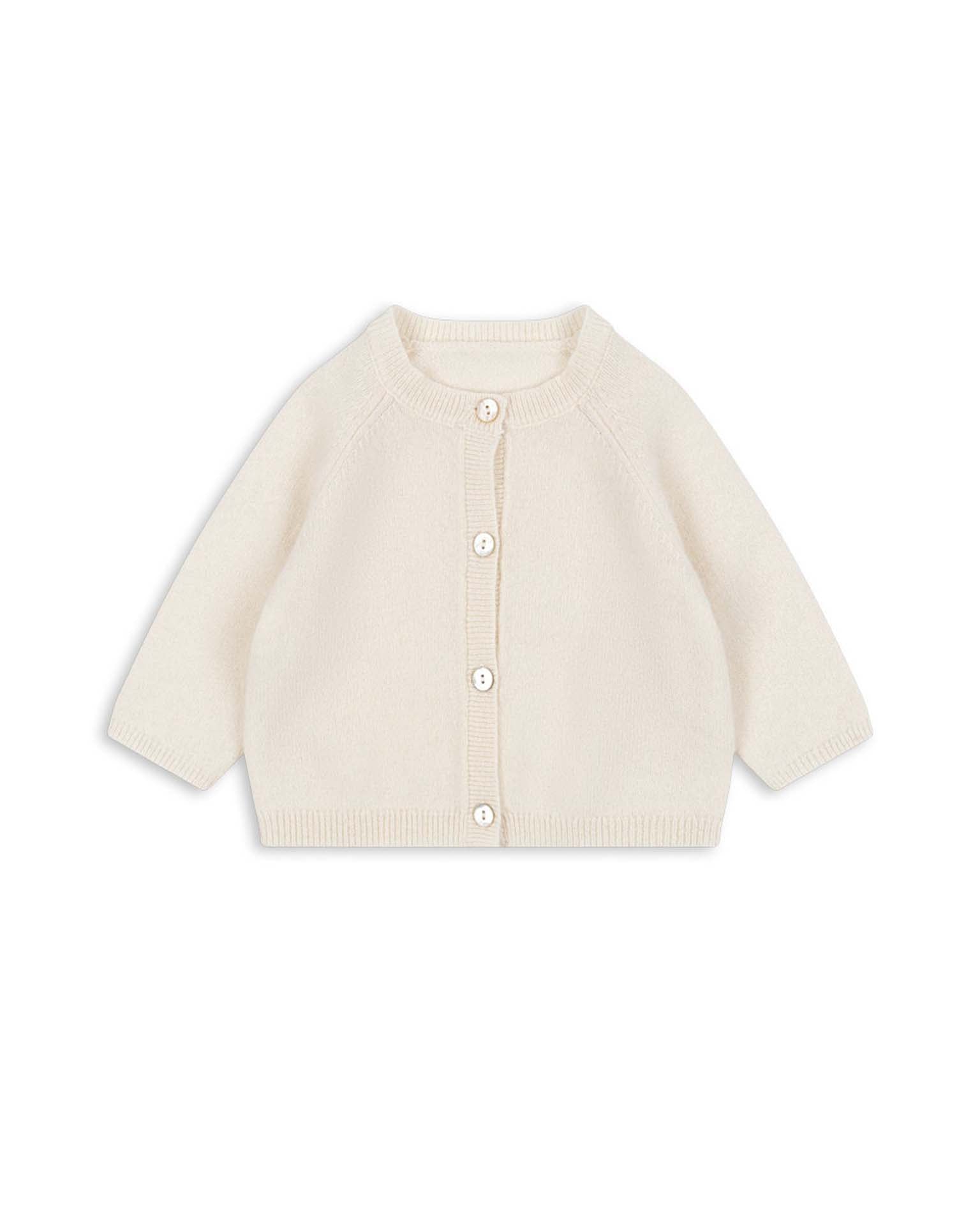 Exceptionally soft and comfy wool cardigan designed with mother of pearl buttons in front, decorative rib hems, and raglan sleeves. The perfect layer to keep your baby warm and comfortable at all times.