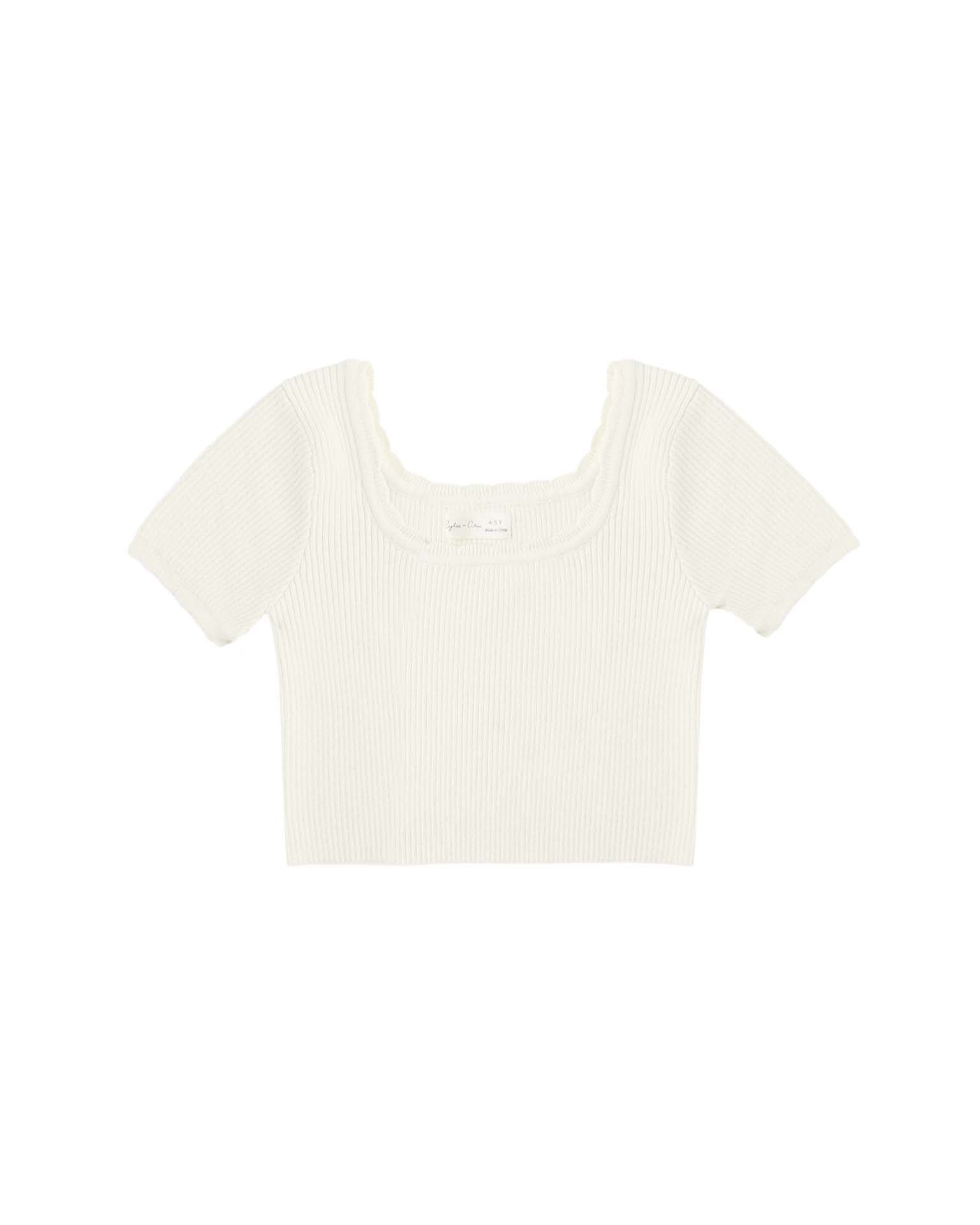 The cropped-fit Scalloped Tee is a versatile fall staple, crafted from delicate pointelle knit fabric and detailed with scalloped sleeves and neckline.